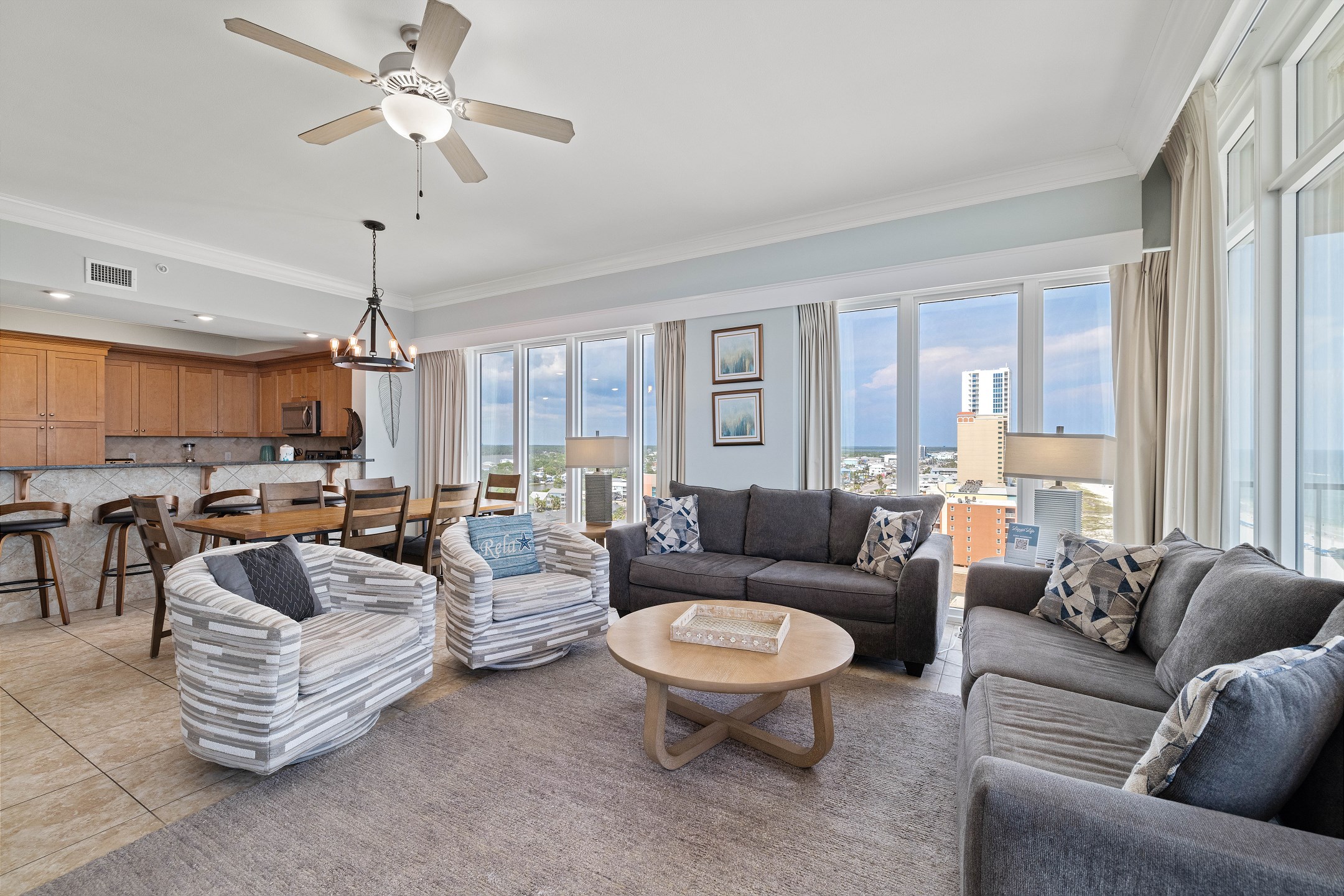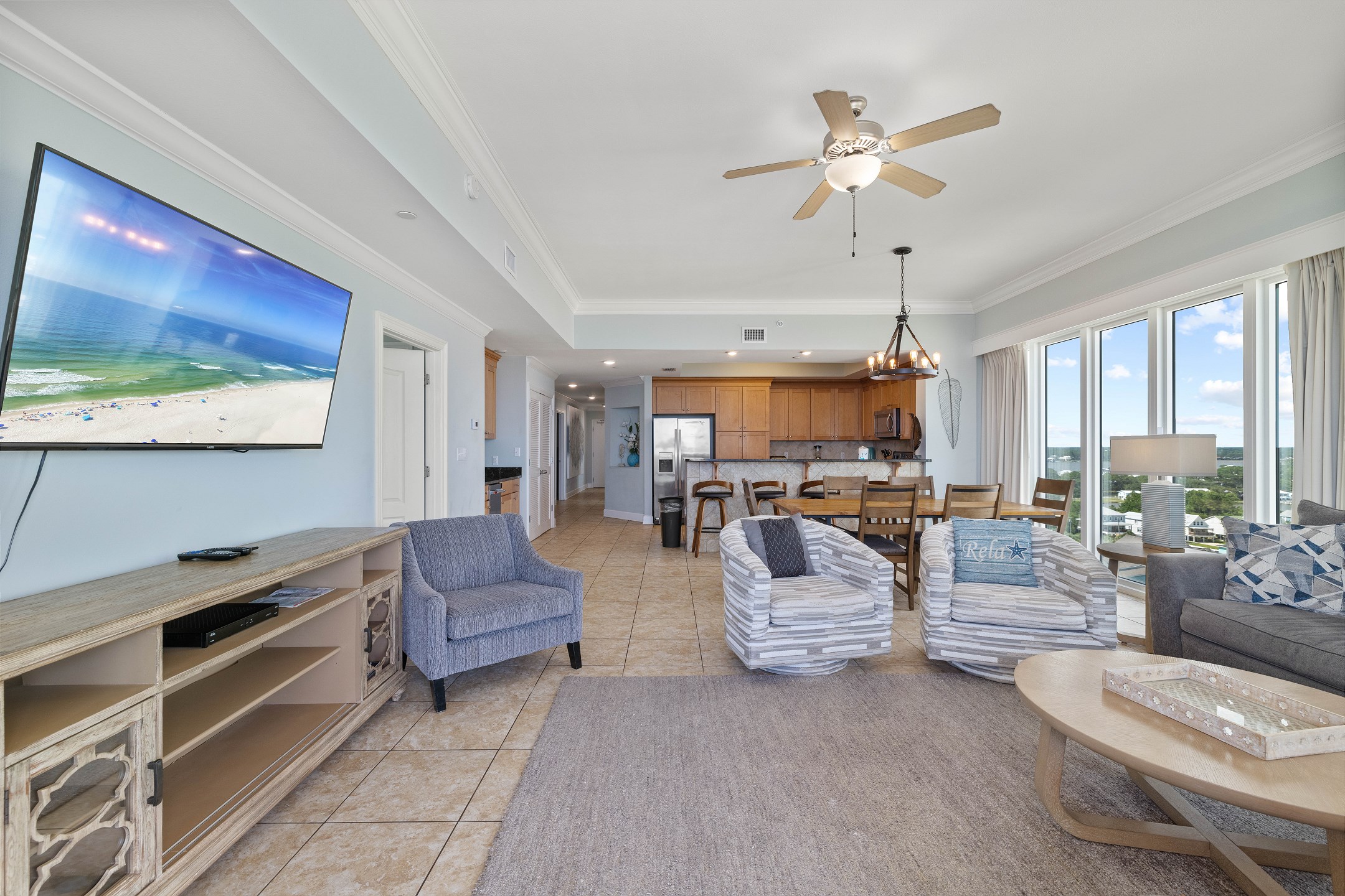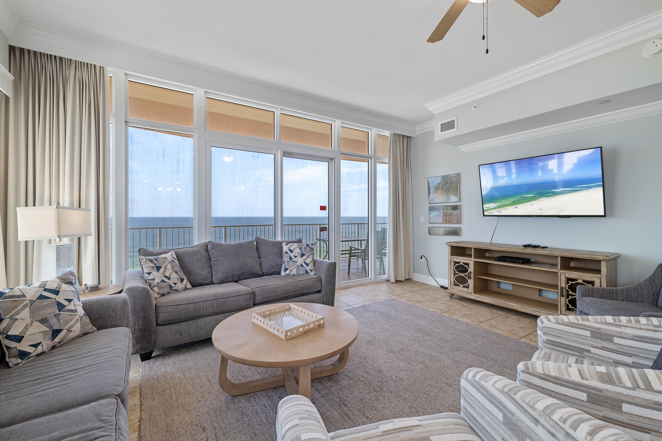 The living room, with its floor-to-ceiling windows, provides breathtaking South and West views of the Gulf. It's furnished with a comfortable sofa sleeper and a grand 70-inch flat-screen TV, making it a perfect spot for group gatherings or movie nights.