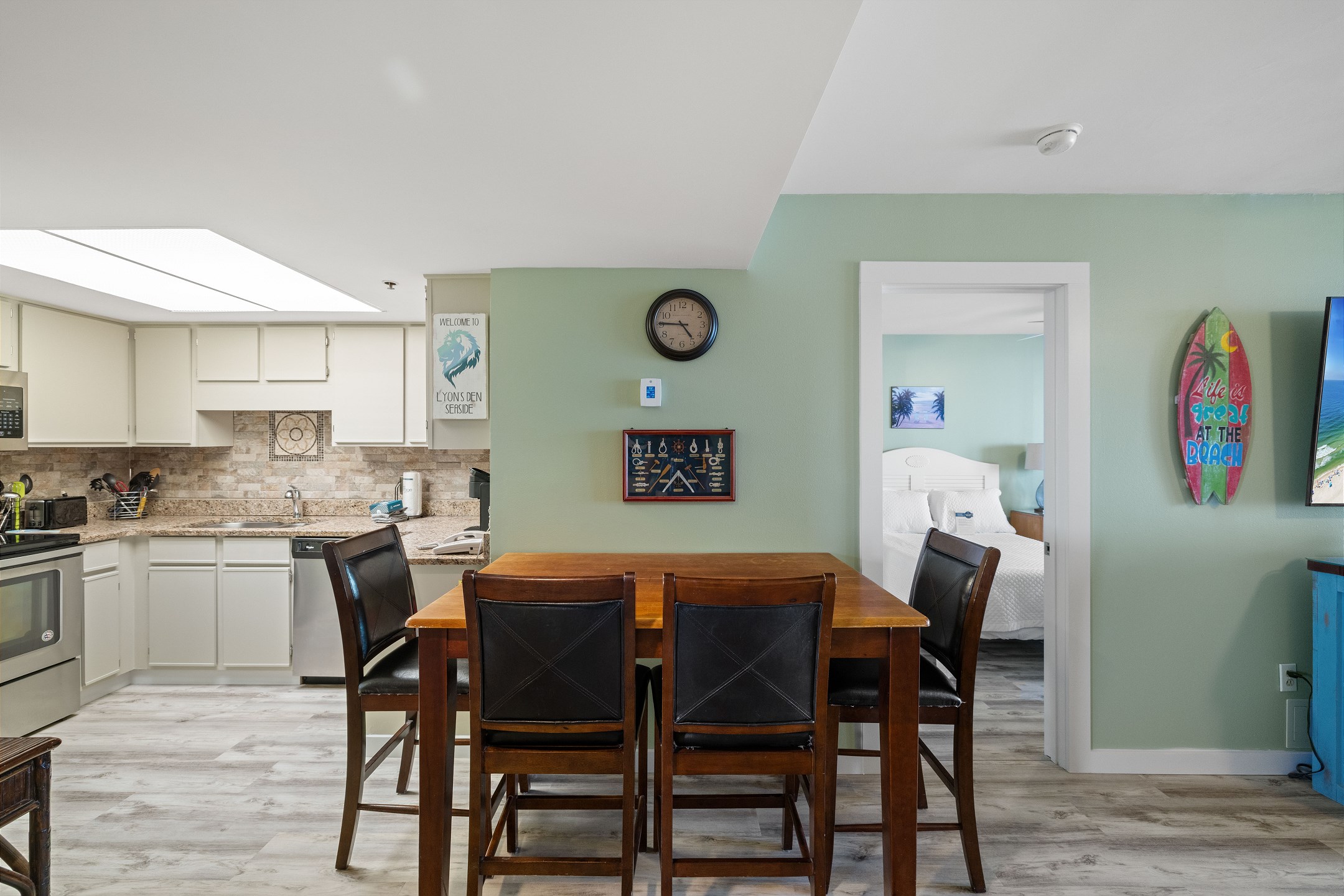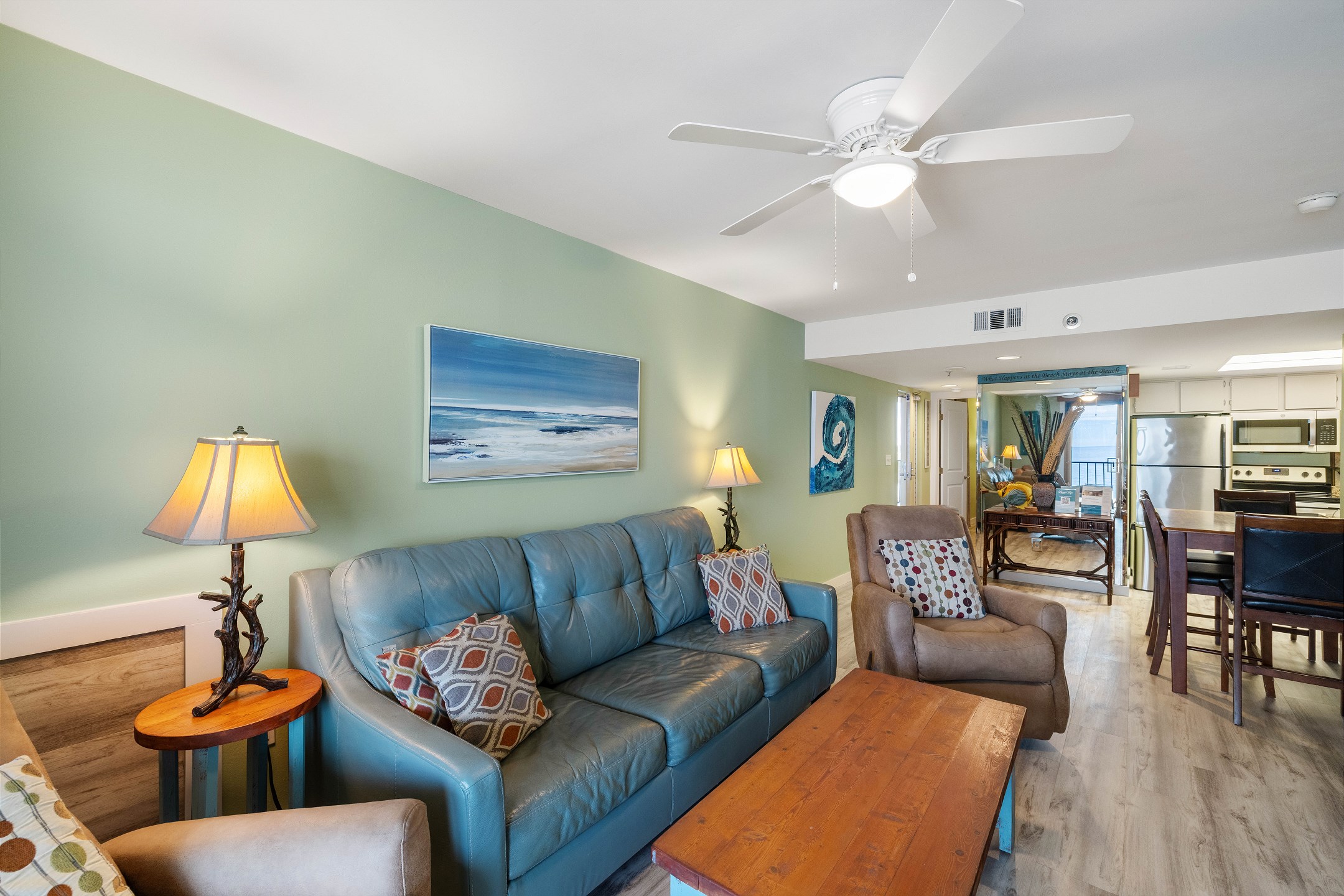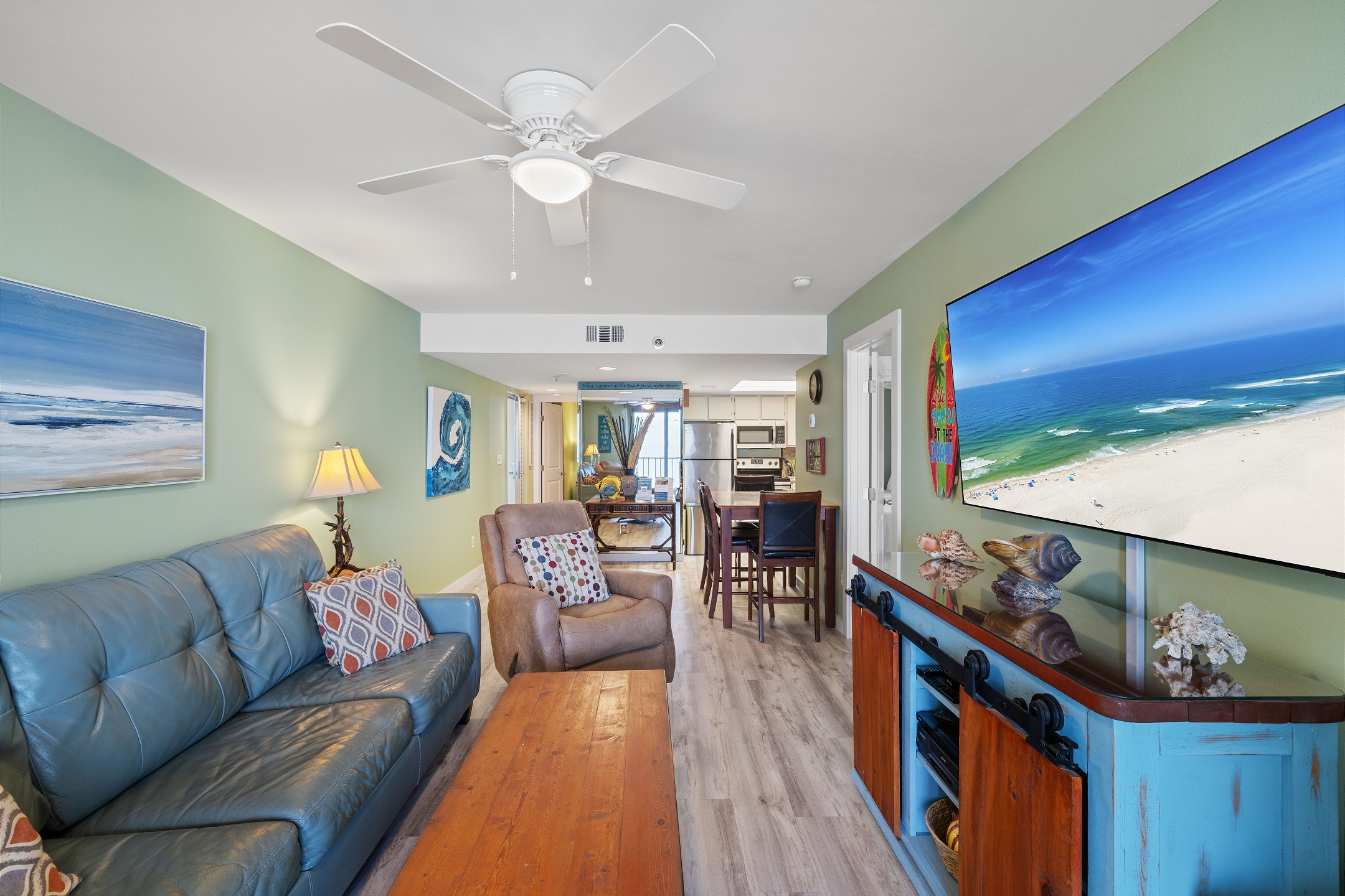 The living room features private balcony access with stunning views, as well as a flat screen TV for relaxation after a day on the beach. The kitchen is equipped with stainless steel appliances and a dining table, making it easy to prepare meals and dine in.