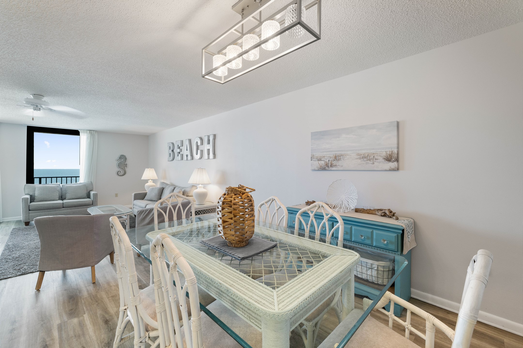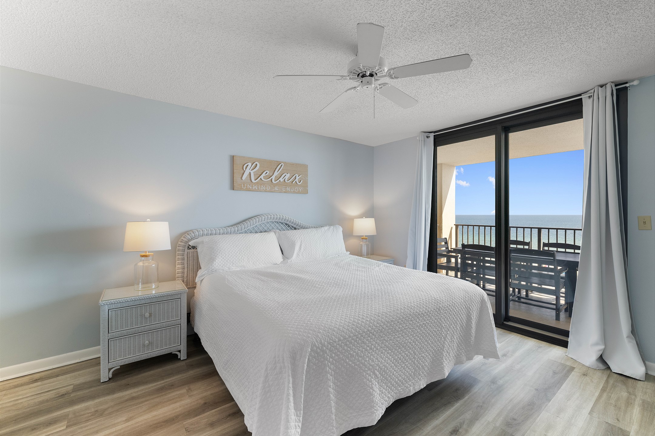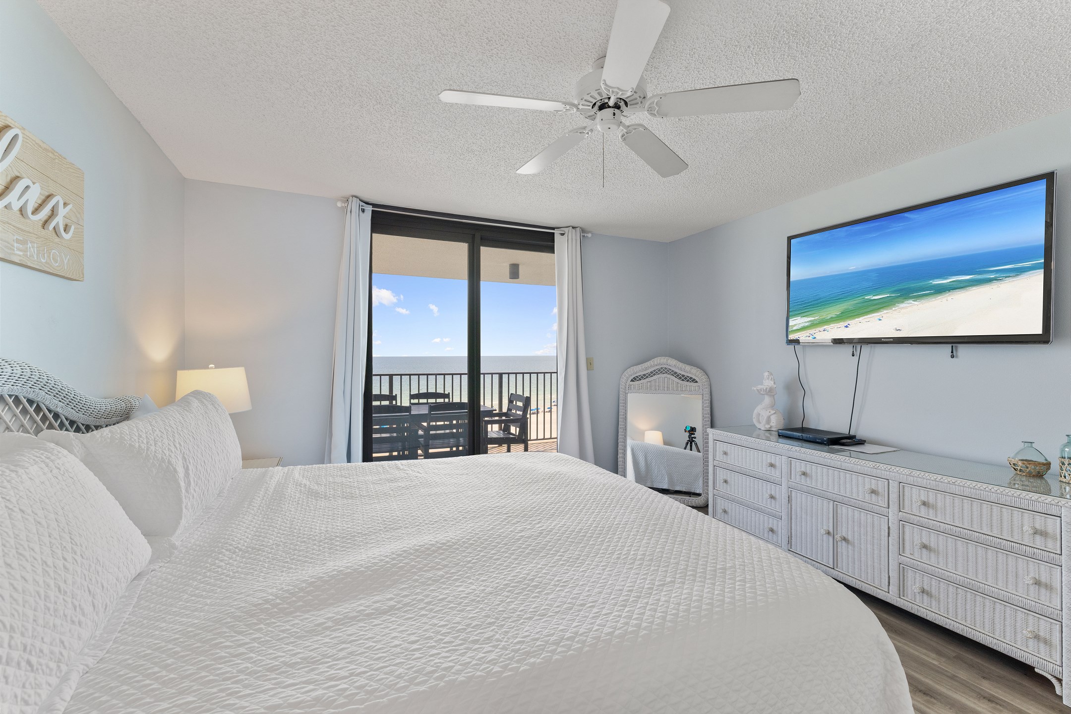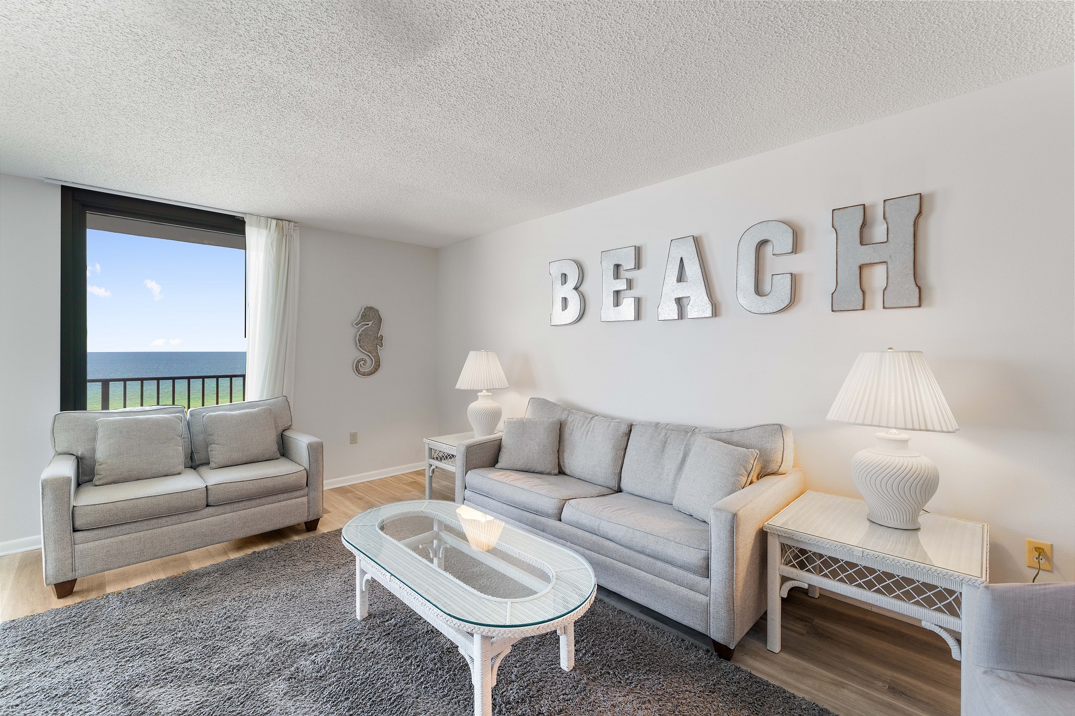 The open living area features floor-to-ceiling windows overlooking the Gulf, a flat-screen TV, and plush seating that invites relaxation after a day on the sand. Step onto your private balcony to take in the sound of the waves and unforgettable sunsets.