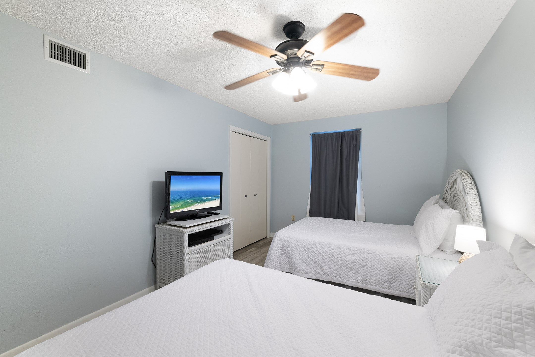 The primary suite offers a king bed, flat-screen TV, floor-to-ceiling windows, and direct balcony access, along with a private ensuite bathroom. The first guest bedroom has a queen bed, while the second guest bedroom includes two full beds and shares access to a second full bathroom. For additional sleeping arrangements, there are two twin rollaway beds and a sofa sleeper in the living room.