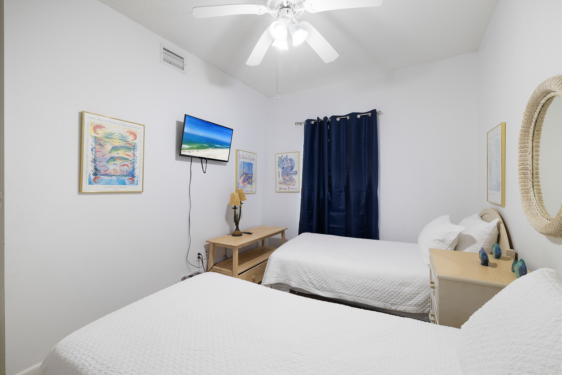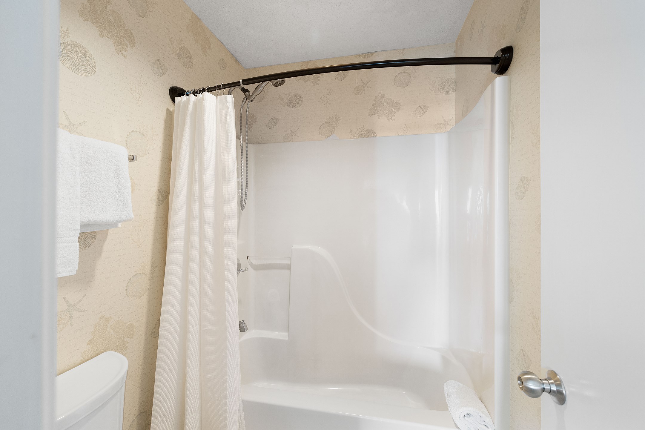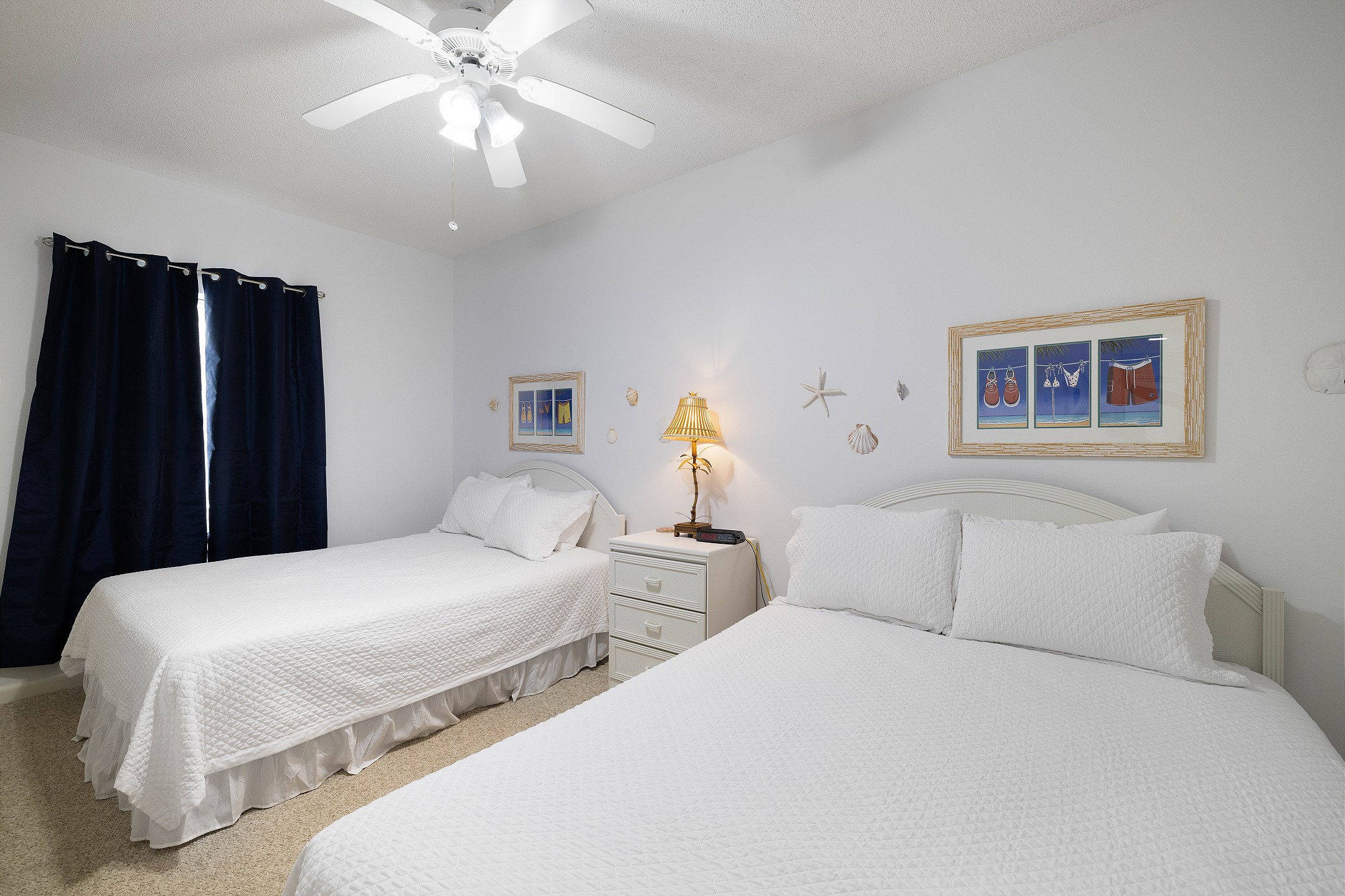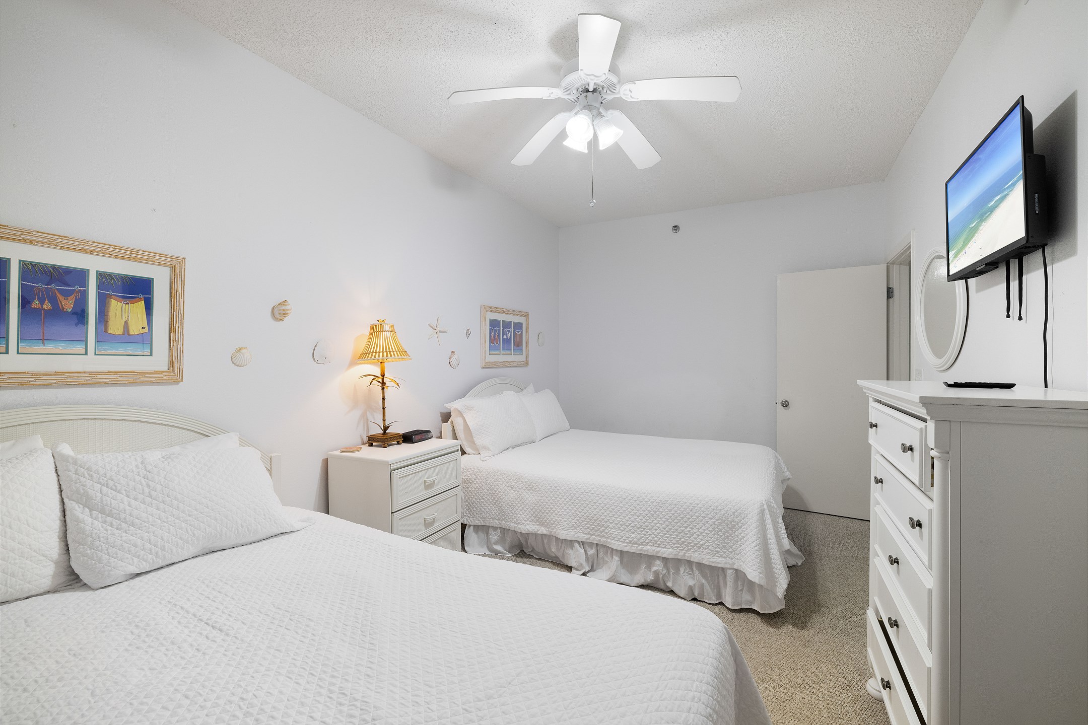 The primary bedroom features a king bed, private balcony access, and an ensuite bathroom for added comfort and privacy. The second bedroom includes two queen beds, while the third bedroom offers two twin beds, making it a great setup for families or groups. A second full bathroom with a shower and tub combination is conveniently accessible from the hallway.