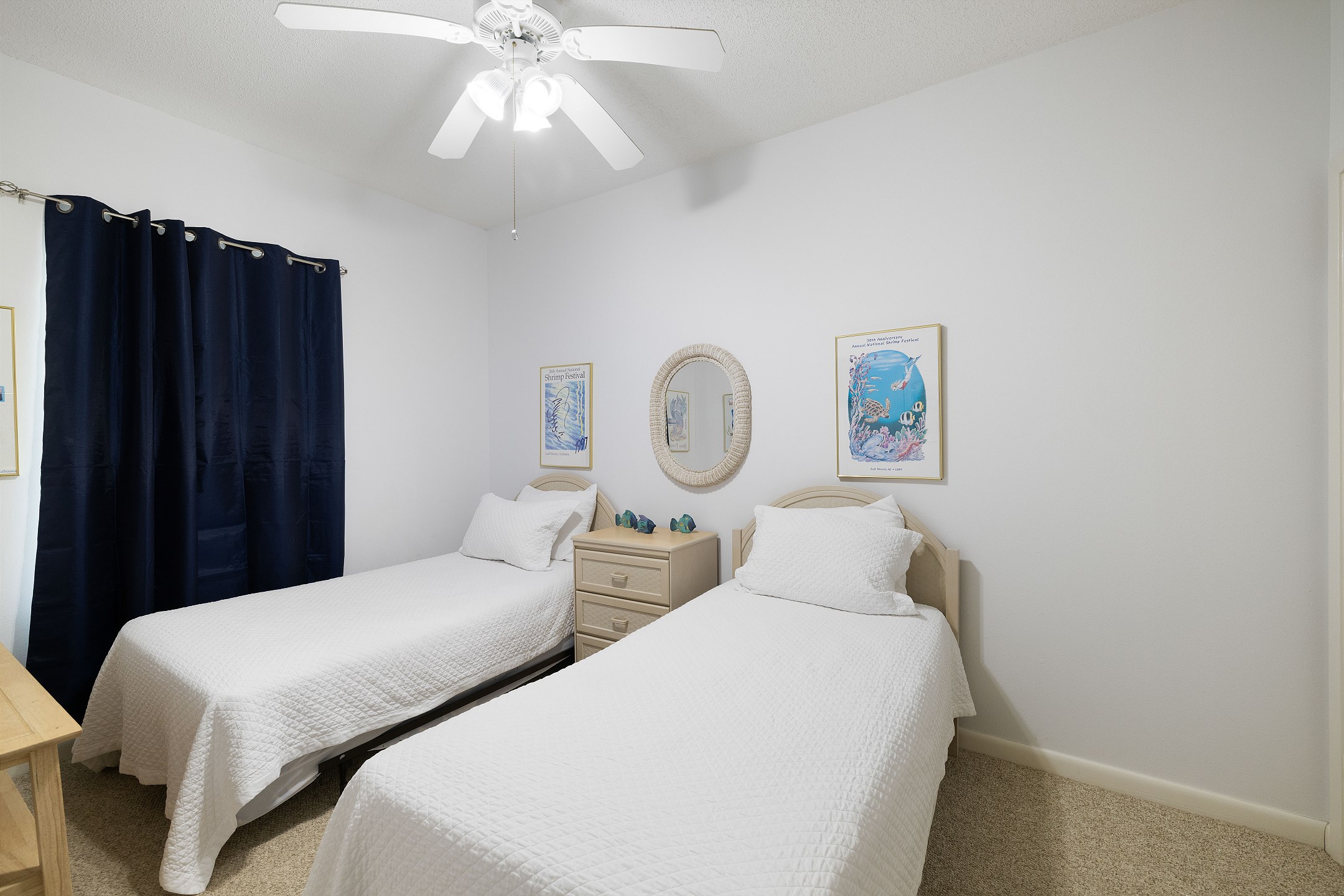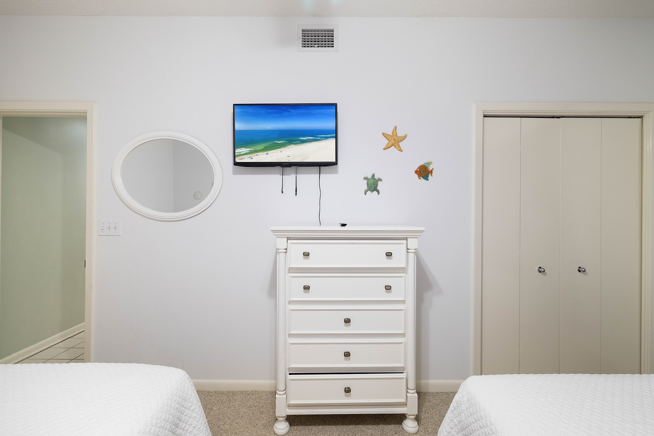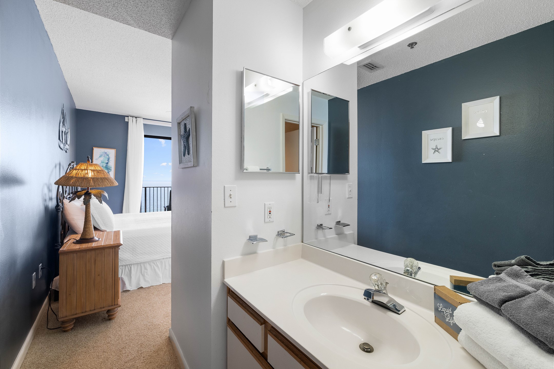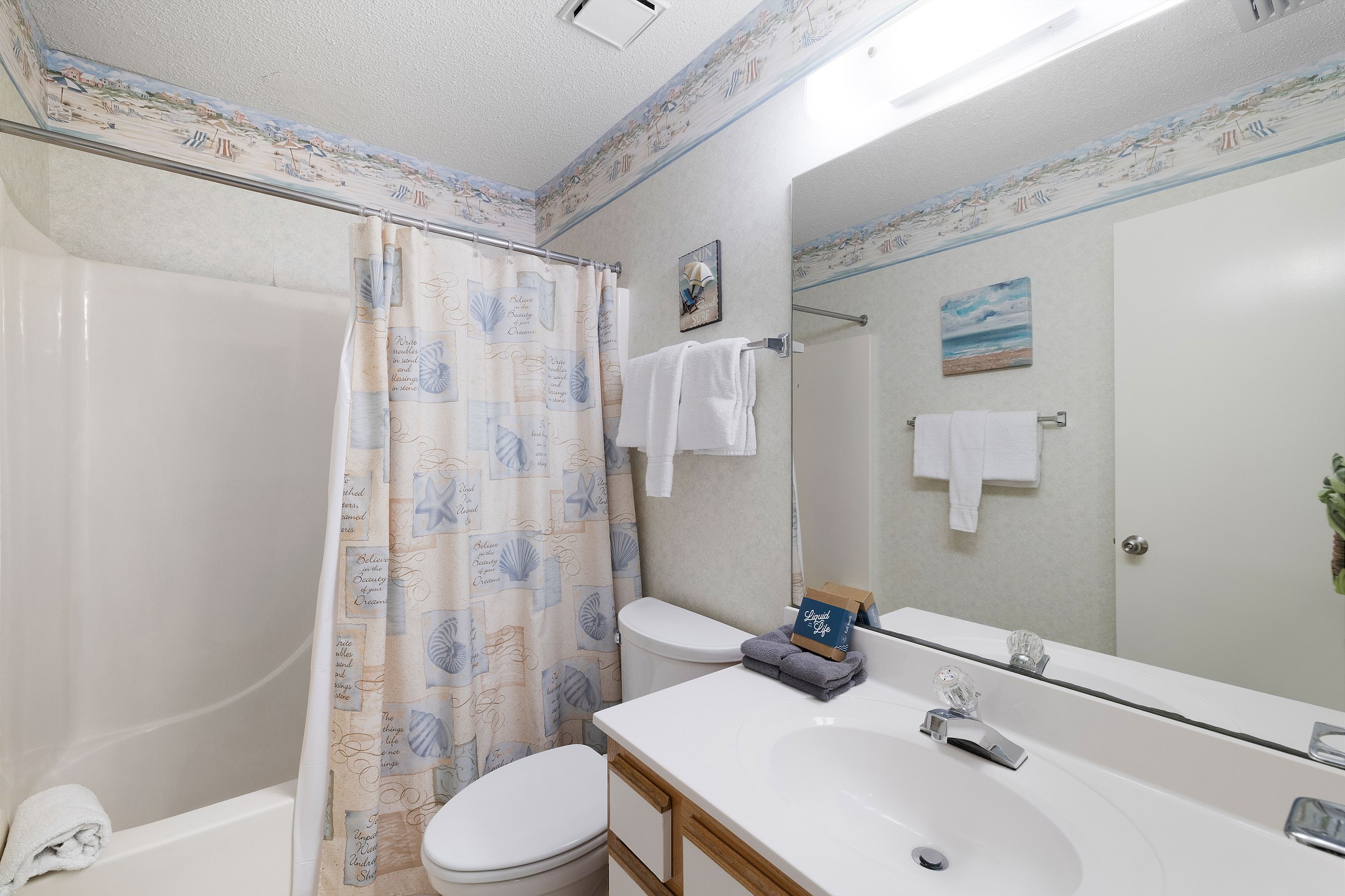 The primary bedroom features a king bed, private balcony access, and an ensuite bathroom for added comfort and privacy. The second bedroom includes two queen beds, while the third bedroom offers two twin beds, making it a great setup for families or groups. A second full bathroom with a shower and tub combination is conveniently accessible from the hallway.