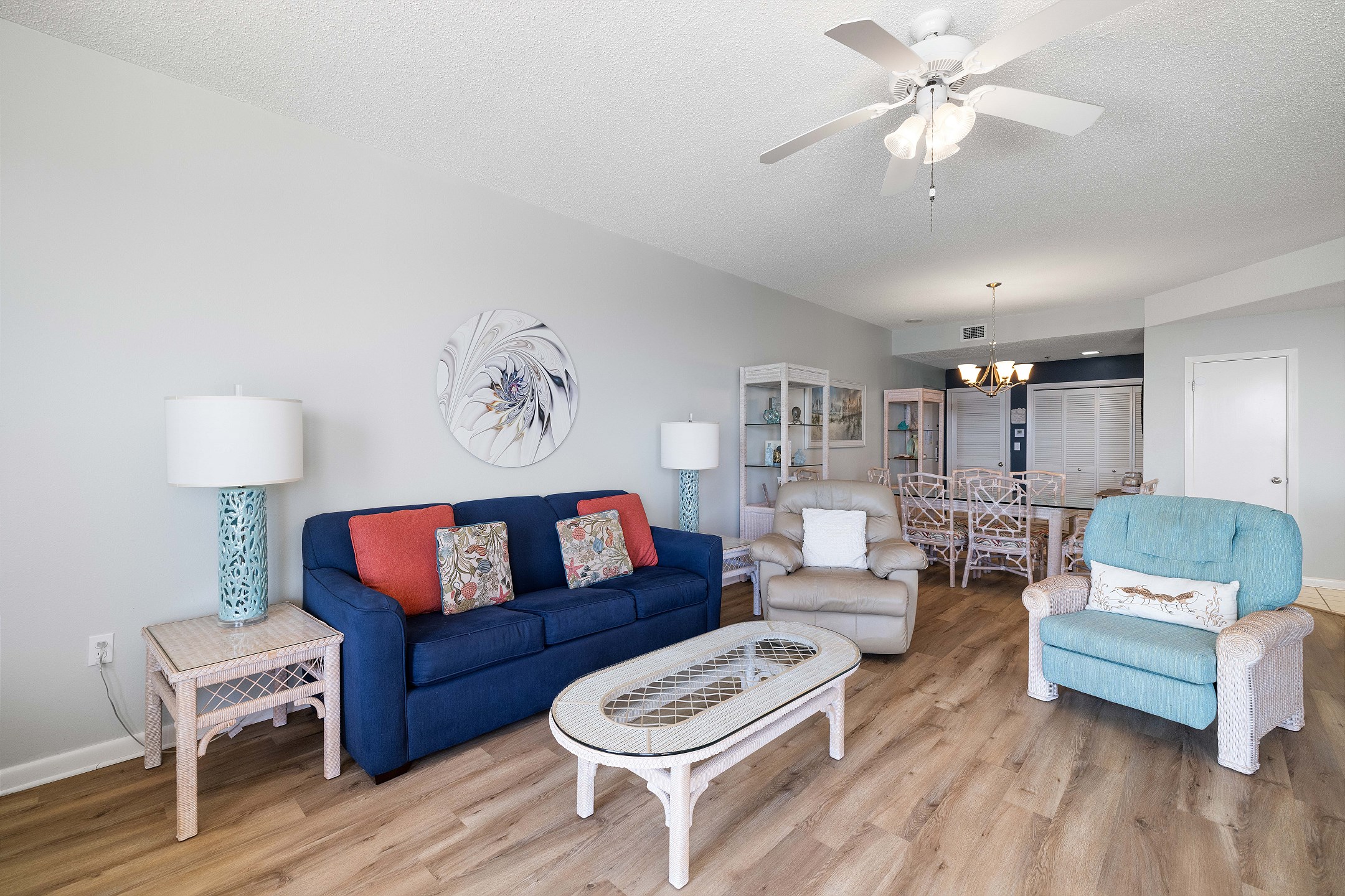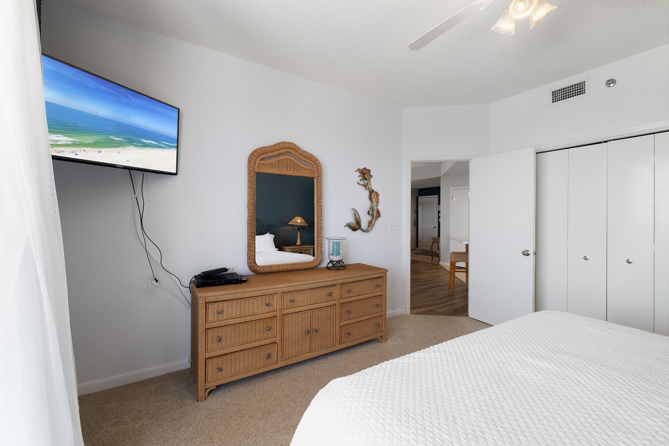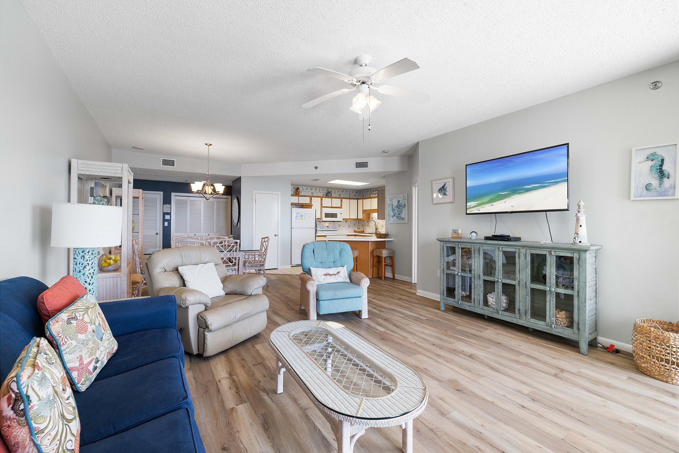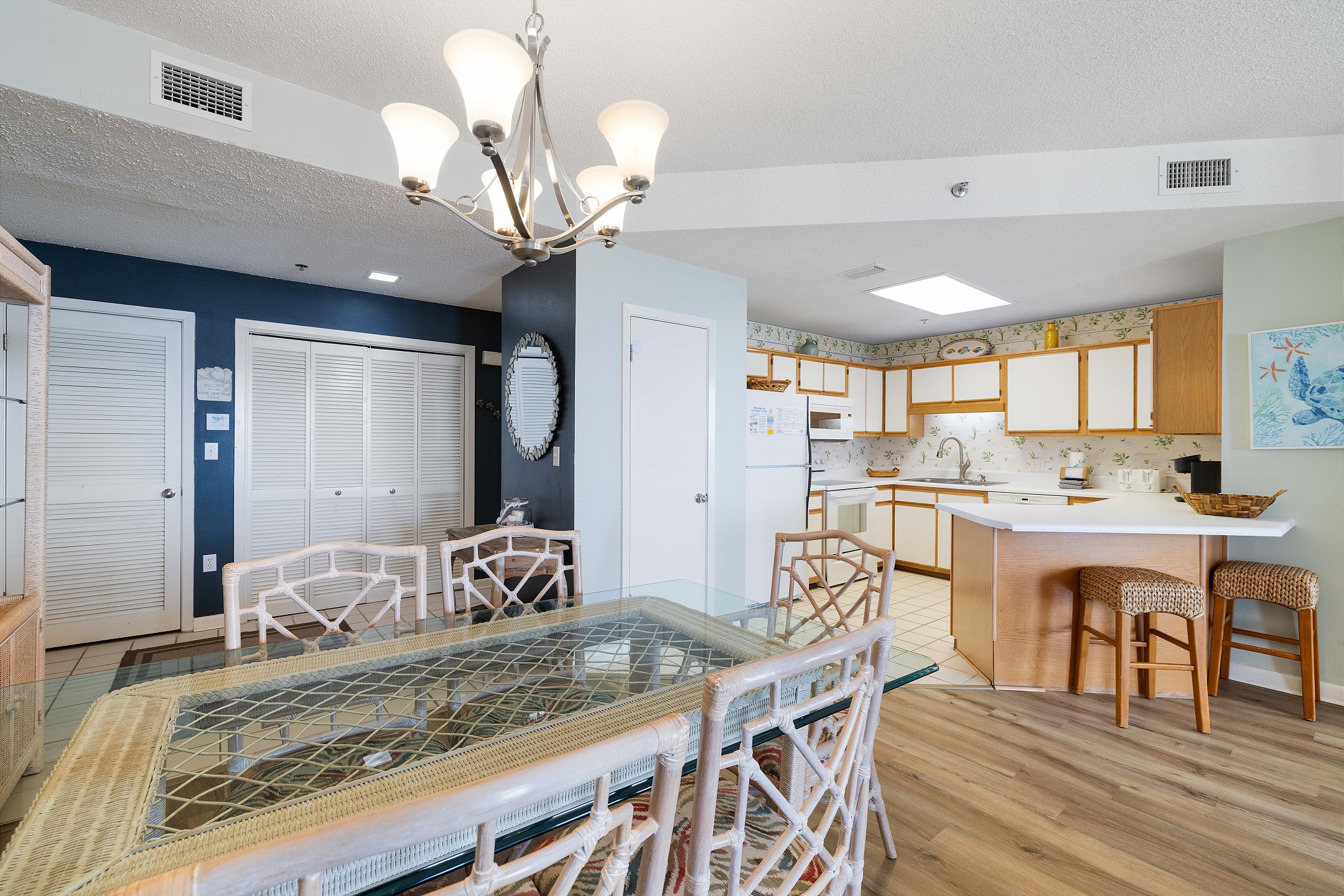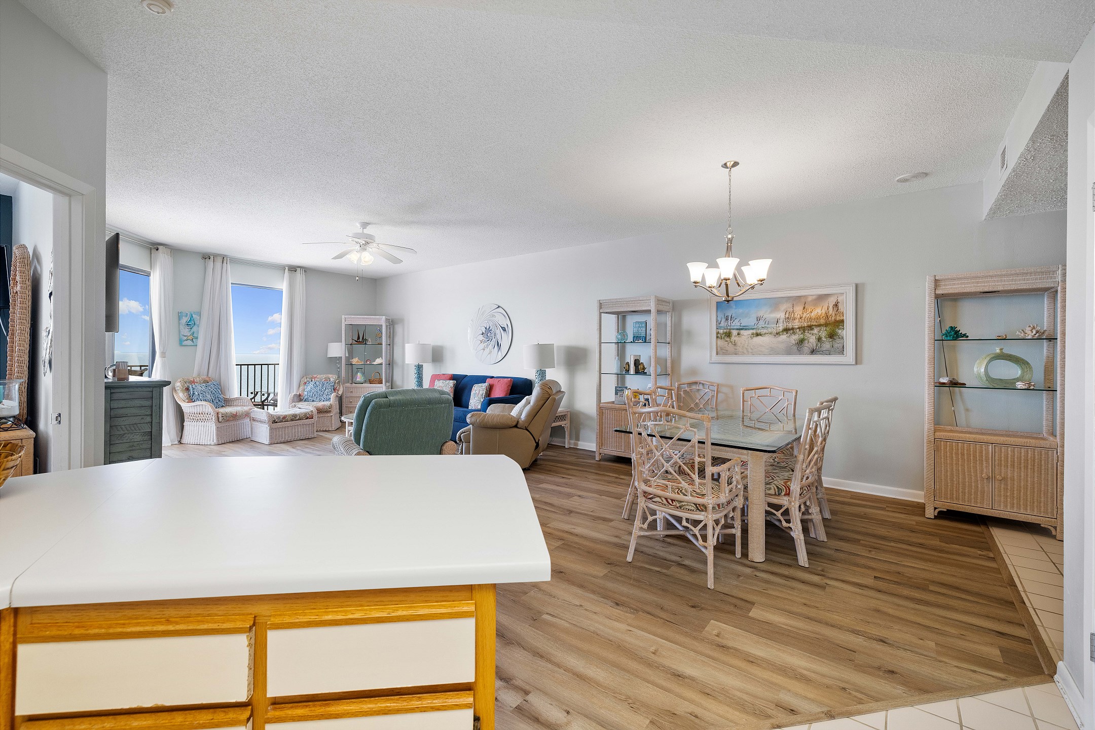 This open concept retreat features a bright and inviting living area with plenty of seating, a flat screen TV, and access to the private balcony overlooking the Gulf, perfect for taking in the stunning beachfront views. The fully equipped kitchen offers everything you need for meal preparation along with a large dining table for gathering together.