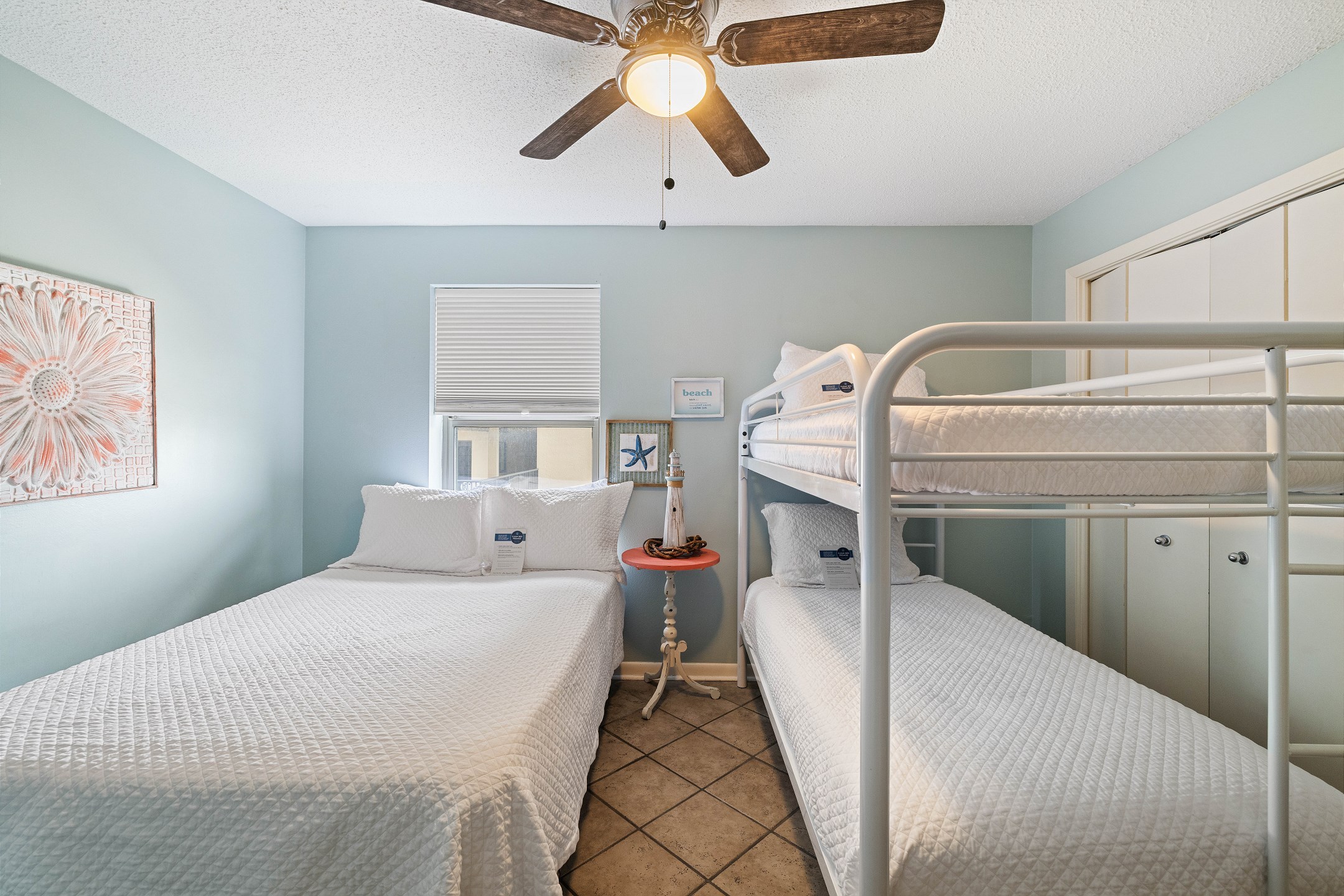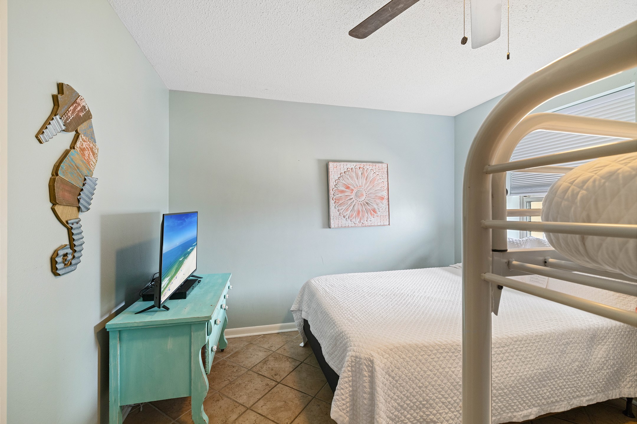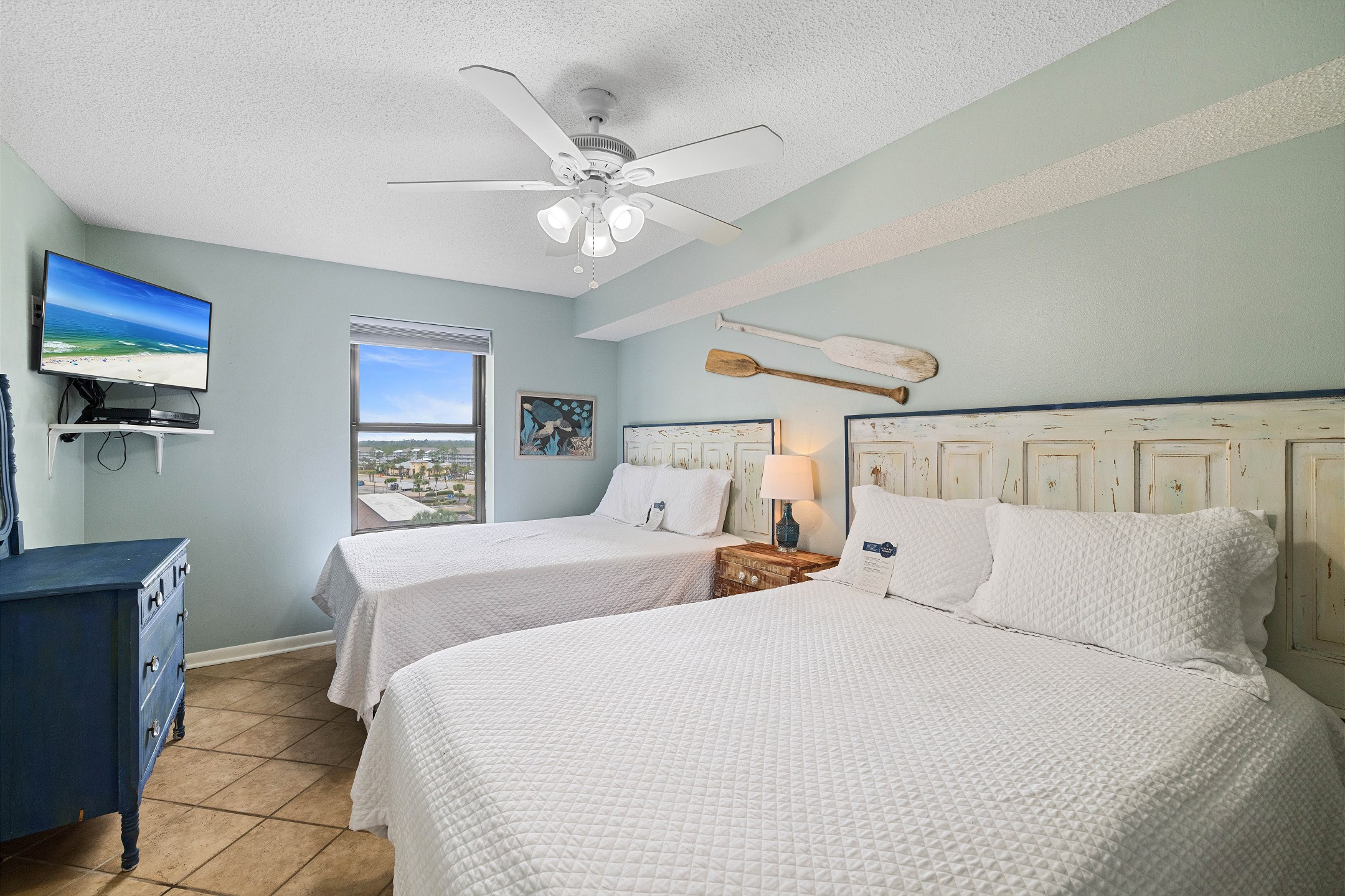 The Primary suite is a tranquil retreat, featuring a King bed, flat-screen TV, and access to a North-facing balcony. The private bath boasts a tile walk-in shower, offering a spa-like experience. The second bedroom is comfortably furnished with 2 Full beds and a flat-screen TV, while the third bedroom is ideal for kids or extra guests, featuring a Full bed, Twin bunk beds, and a flat-screen TV.