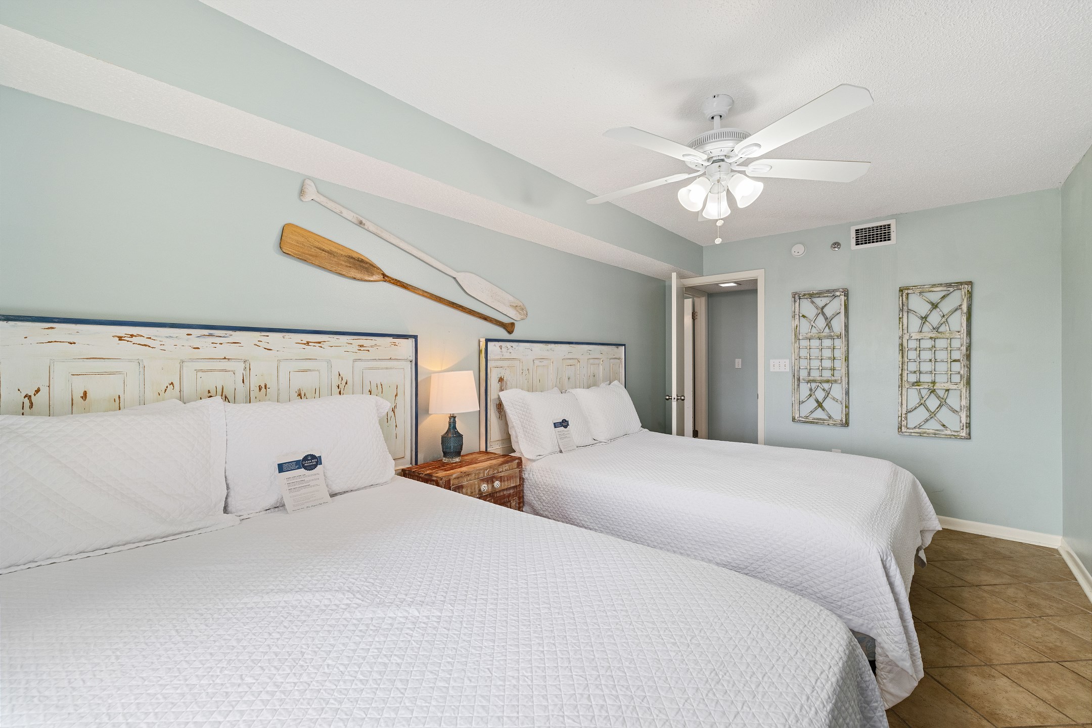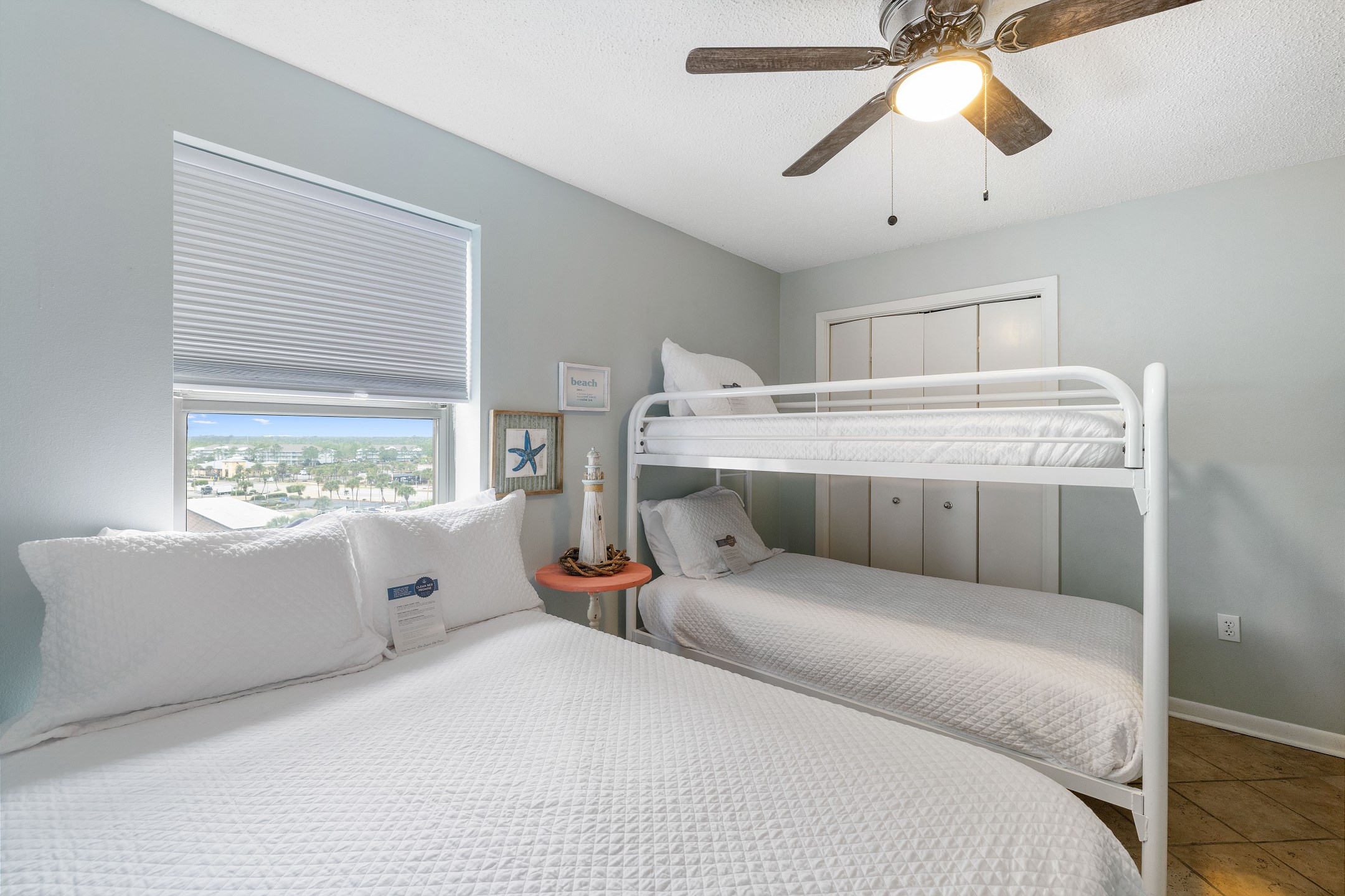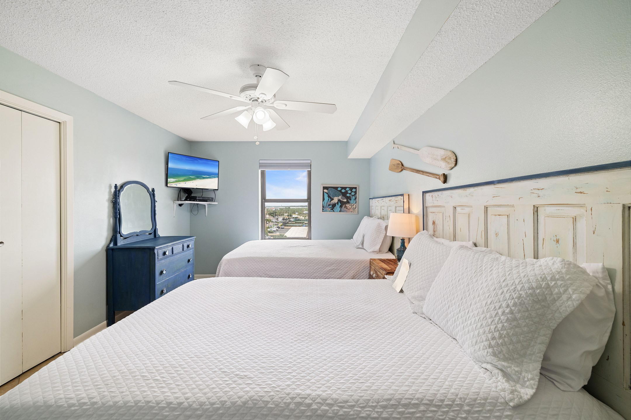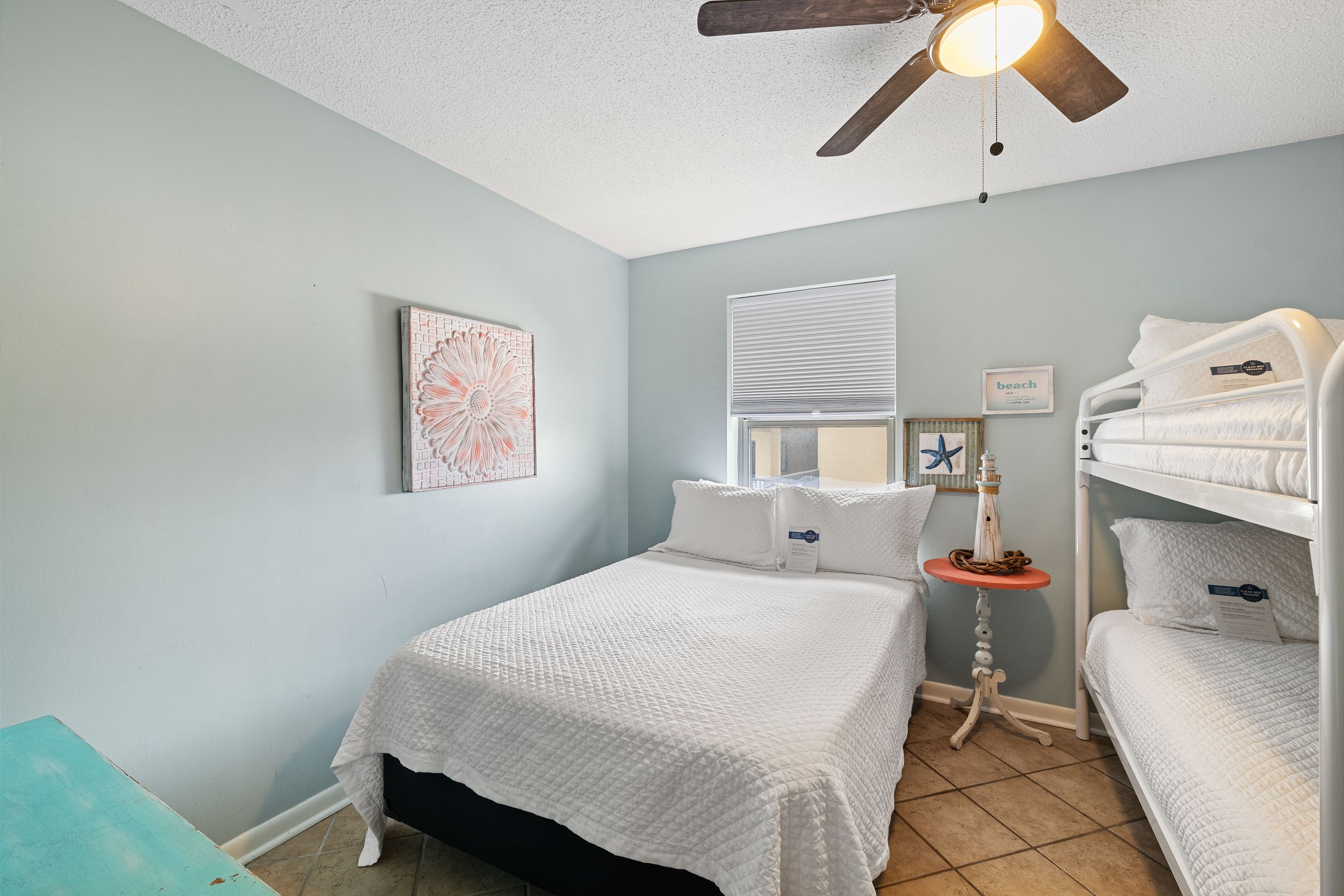 The Primary suite is a tranquil retreat, featuring a King bed, flat-screen TV, and access to a North-facing balcony. The private bath boasts a tile walk-in shower, offering a spa-like experience. The second bedroom is comfortably furnished with 2 Full beds and a flat-screen TV, while the third bedroom is ideal for kids or extra guests, featuring a Full bed, Twin bunk beds, and a flat-screen TV.