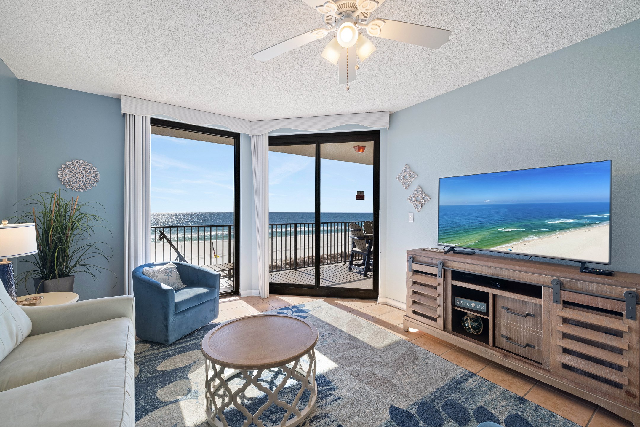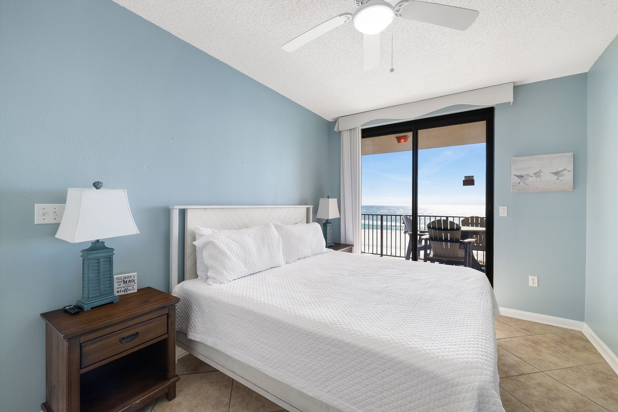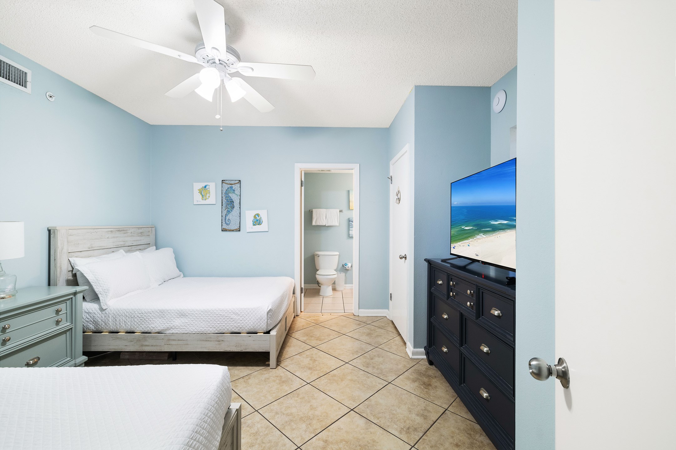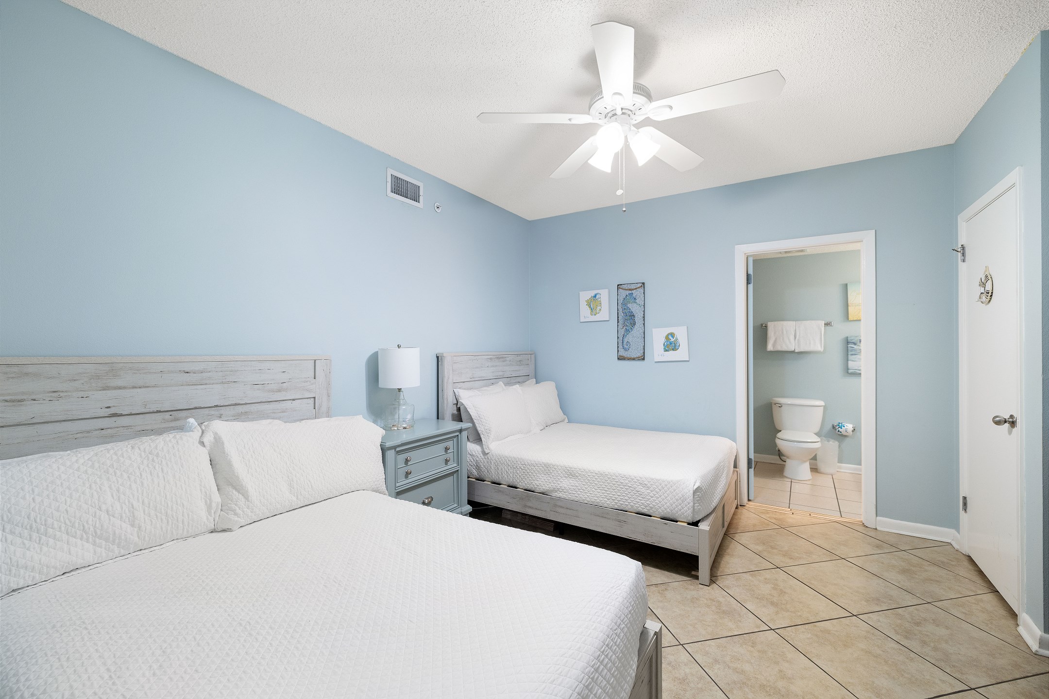 The primary bedroom features a plush king size bed, stunning Gulf views through its balcony access, and a private ensuite bathroom with a walk in shower. The second bedroom includes two full size beds and its own ensuite bathroom with a shower and tub combination for added comfort and convenience. A sofa sleeper in the living room provides additional sleeping space.