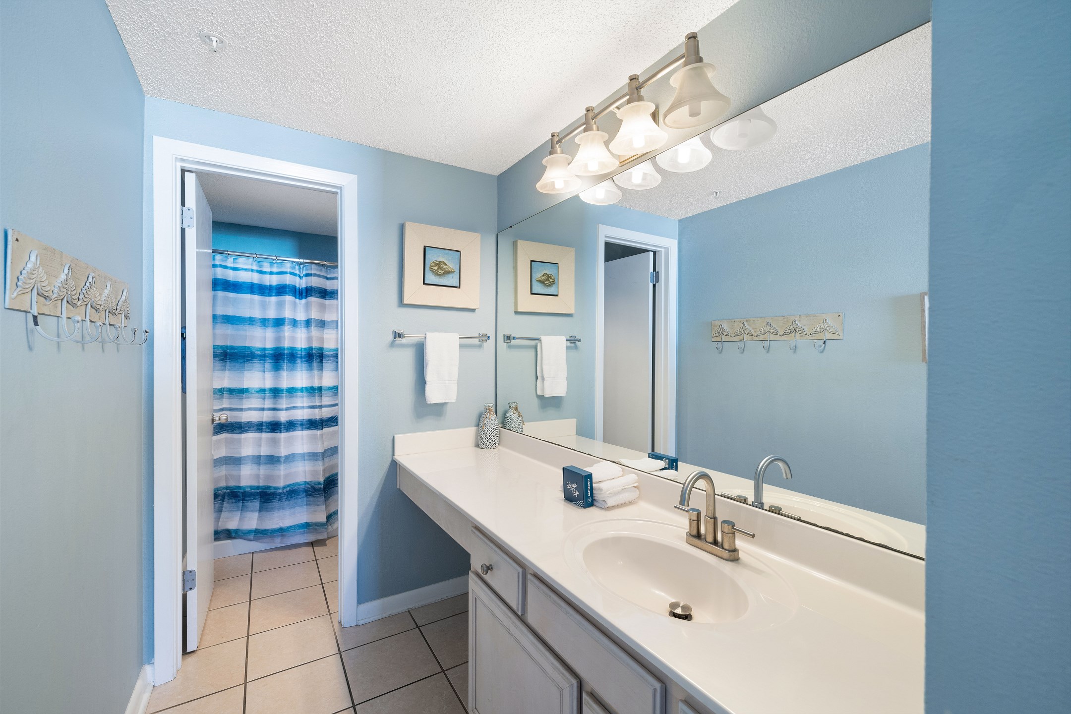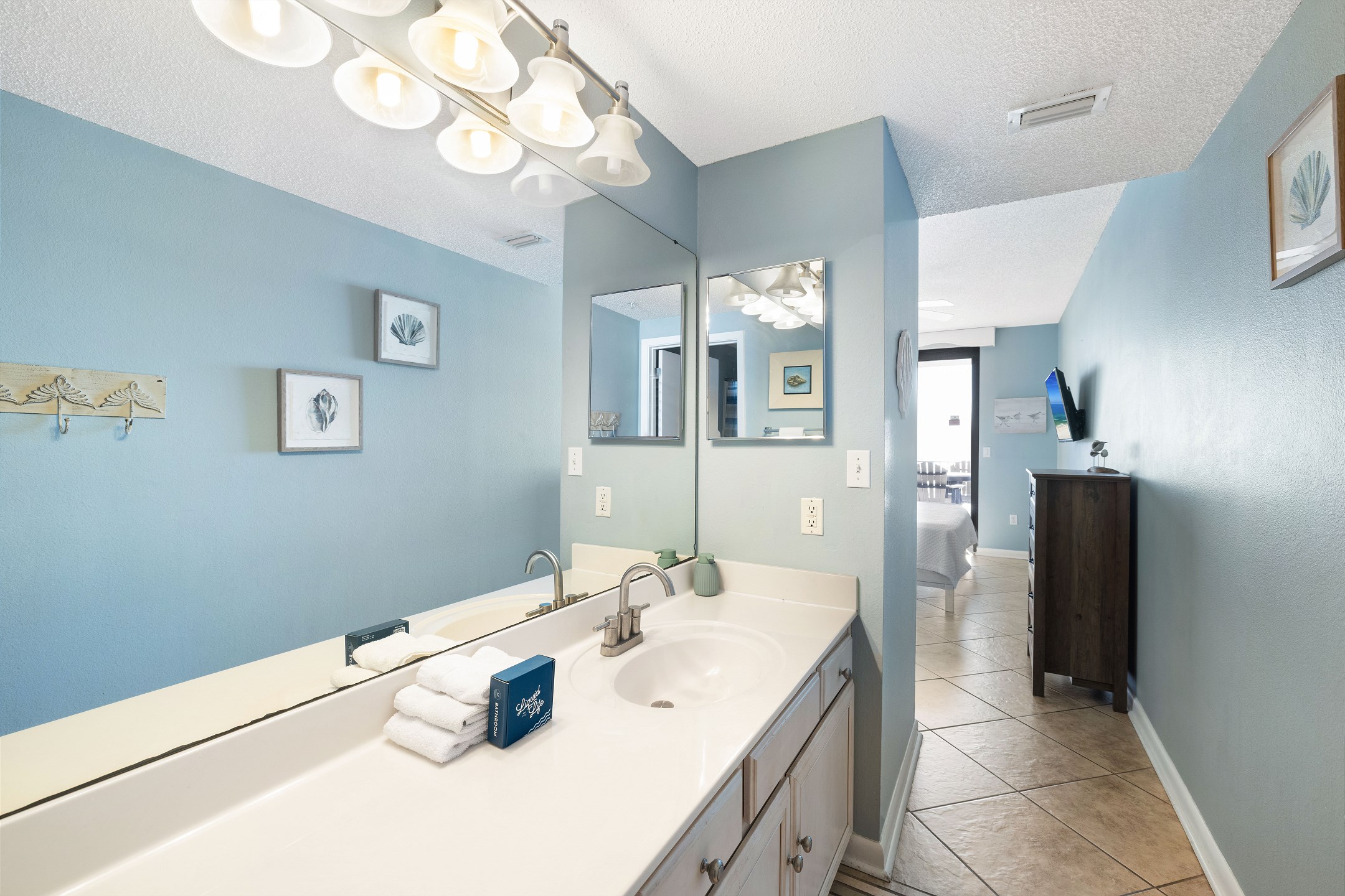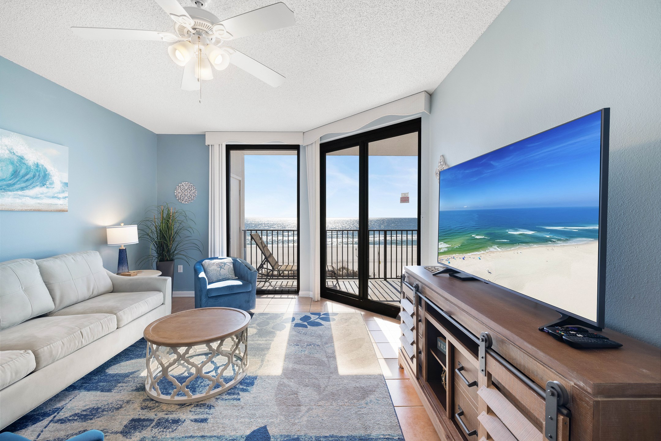 The primary bedroom features a plush king size bed, stunning Gulf views through its balcony access, and a private ensuite bathroom with a walk in shower. The second bedroom includes two full size beds and its own ensuite bathroom with a shower and tub combination for added comfort and convenience. A sofa sleeper in the living room provides additional sleeping space.