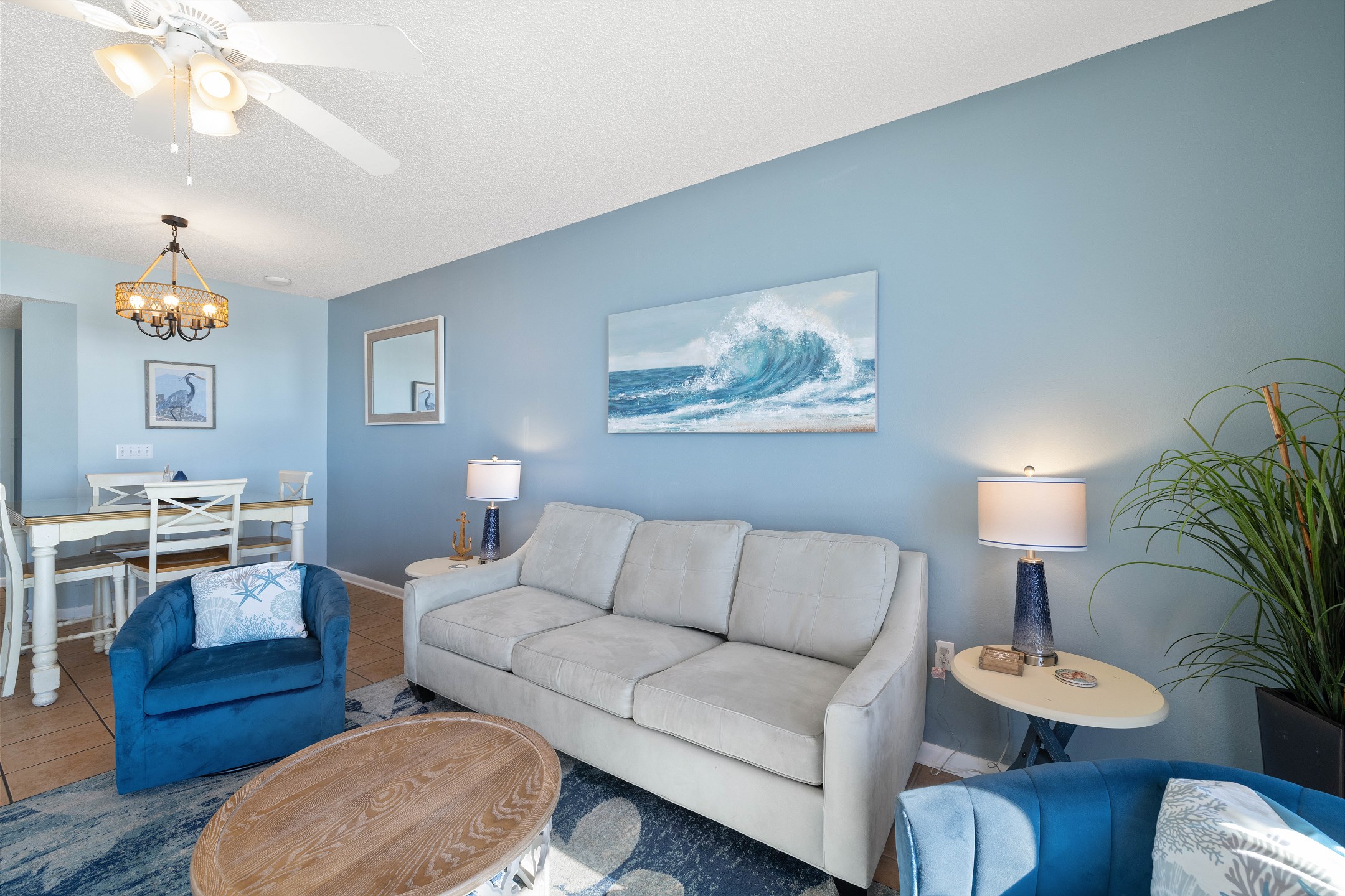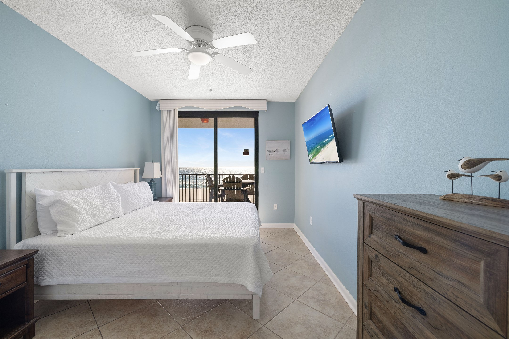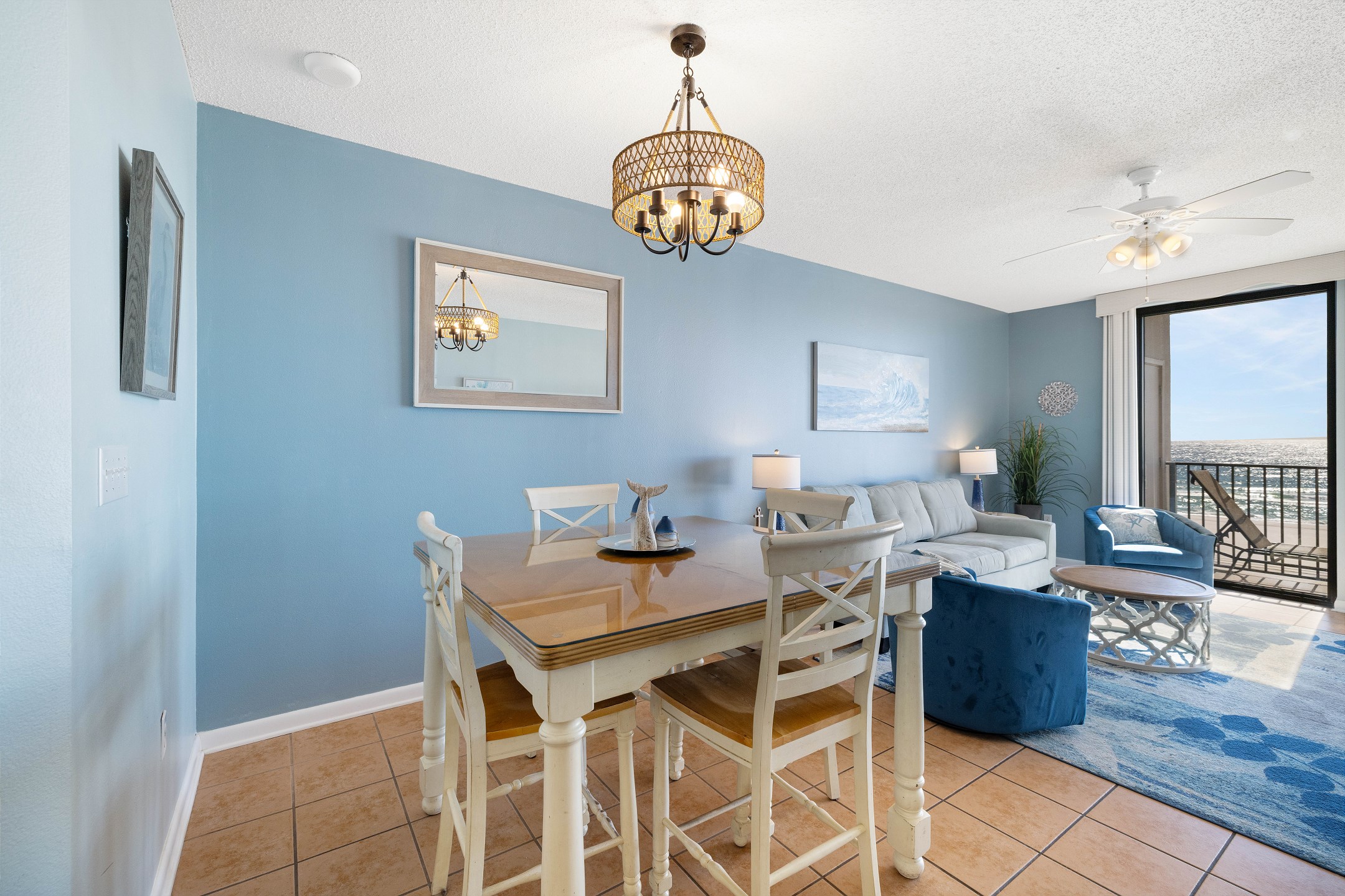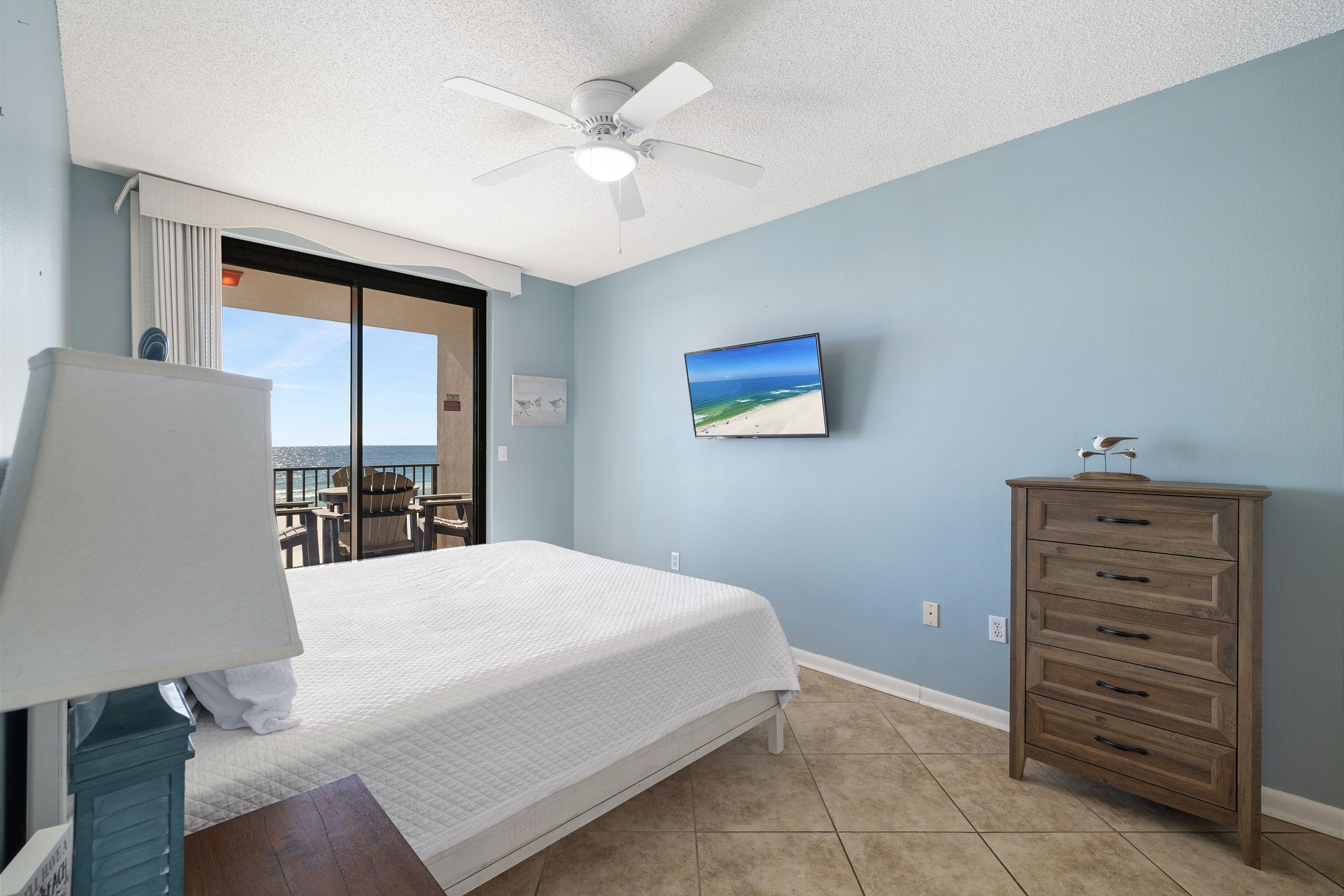 The primary bedroom features a plush king size bed, stunning Gulf views through its balcony access, and a private ensuite bathroom with a walk in shower. The second bedroom includes two full size beds and its own ensuite bathroom with a shower and tub combination for added comfort and convenience. A sofa sleeper in the living room provides additional sleeping space.