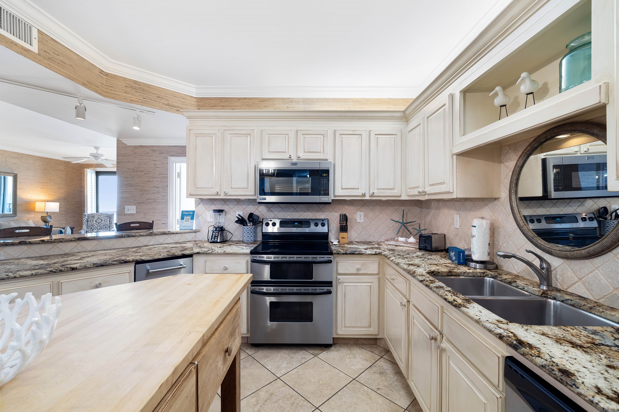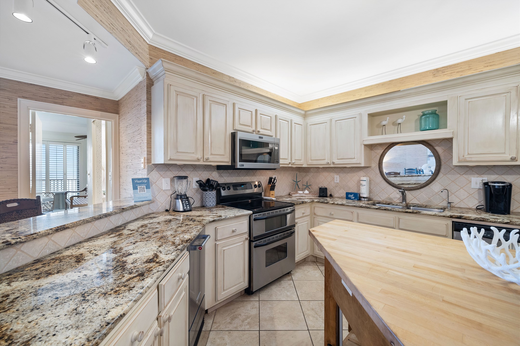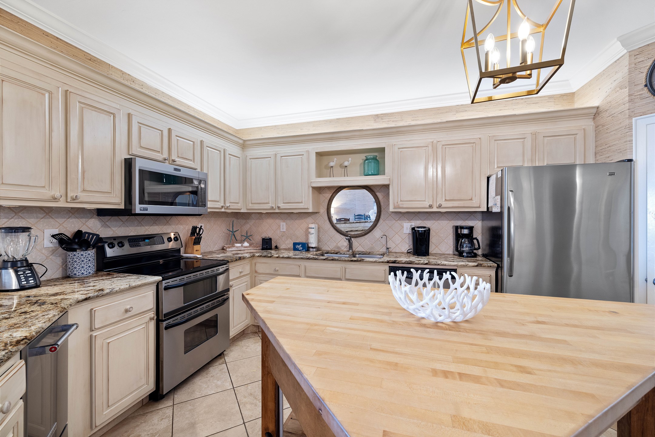 The large, fully equipped kitchen, adorned with custom cabinets, stainless steel appliances, an ice maker, granite counters, and a breakfast bar, invites you to indulge in culinary delights. Other amenities include a full-sized washer and dryer, free WiFi, and a flat-screen TV in the spacious living room.