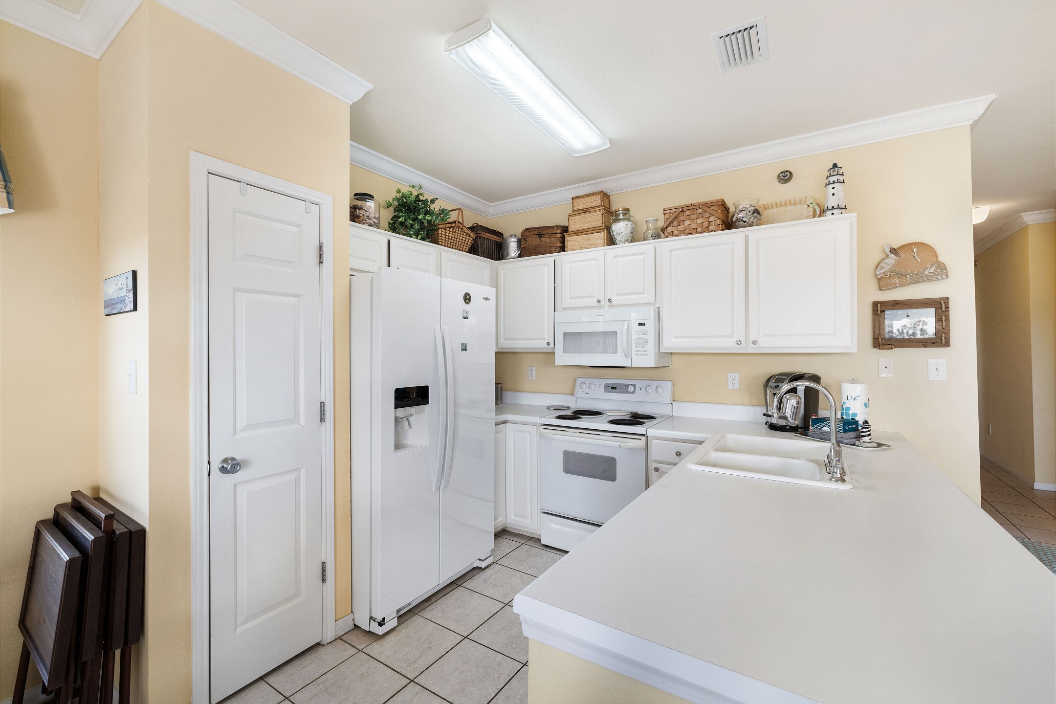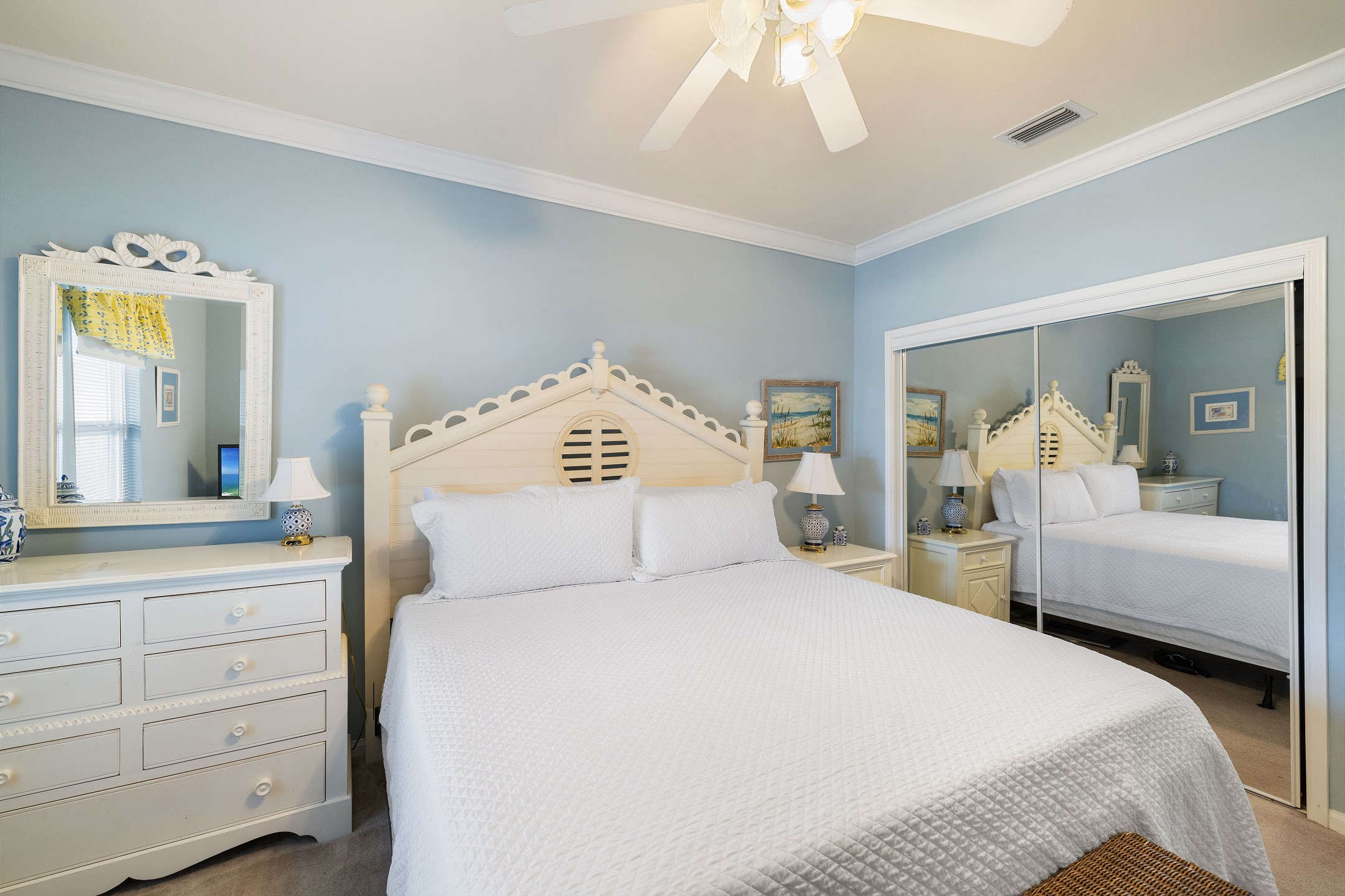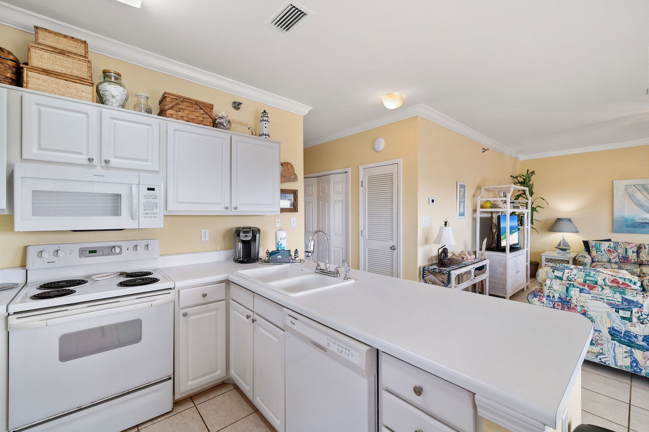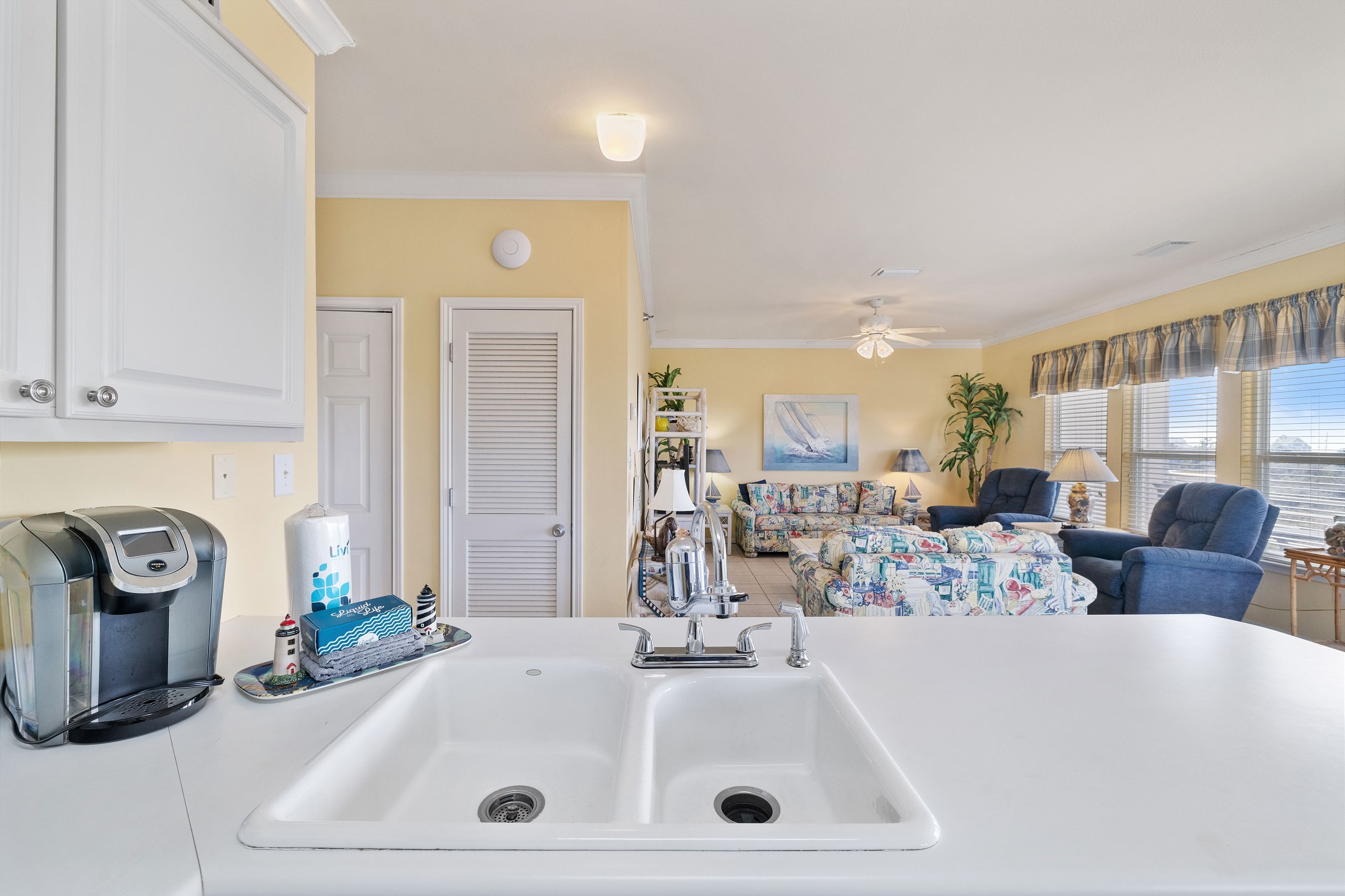 The spacious living room offers plenty of room to unwind after a day at the beach, and it includes a convenient sofa sleeper for additional sleeping space. The fully equipped kitchen has everything you need to prepare meals during your stay.