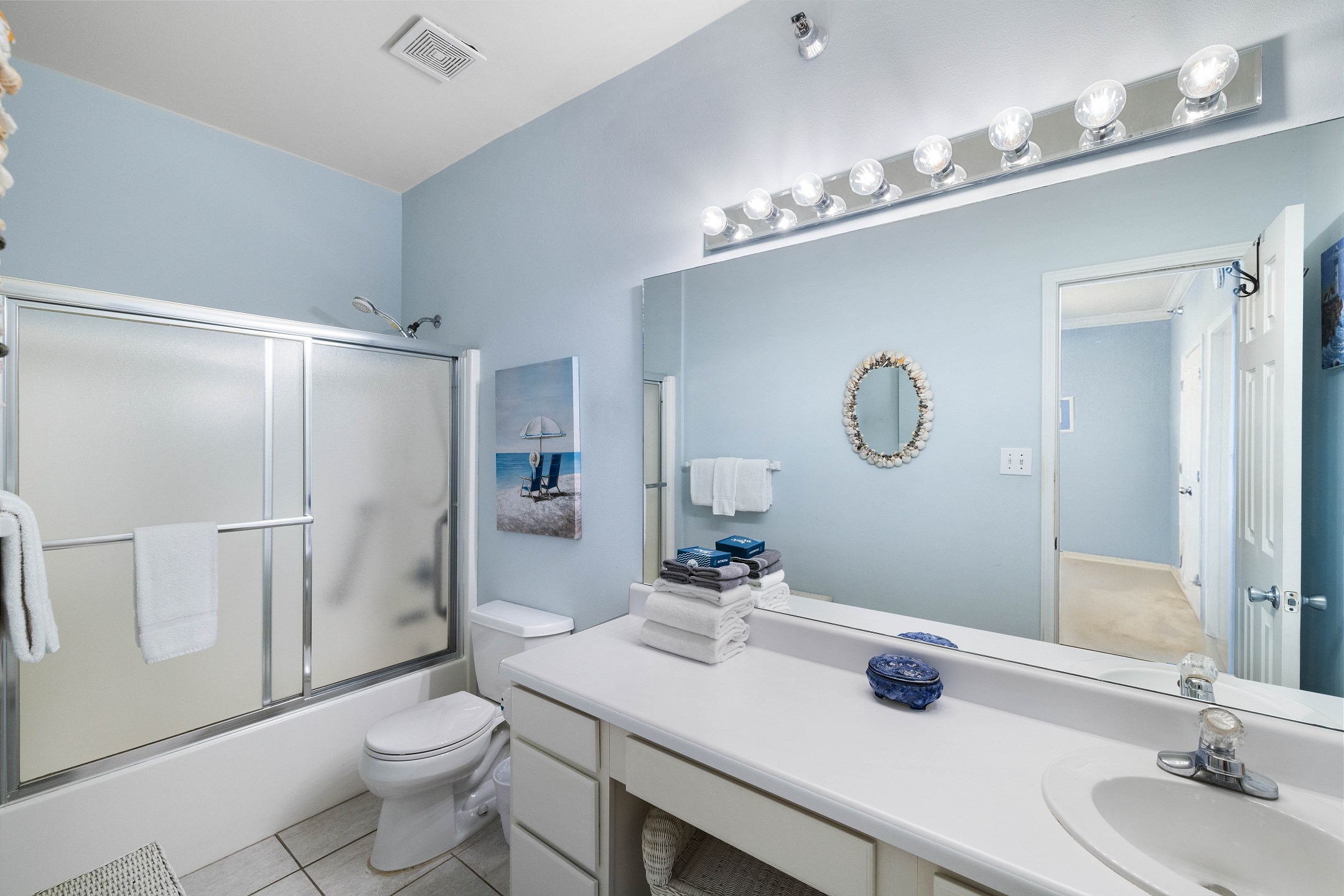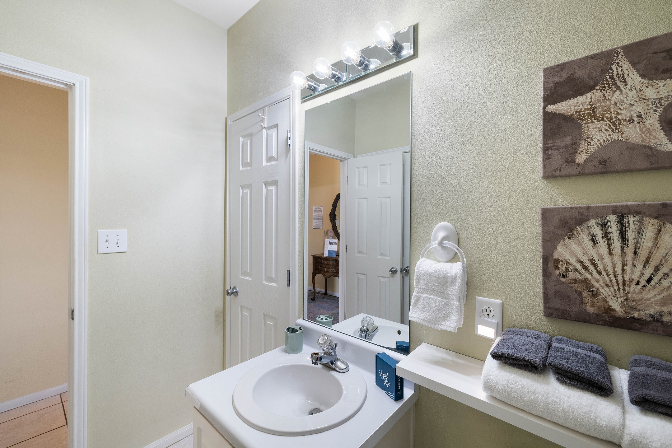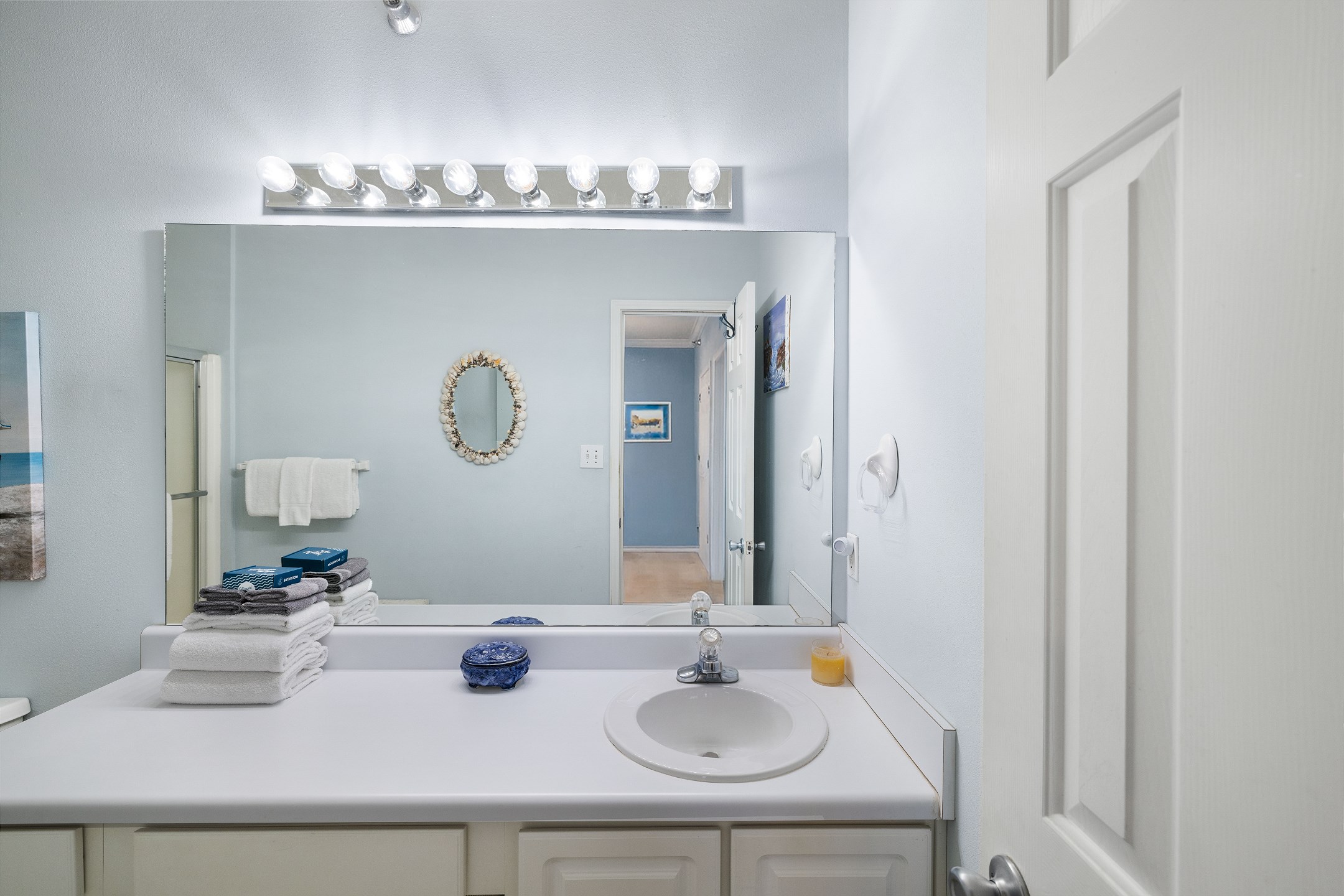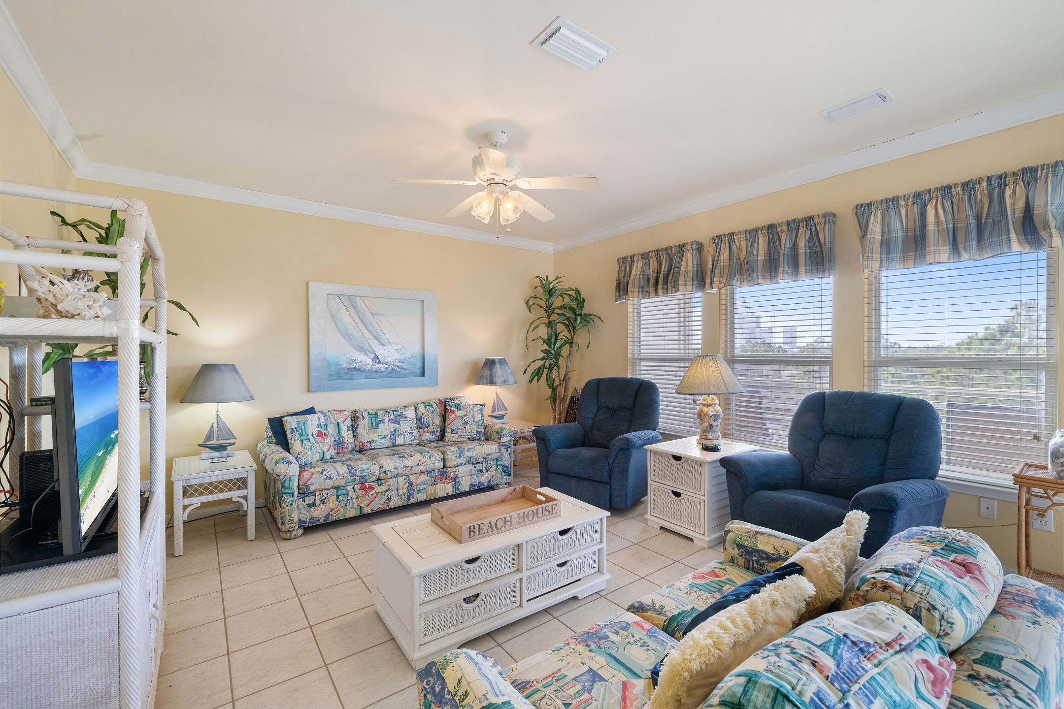 The spacious living room offers plenty of room to unwind after a day at the beach, and it includes a convenient sofa sleeper for additional sleeping space. The fully equipped kitchen has everything you need to prepare meals during your stay.