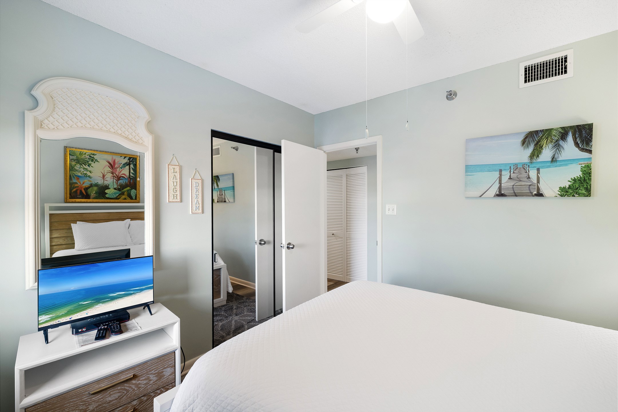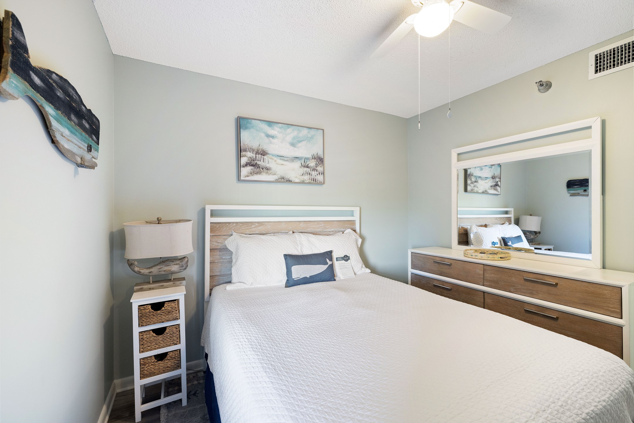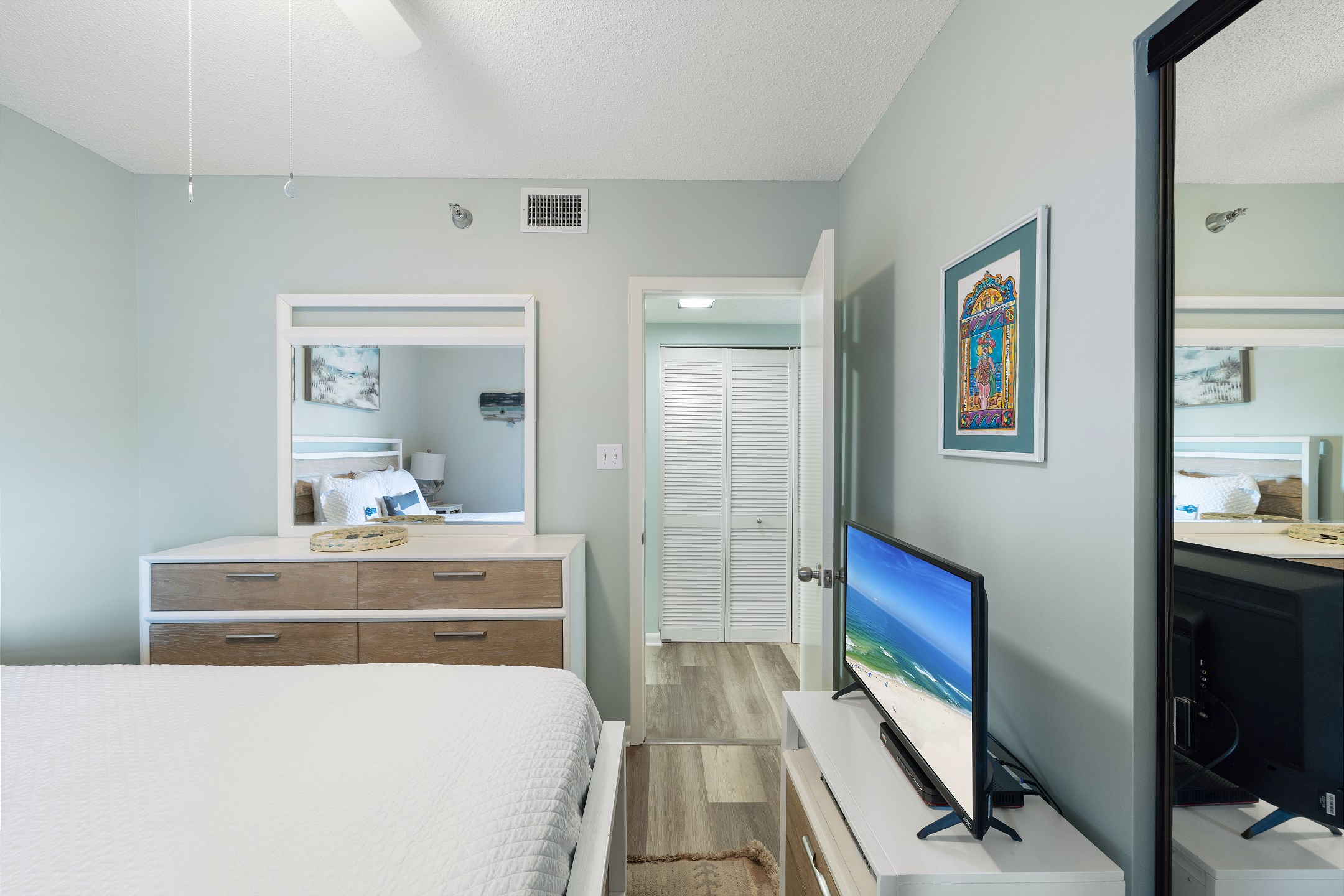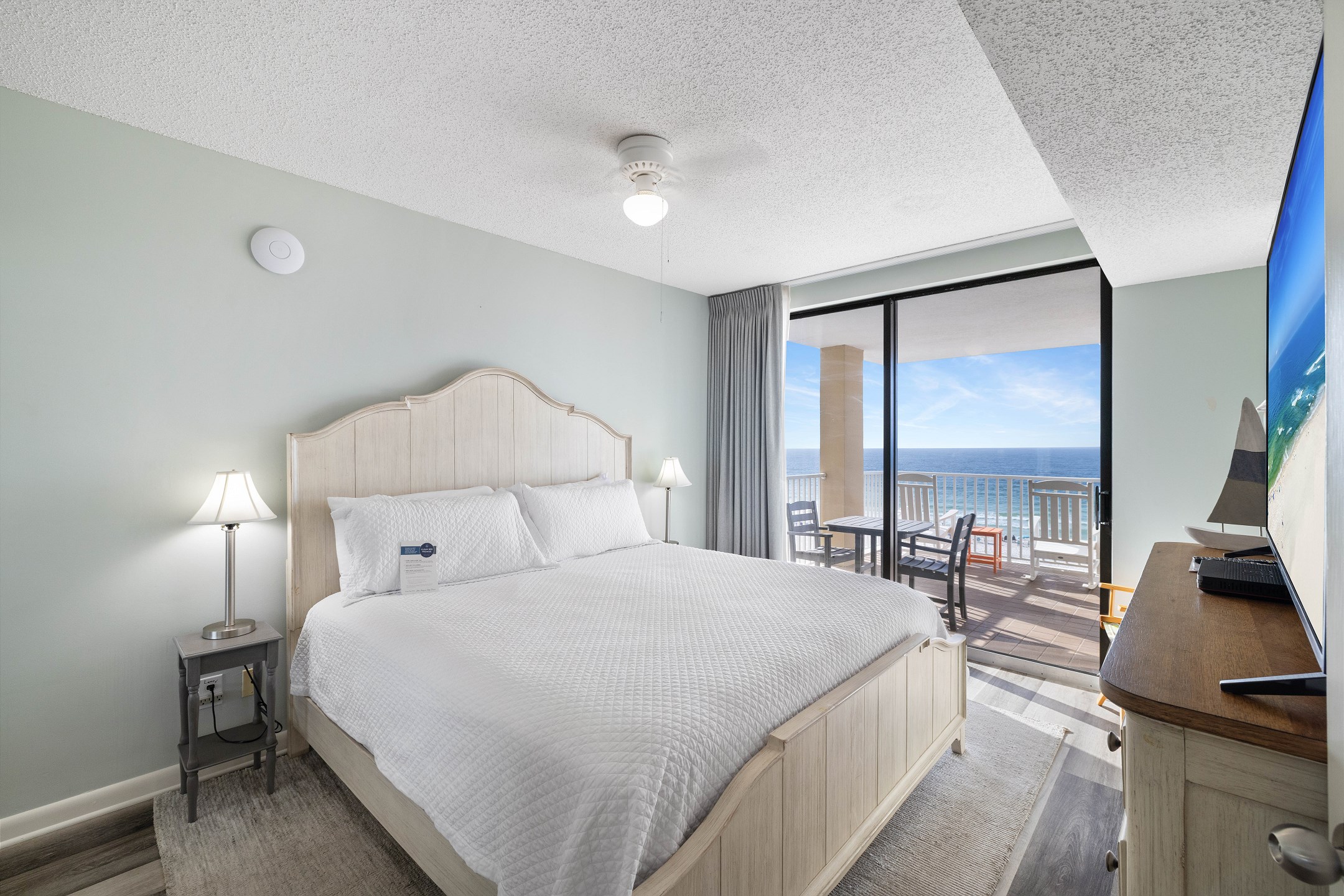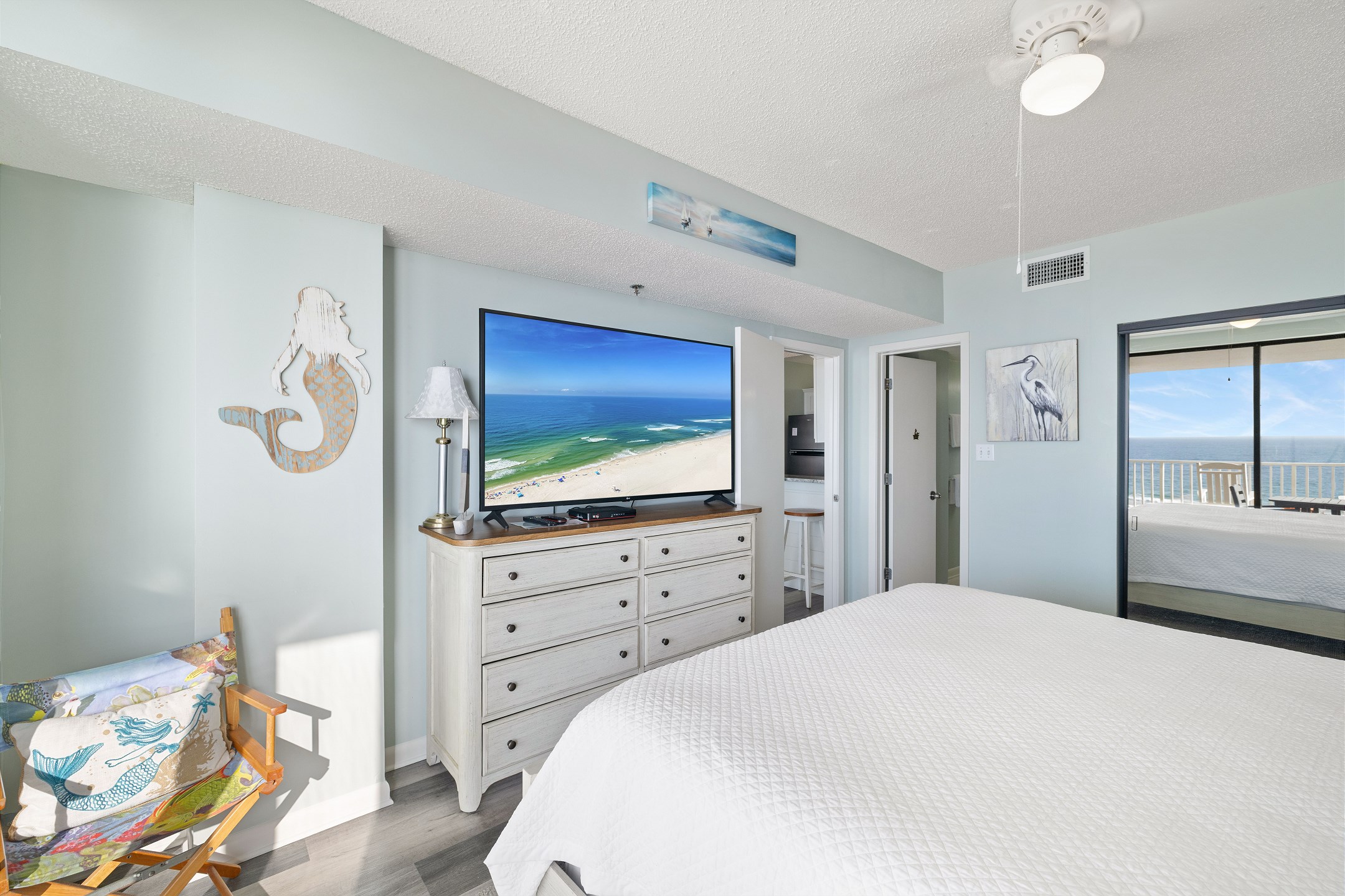 The primary bedroom includes a king bed, private balcony access, and an ensuite bathroom for added convenience. The second and third bedrooms both have queen beds. For additional sleeping arrangements, there is a full-size sofa sleeper in the living room.