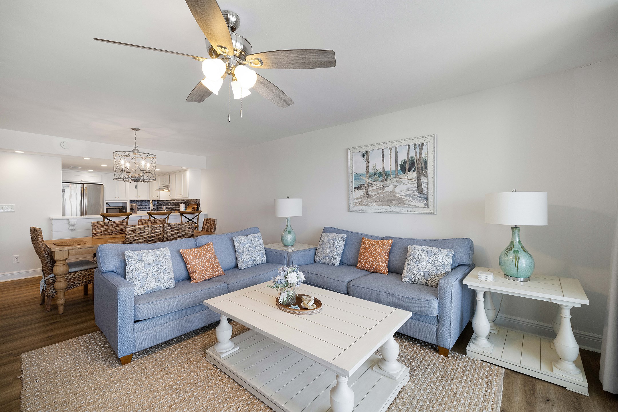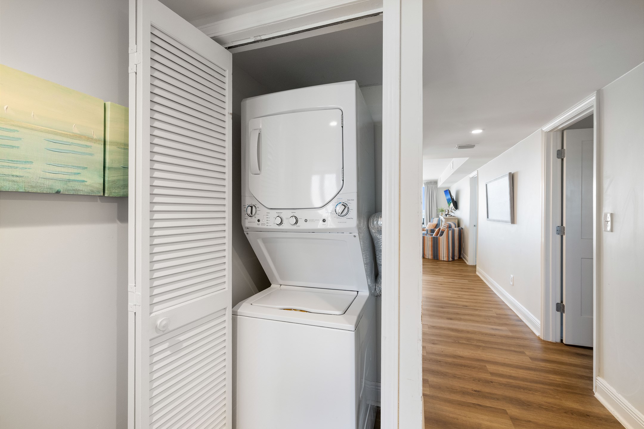 The condo's living area is designed for relaxation and socializing, featuring a sofa sleeper that expands the sleeping arrangements, making it perfect for larger families or groups. The fully equipped kitchen caters to all your culinary needs, featuring a Keurig Duo coffee maker and everything you need to prepare anything from a quick snack to a full family feast. A washer and dryer in the unit add an extra layer of convenience, allowing you to pack light and keep your beachwear fresh.
