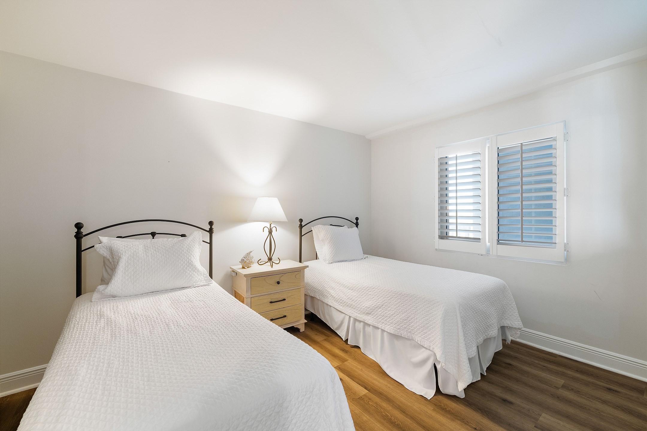 The Primary suite is a serene retreat, boasting a plush King bed, private balcony access for intimate sea gazing, and an ensuite full bath for your convenience. The second bedroom, equally inviting, features a comfortable Queen bed, creating a peaceful haven for restful nights. The third bedroom is versatile and cozy, furnished with two Twin beds, ideal for friends or younger guests.