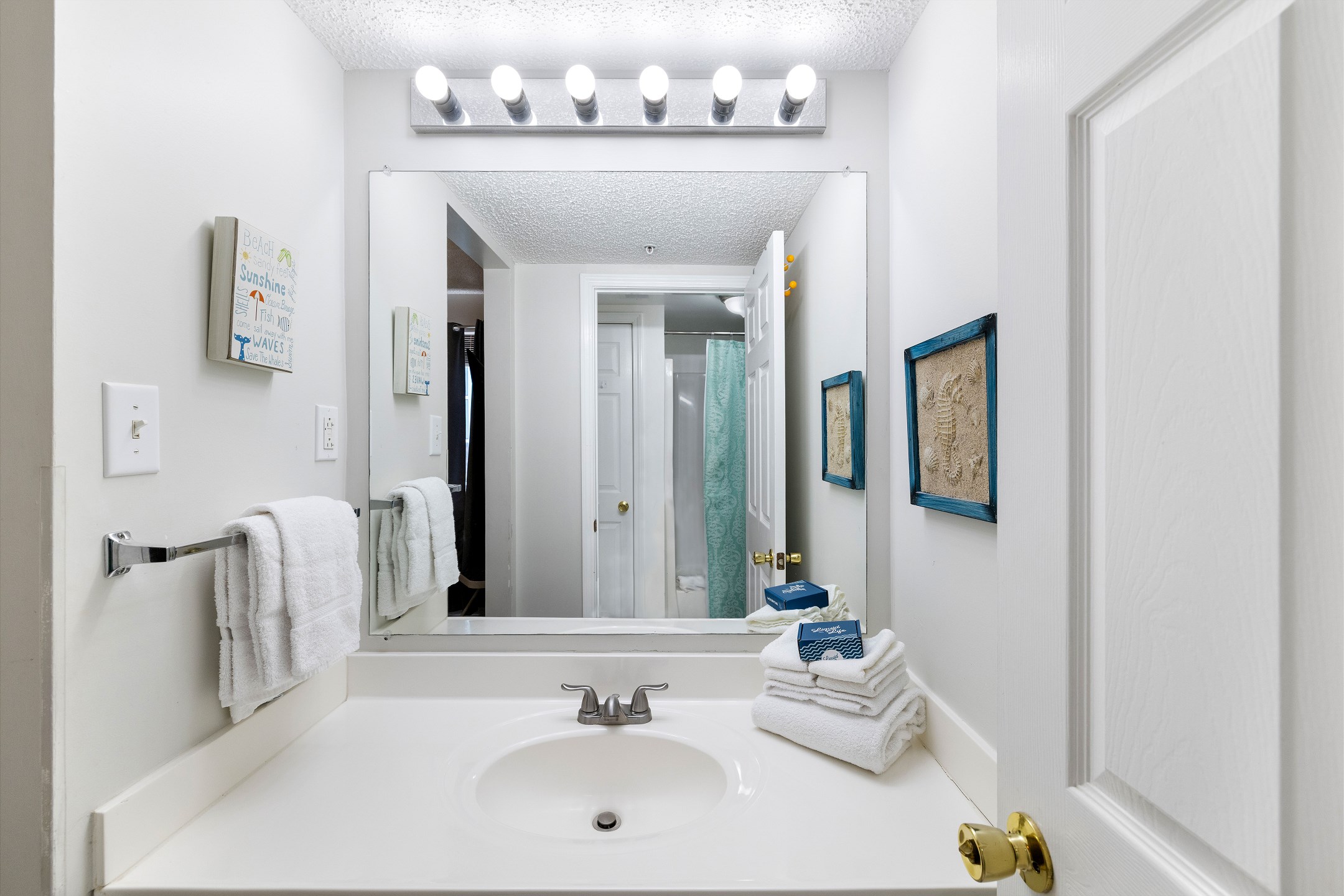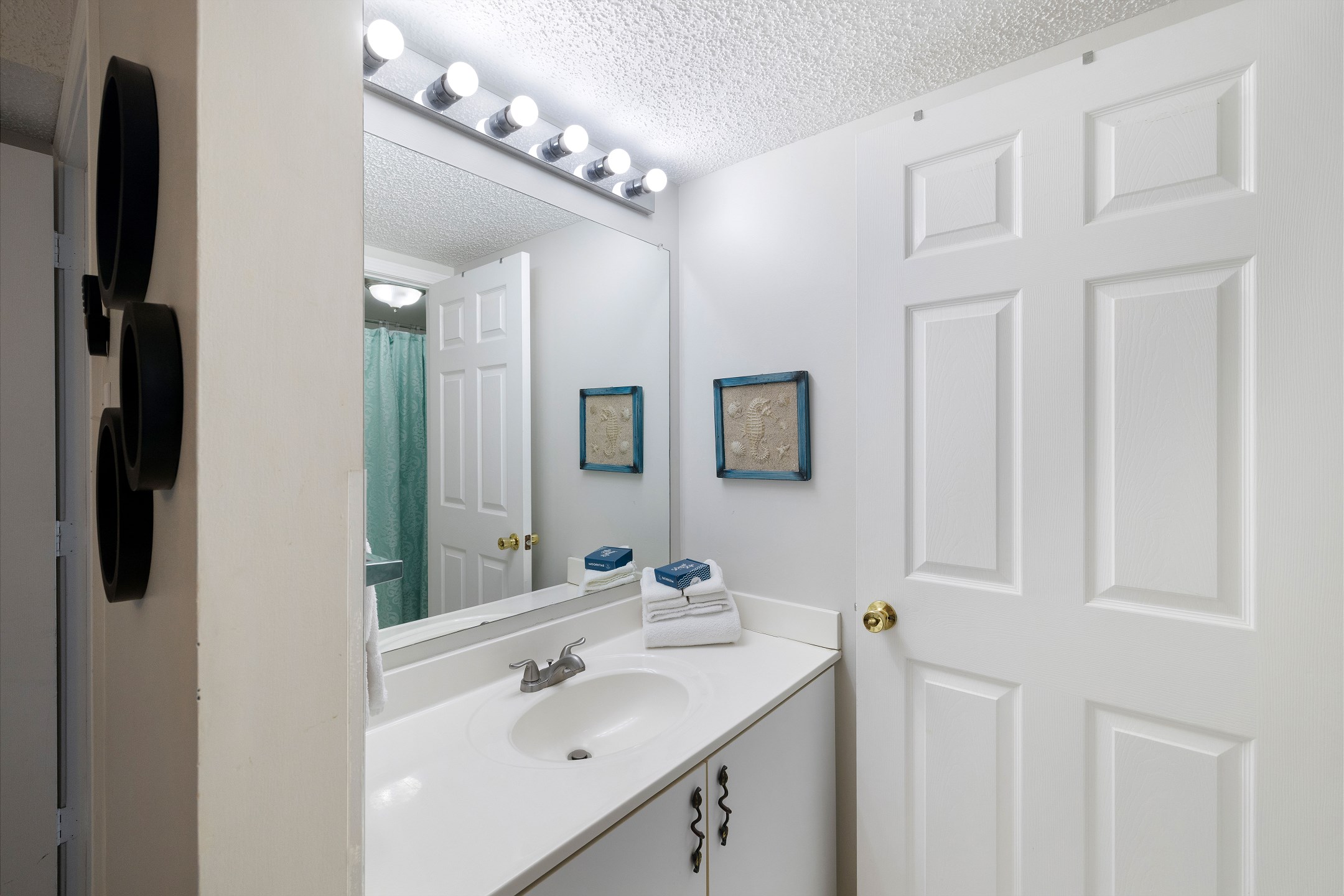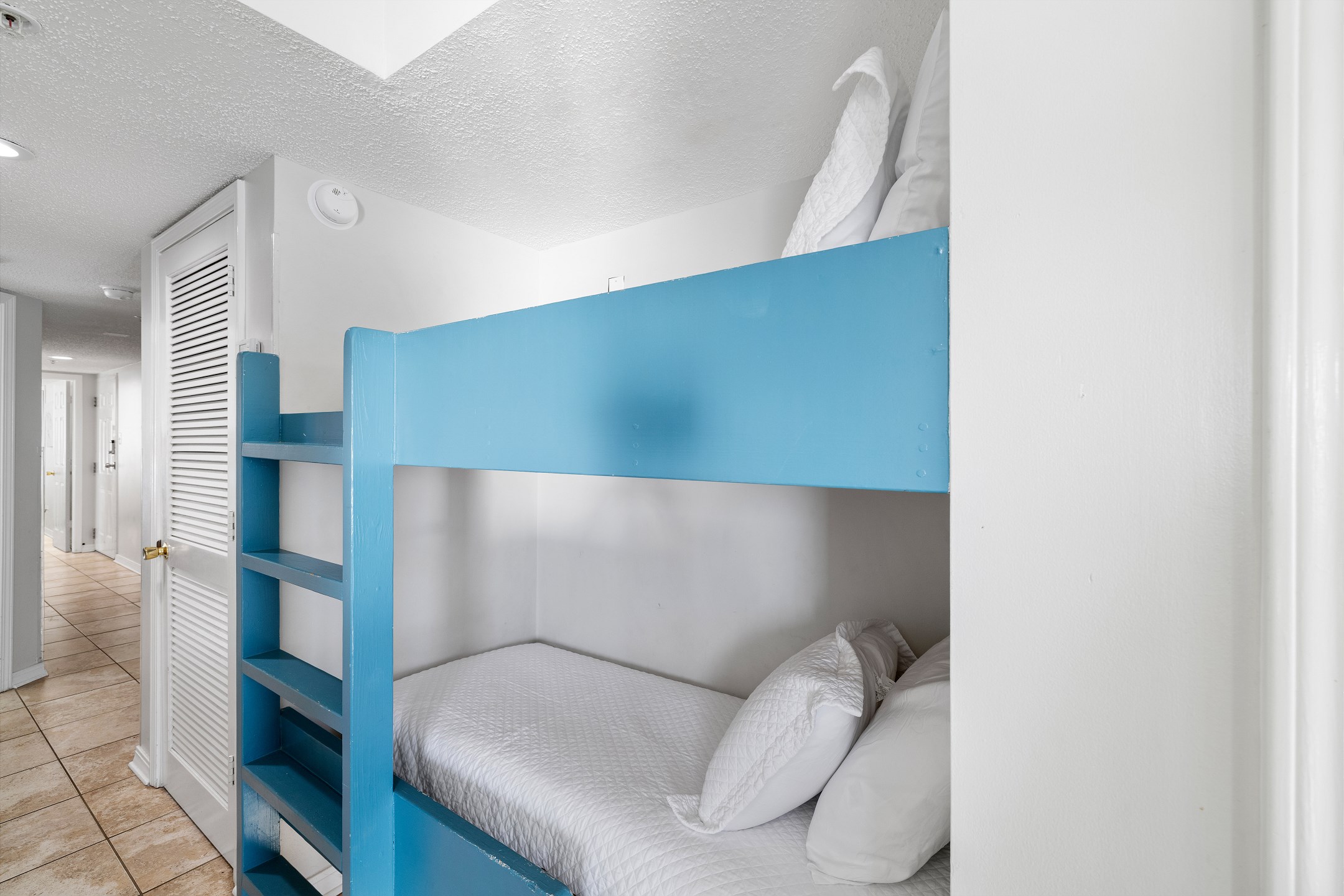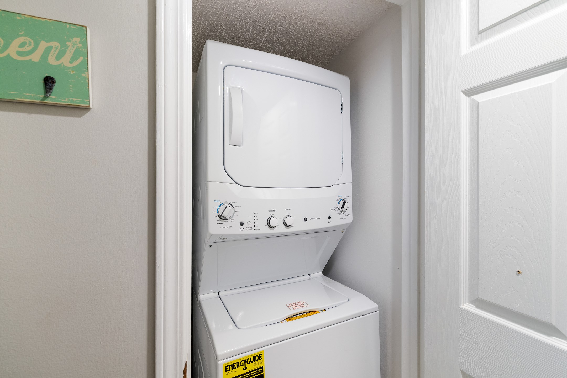 The primary bedroom features a king bed and an ensuite bathroom, while the second bedroom offers a cozy queen bed. Built-in twin-over-twin bunks in the hallway provide extra sleeping space, making this condo ideal for families or groups. A full-size washer and dryer in the unit add extra convenience for longer stays.