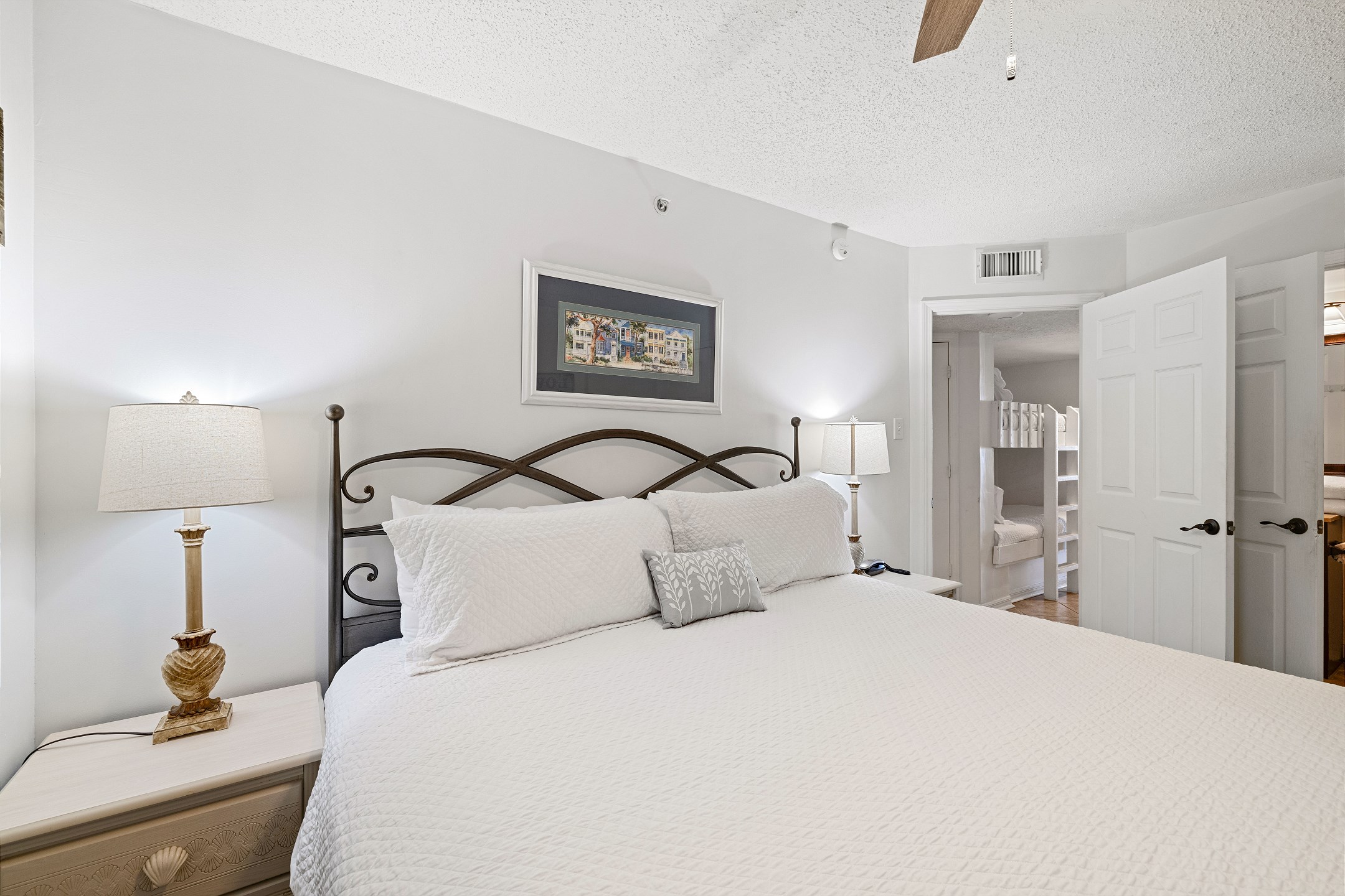 The primary bedroom offers a king-sized bed and an ensuite bathroom with a walk-in shower. Twin-over-twin bunk beds are located in the hallway, making great use of space for families or small groups.