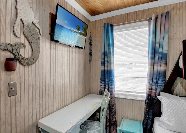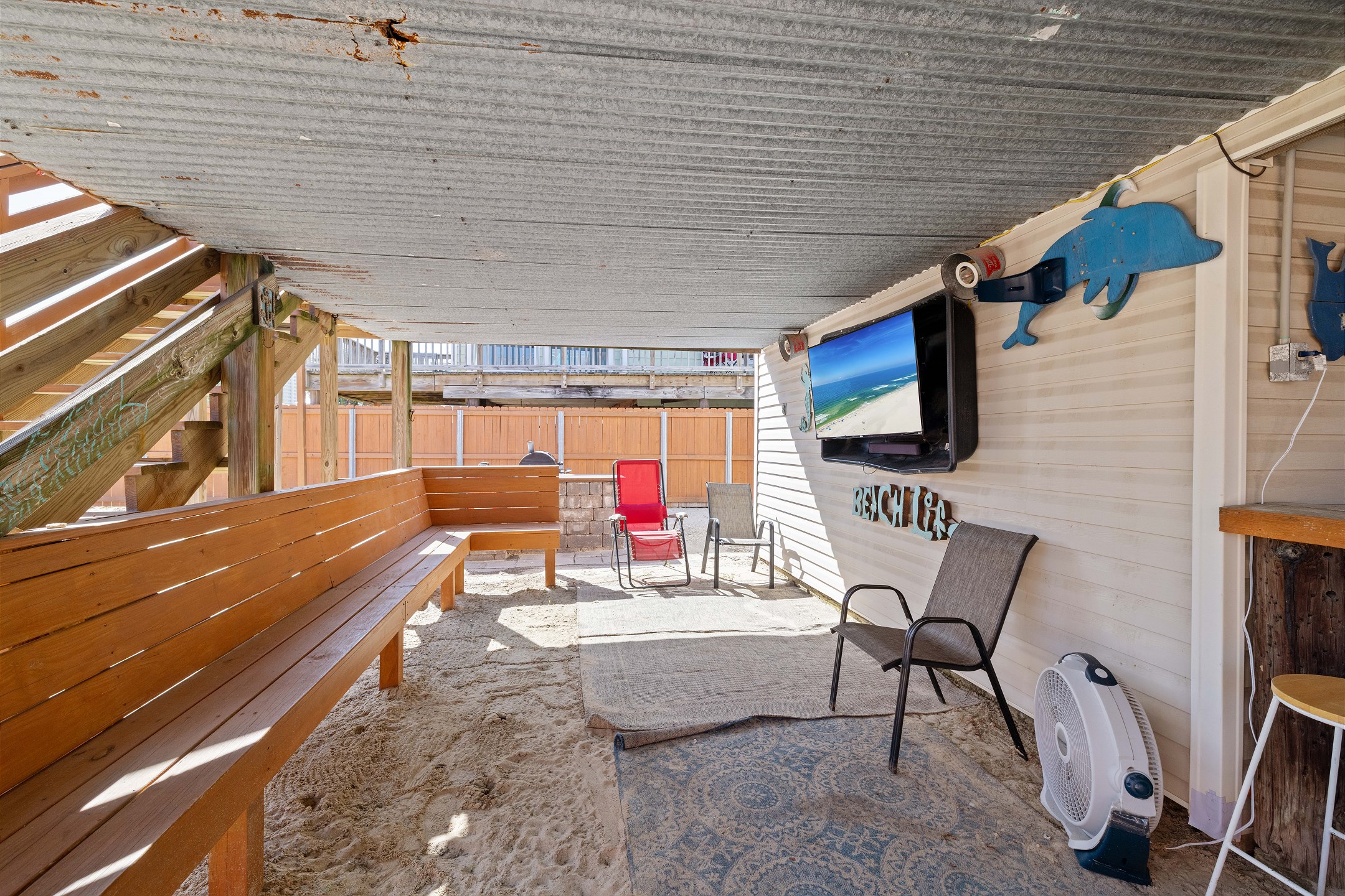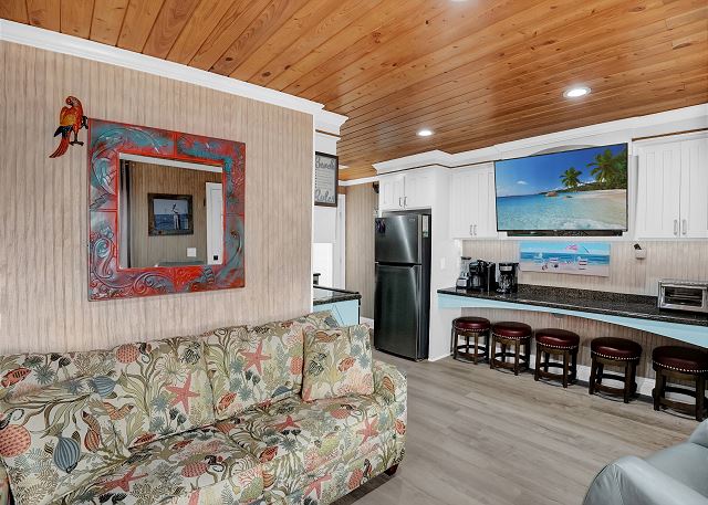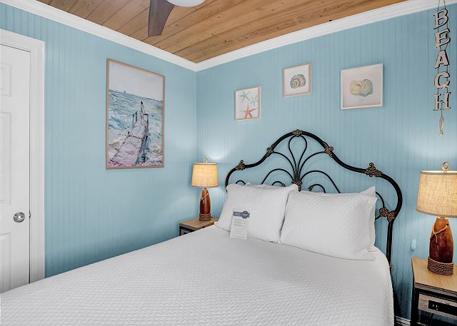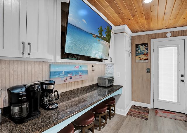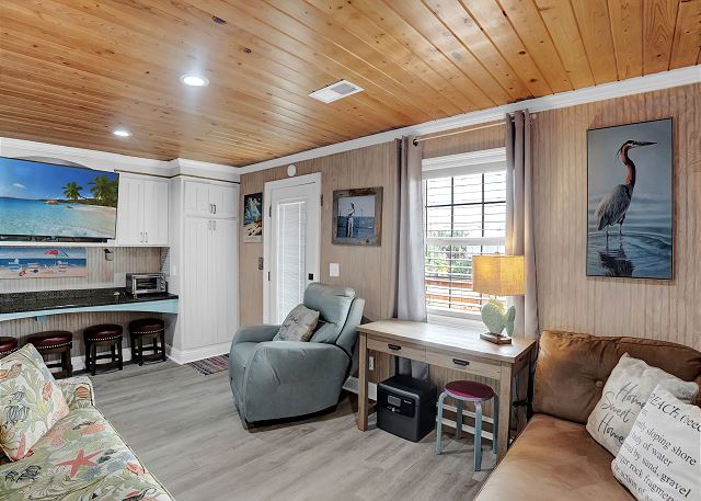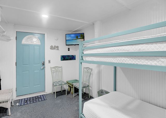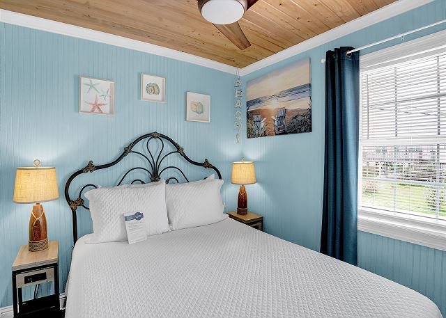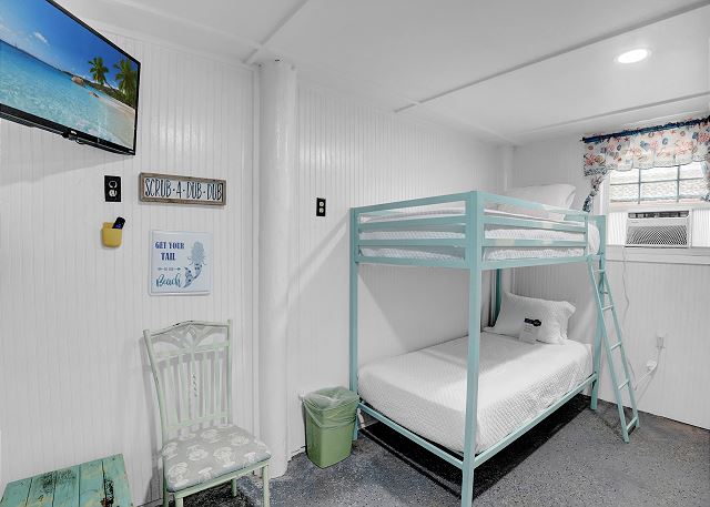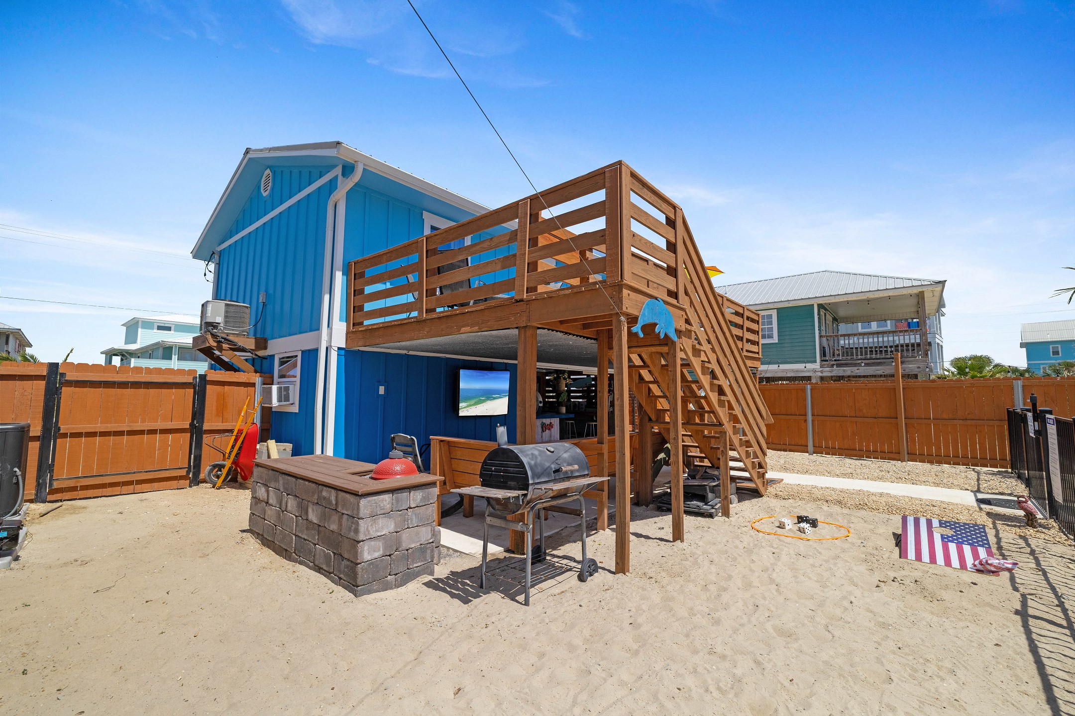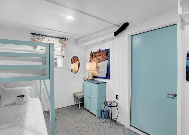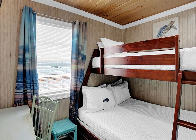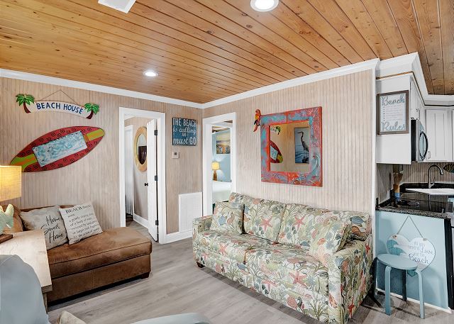 With 3 bedrooms and 2 bathrooms, this beach house comfortably sleeps 8 guests. The downstairs bunk room with twin bunks has a separate entrance, making it an ideal space for kids or additional guests. The living room features a queen sleeper sofa for added flexibility. The primary bedroom upstairs has a queen bed, followed by a guest bedroom furnished with a queen bed as well, for added comfort. Enjoy entertainment on the flat-screen TVs in the living room.