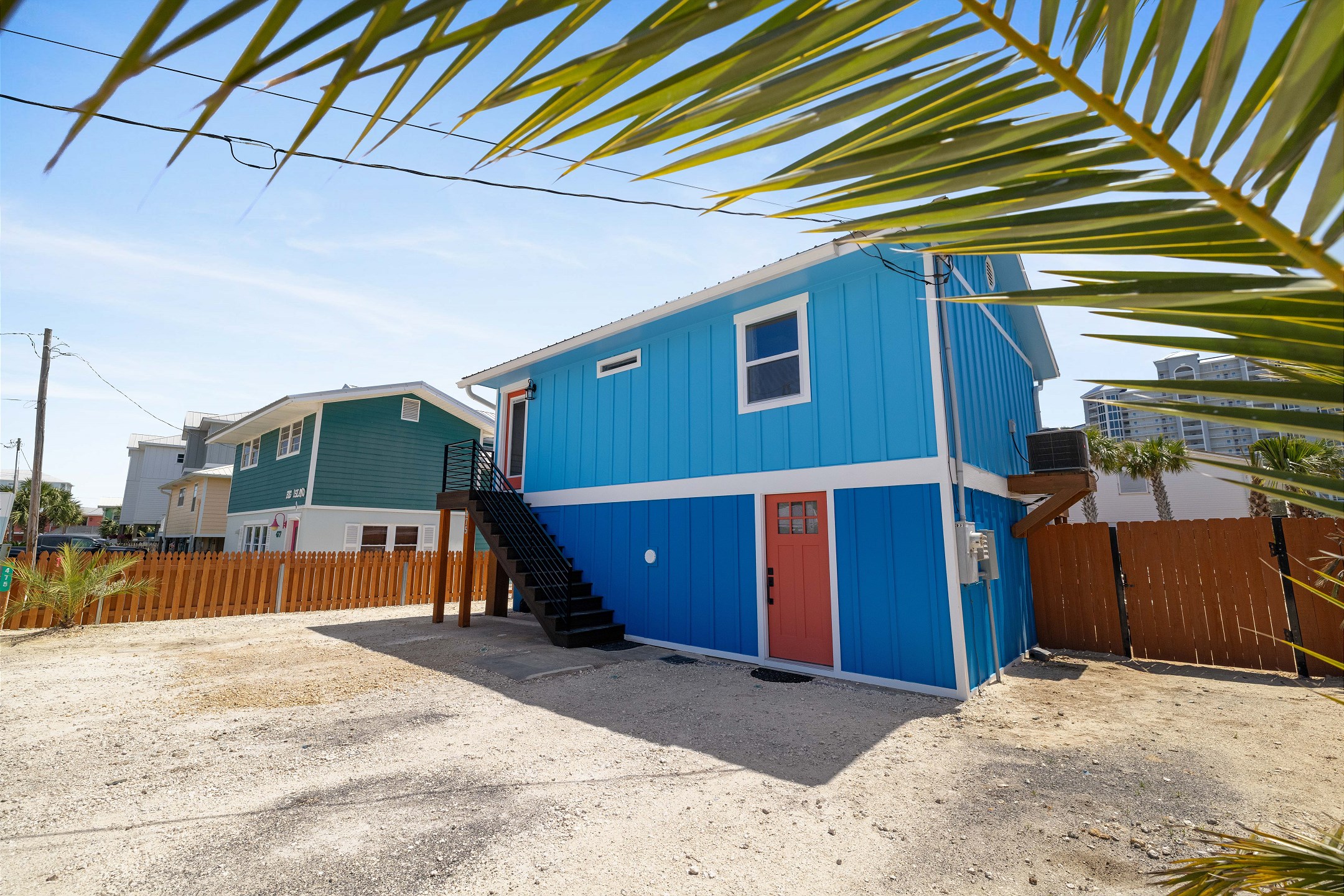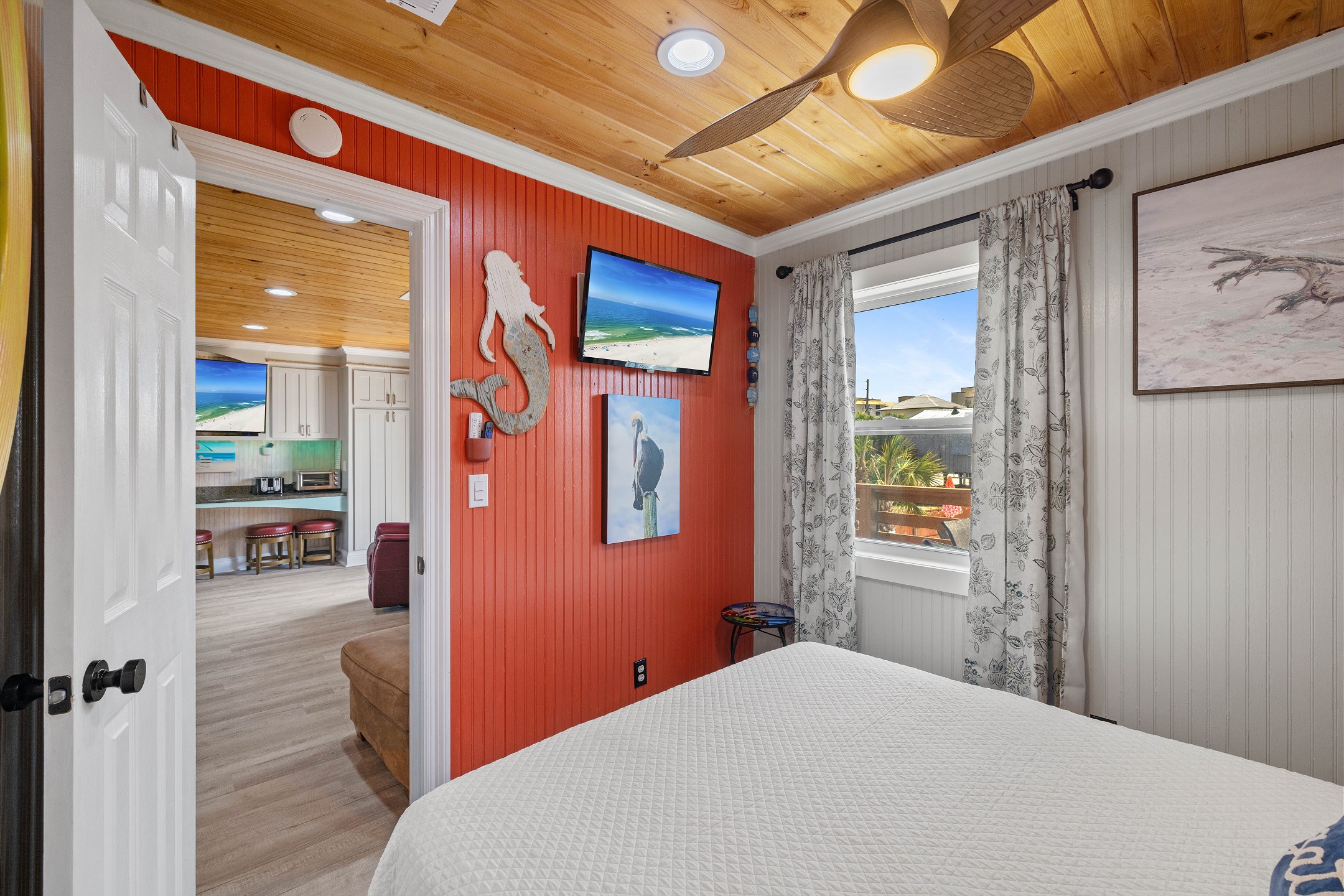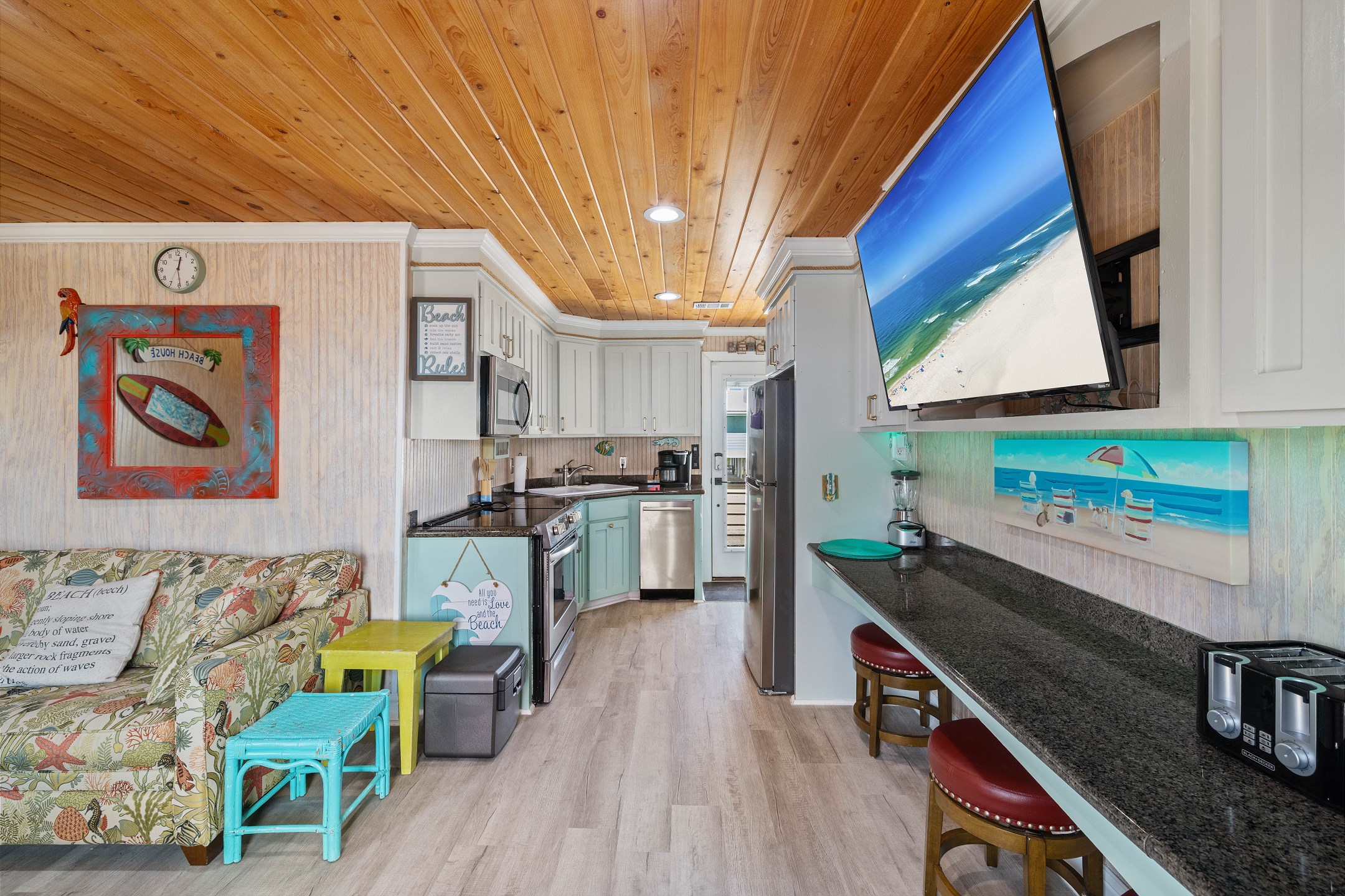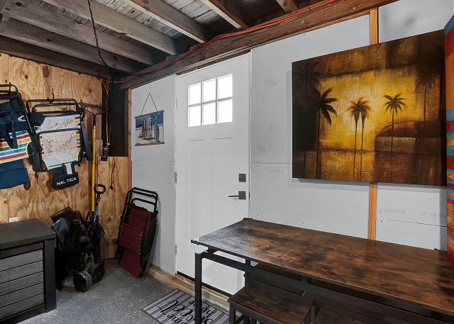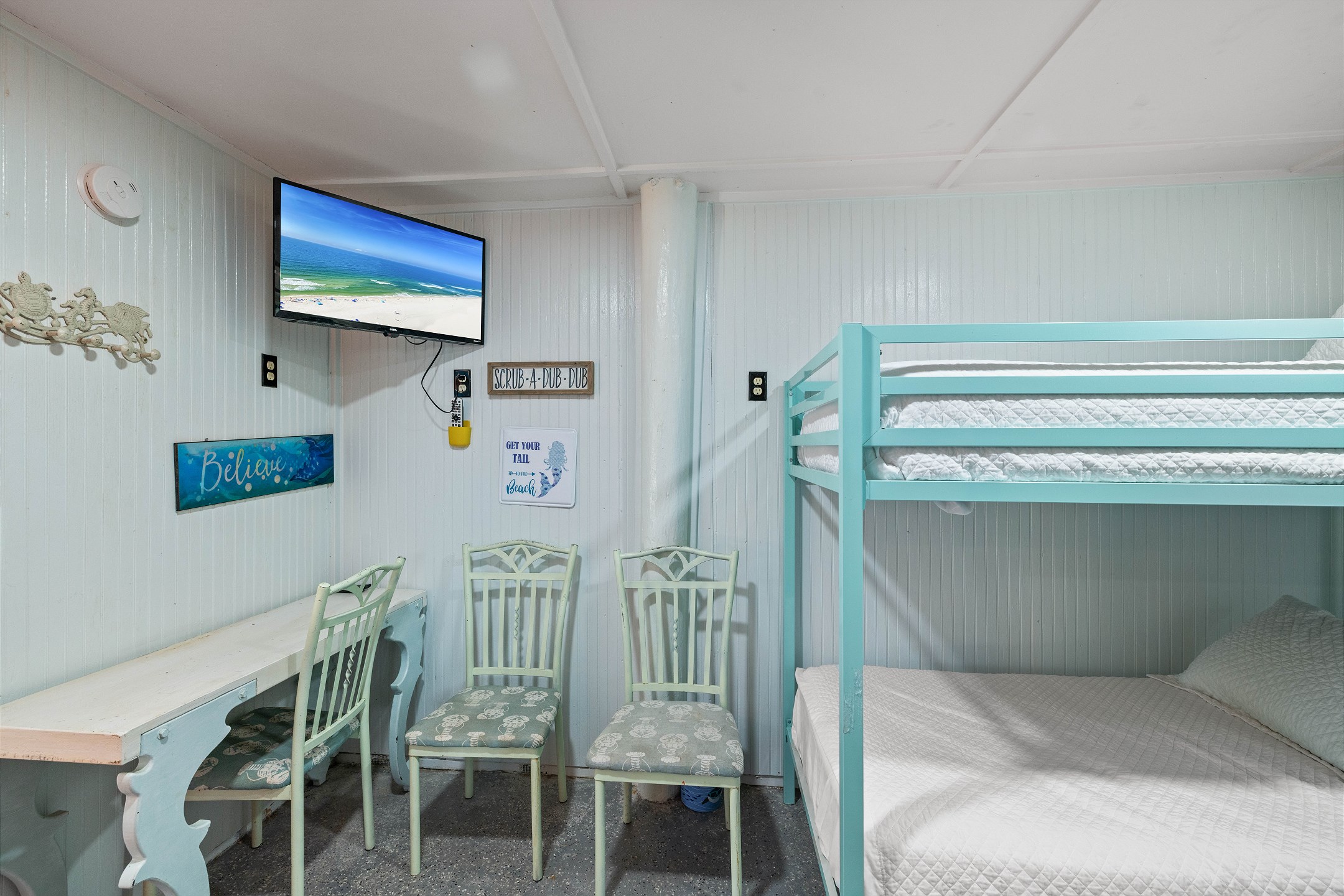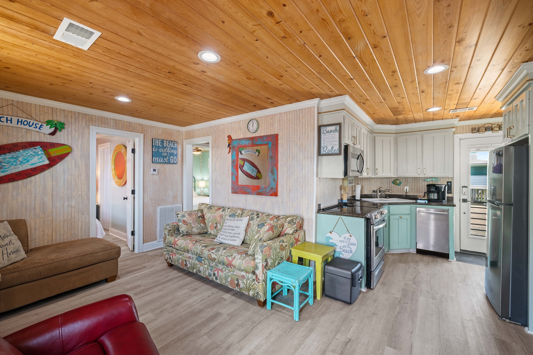 With 3 bedrooms and 2 bathrooms, this beach house comfortably sleeps 8 guests. The downstairs bunk room with twin bunks has a separate entrance, making it an ideal space for kids or additional guests. The living room features a queen sleeper sofa for added flexibility. The primary bedroom upstairs has a queen bed, followed by a guest bedroom furnished with a queen bed as well, for added comfort. Enjoy entertainment on the flat-screen TVs in the living room.