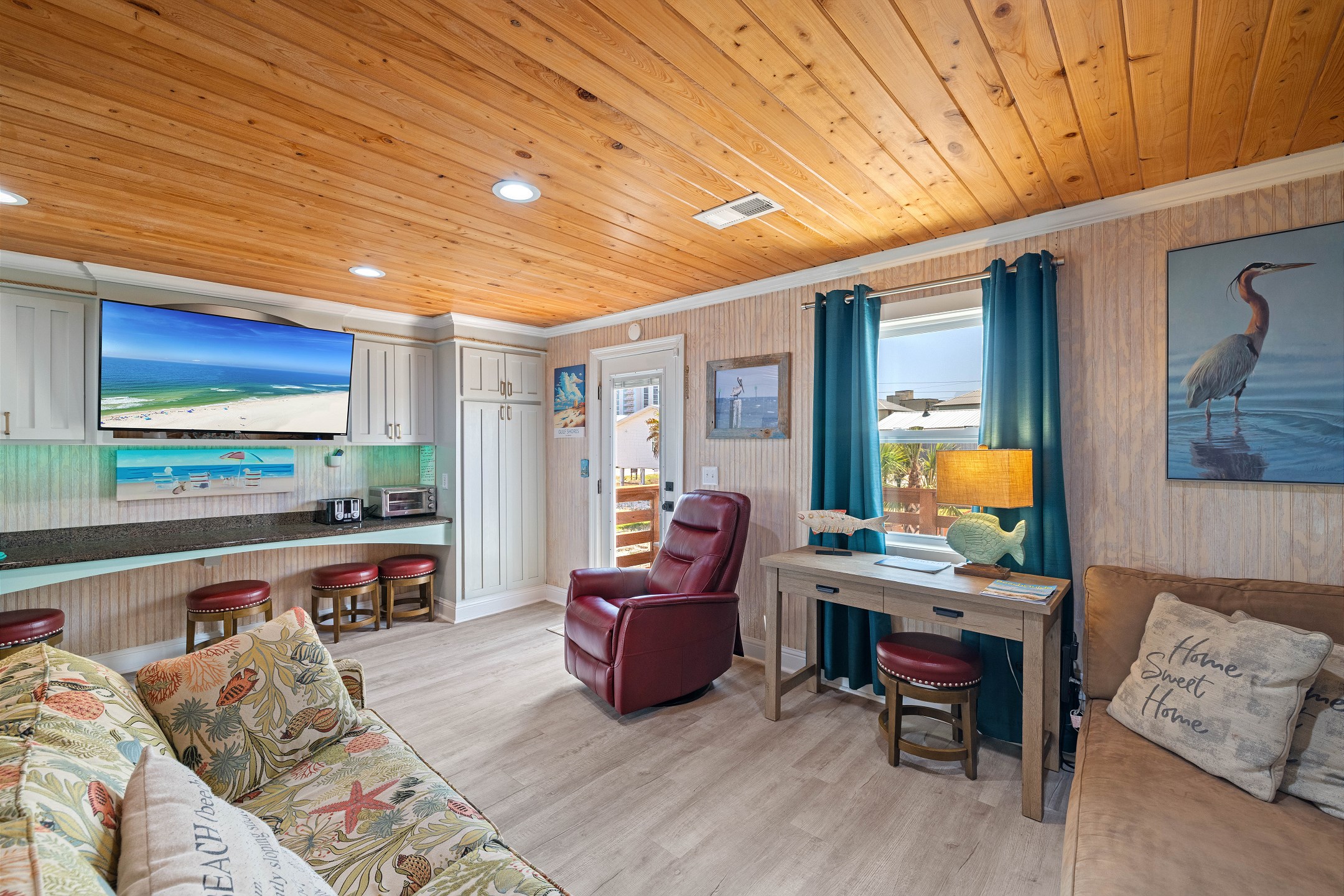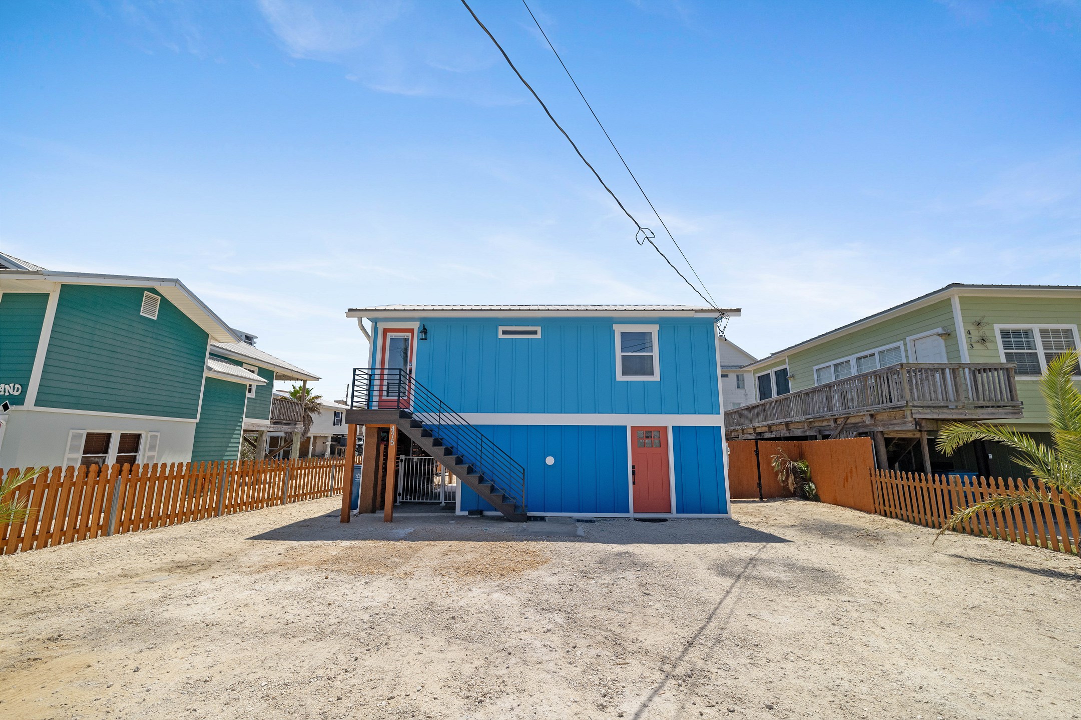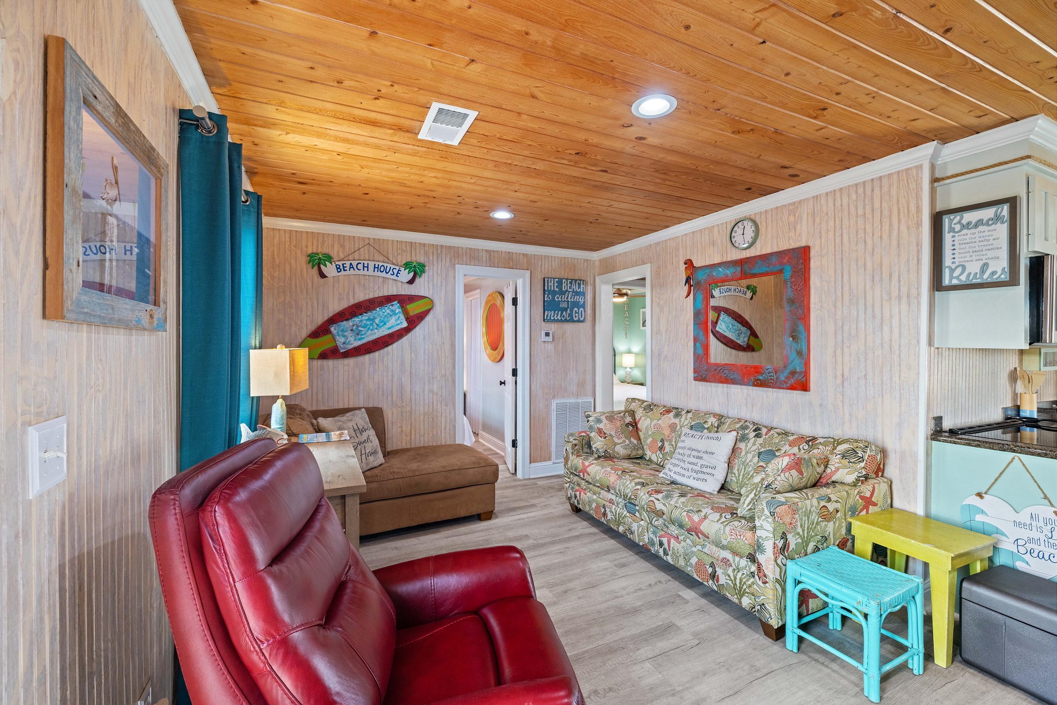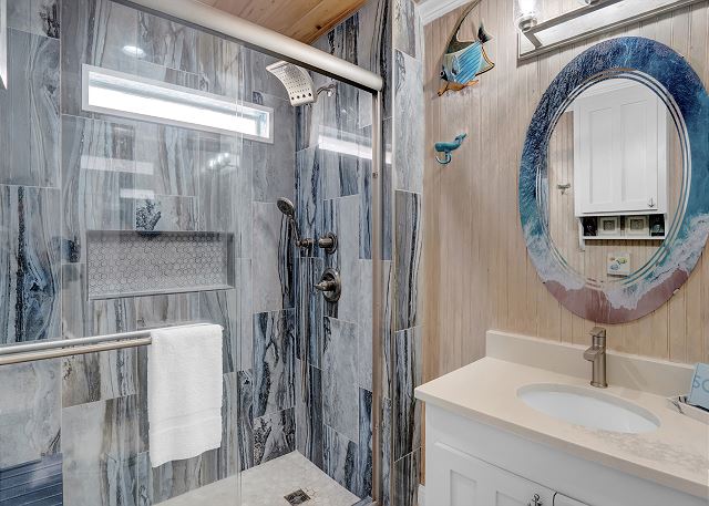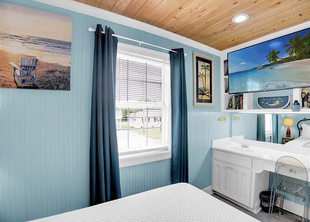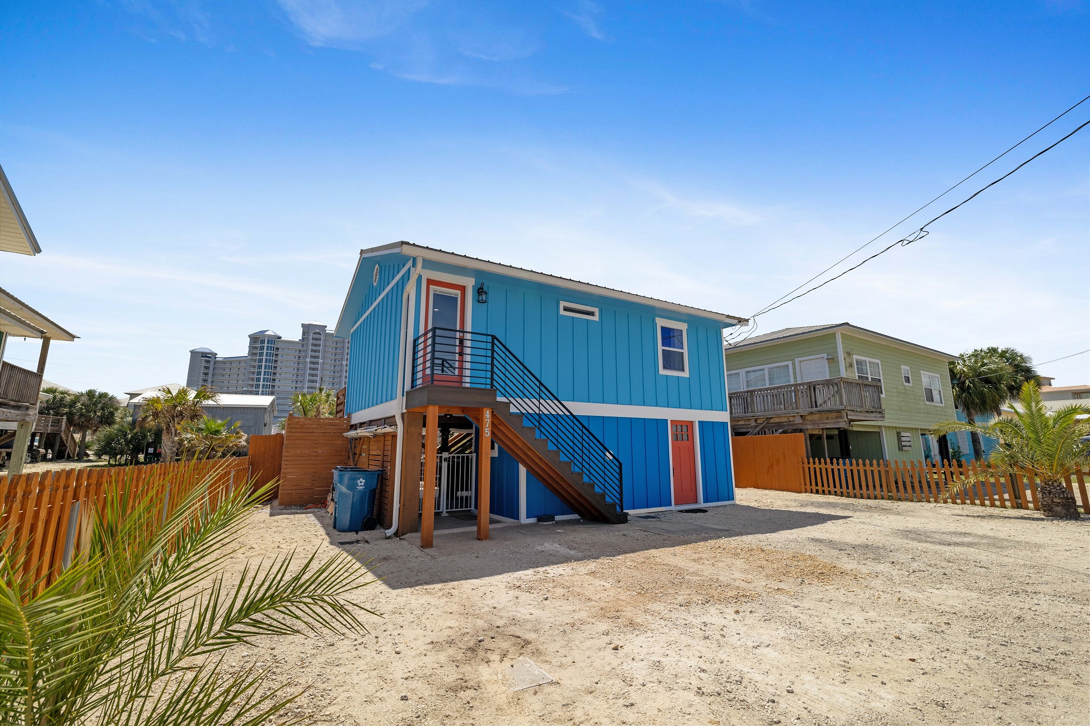 With 3 bedrooms and 2 bathrooms, this beach house comfortably sleeps 8 guests. The downstairs bunk room with twin bunks has a separate entrance, making it an ideal space for kids or additional guests. The living room features a queen sleeper sofa for added flexibility. The primary bedroom upstairs has a queen bed, followed by a guest bedroom furnished with a queen bed as well, for added comfort. Enjoy entertainment on the flat-screen TVs in the living room.