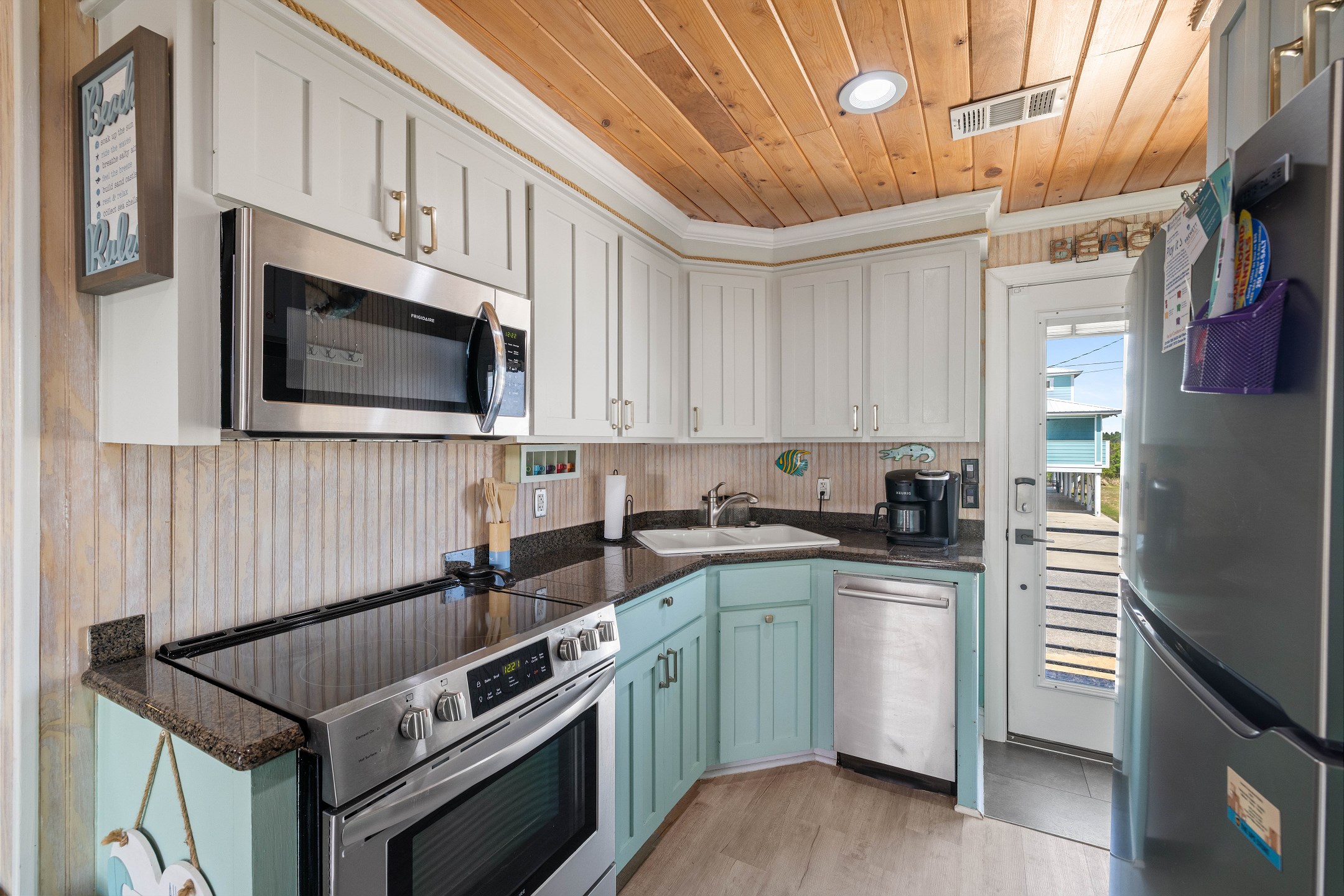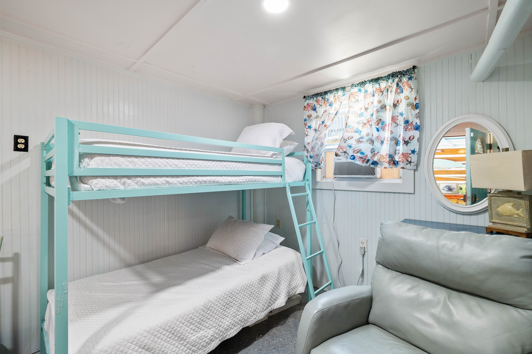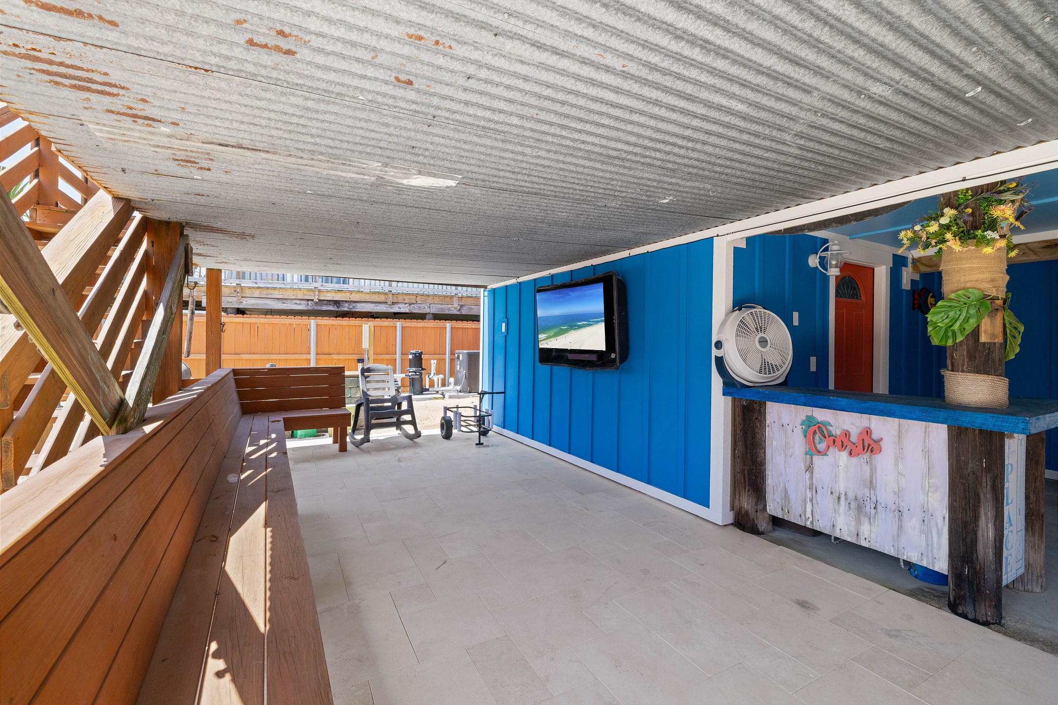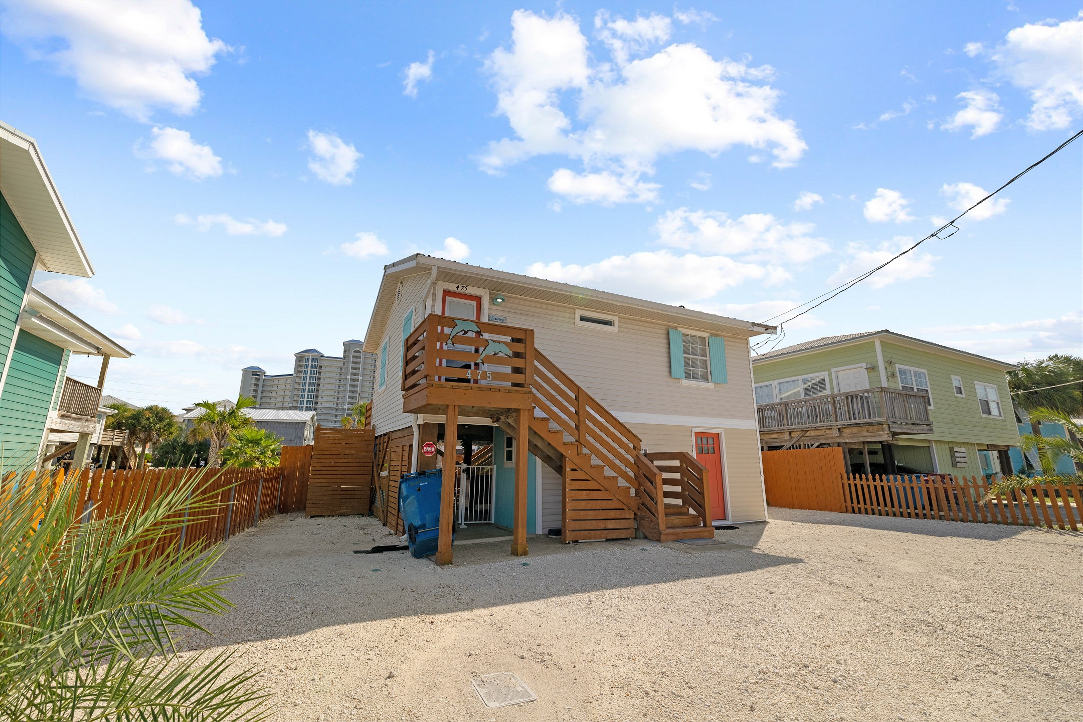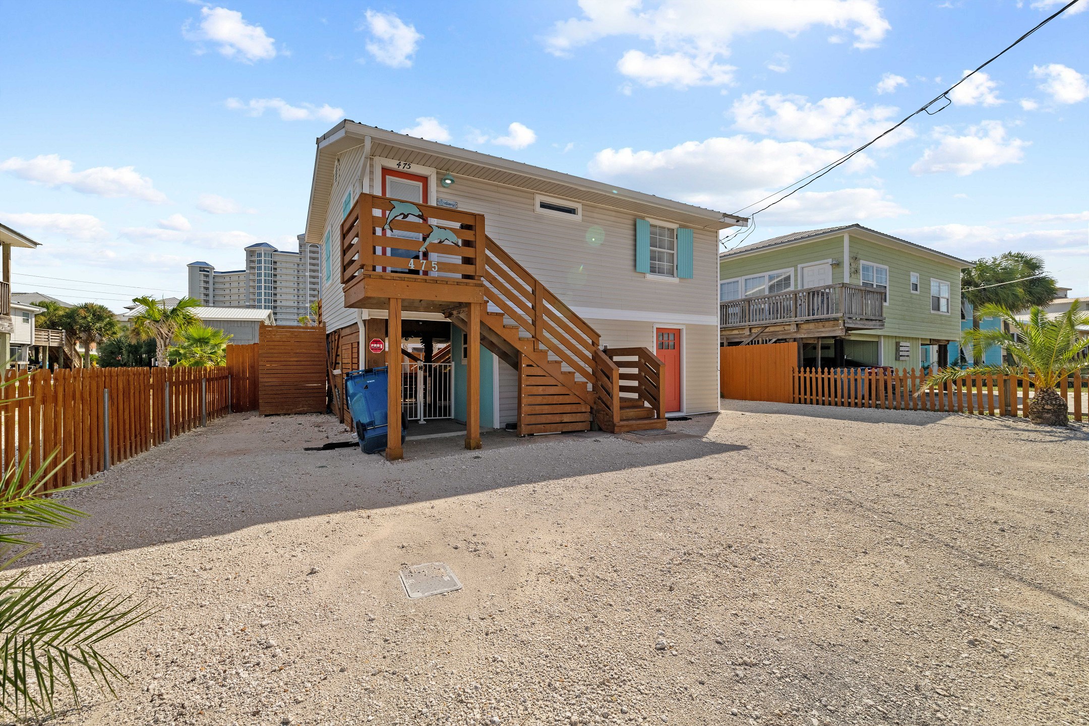 With 3 bedrooms and 2 bathrooms, this beach house comfortably sleeps 8 guests. The downstairs bunk room with twin bunks has a separate entrance, making it an ideal space for kids or additional guests. The living room features a queen sleeper sofa for added flexibility. The primary bedroom upstairs has a queen bed, followed by a guest bedroom furnished with a queen bed as well, for added comfort. Enjoy entertainment on the flat-screen TVs in the living room.