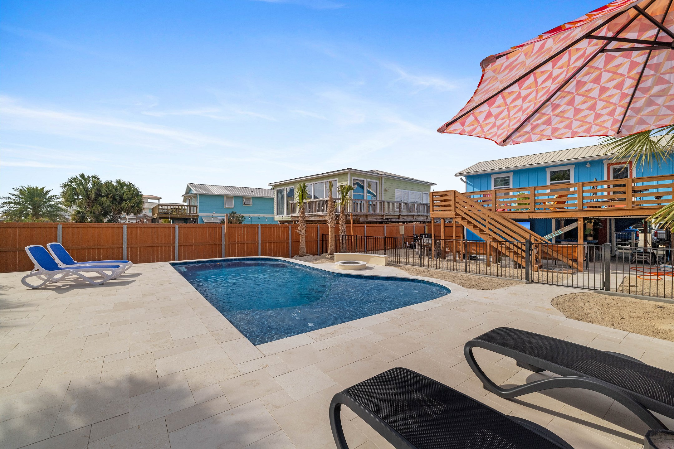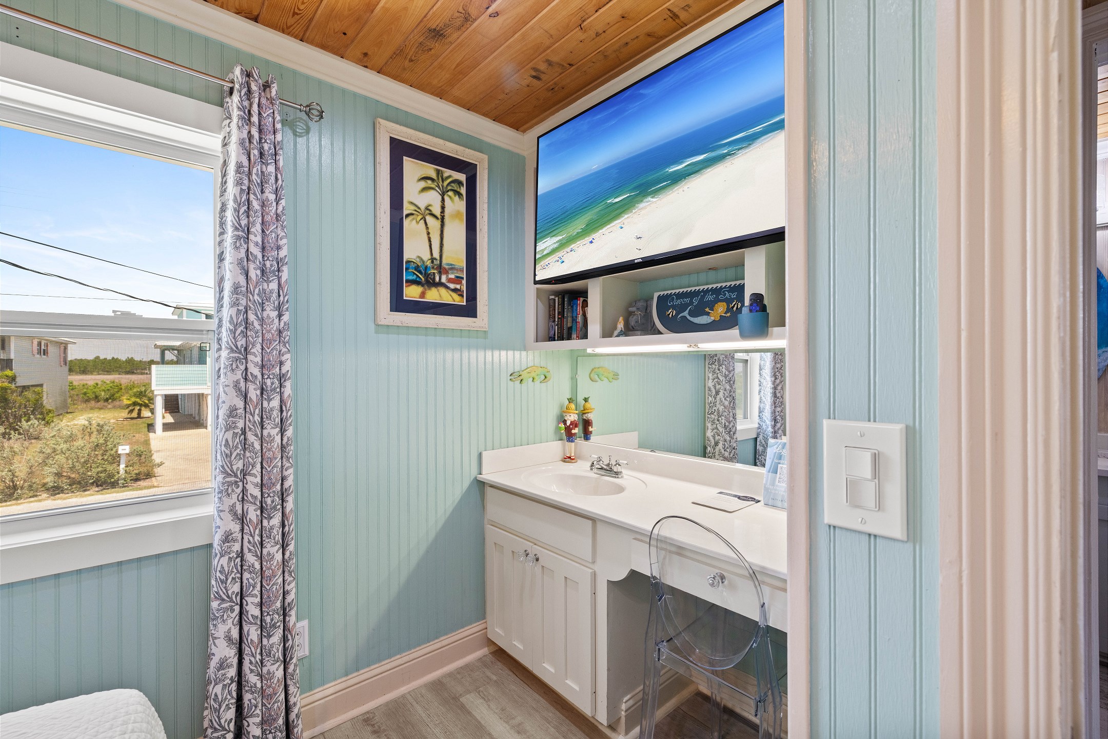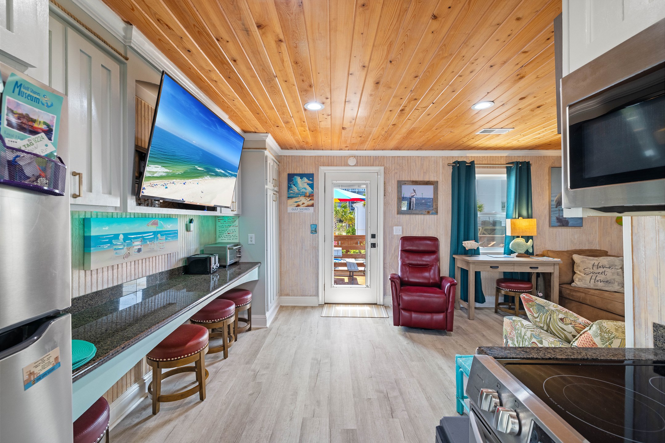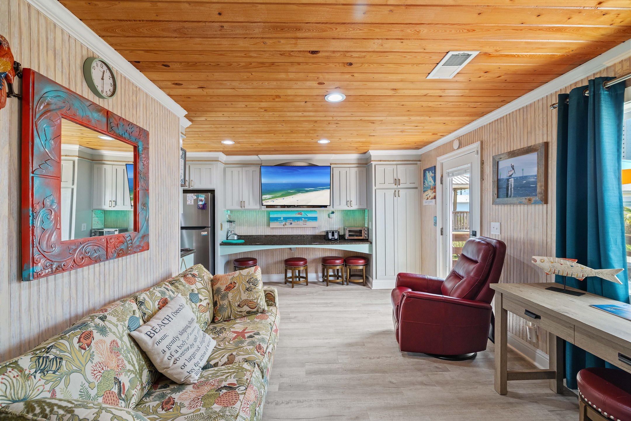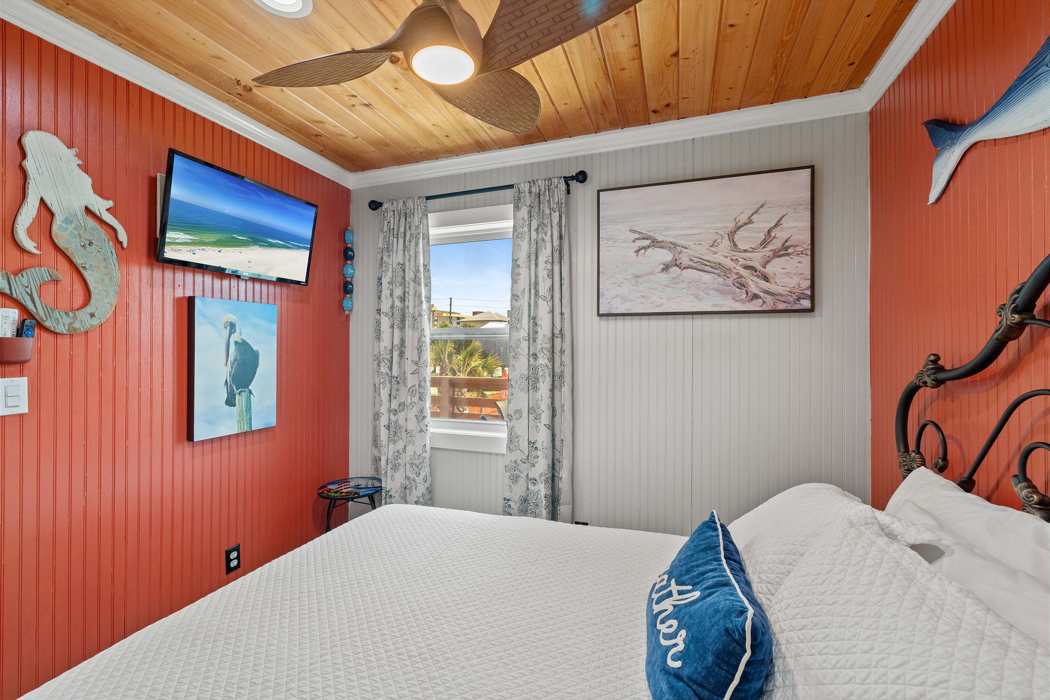With 3 bedrooms and 2 bathrooms, this beach house comfortably sleeps 8 guests. The downstairs bunk room with twin bunks has a separate entrance, making it an ideal space for kids or additional guests. The living room features a queen sleeper sofa for added flexibility. The primary bedroom upstairs has a queen bed, followed by a guest bedroom furnished with a queen bed as well, for added comfort. Enjoy entertainment on the flat-screen TVs in the living room.