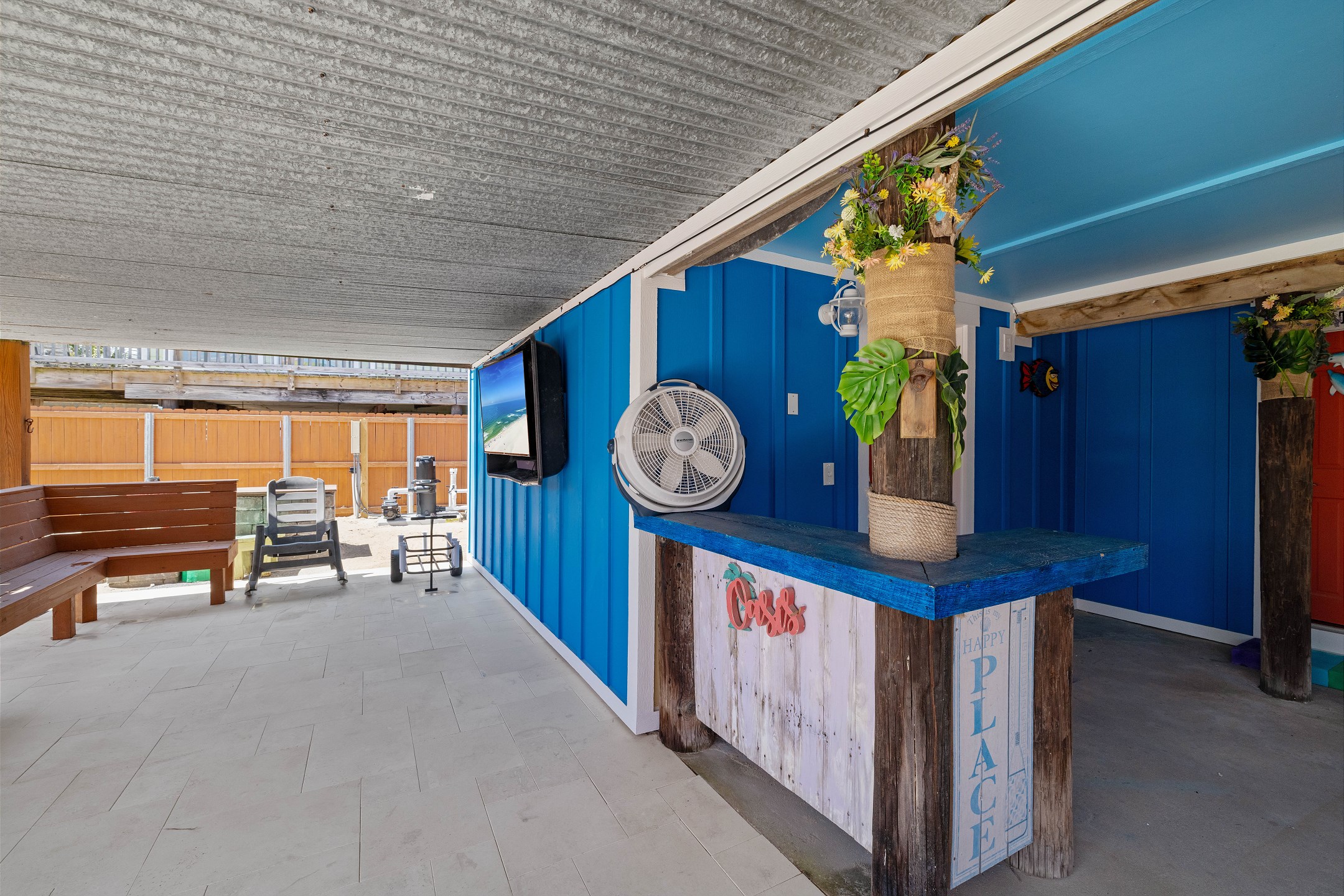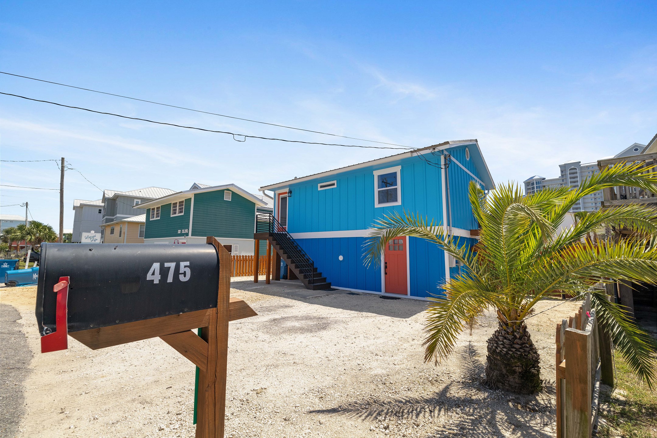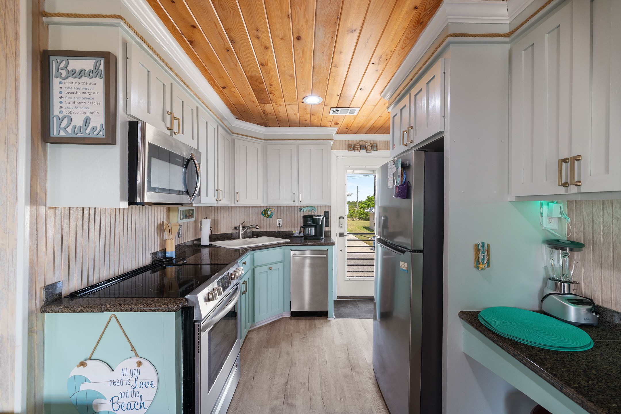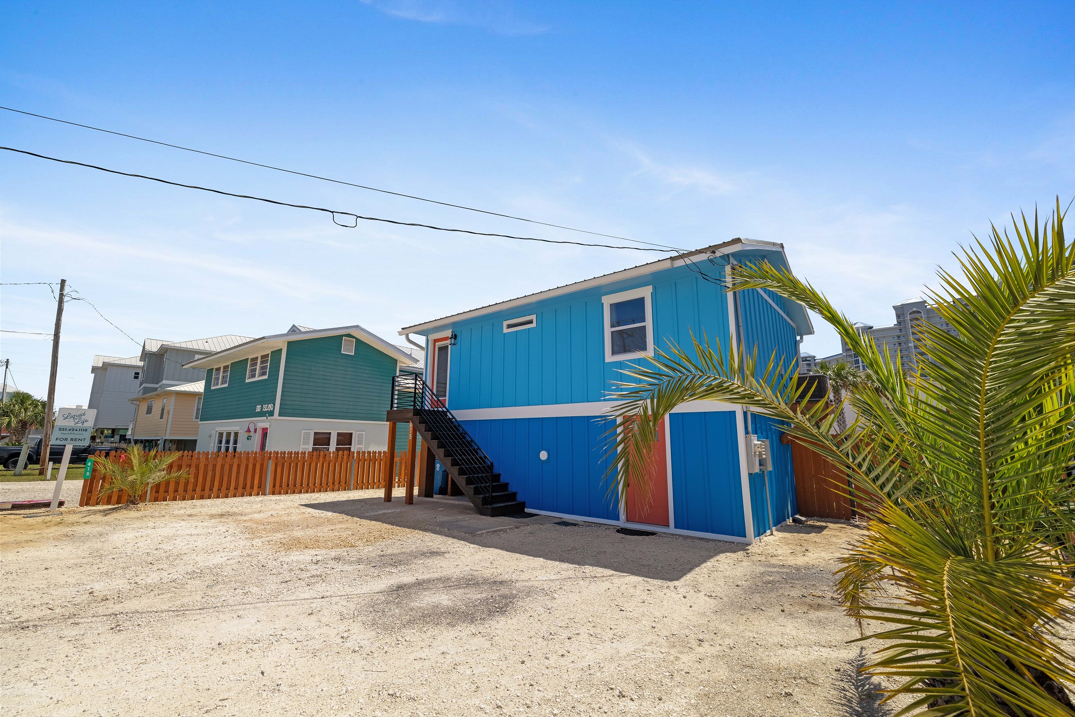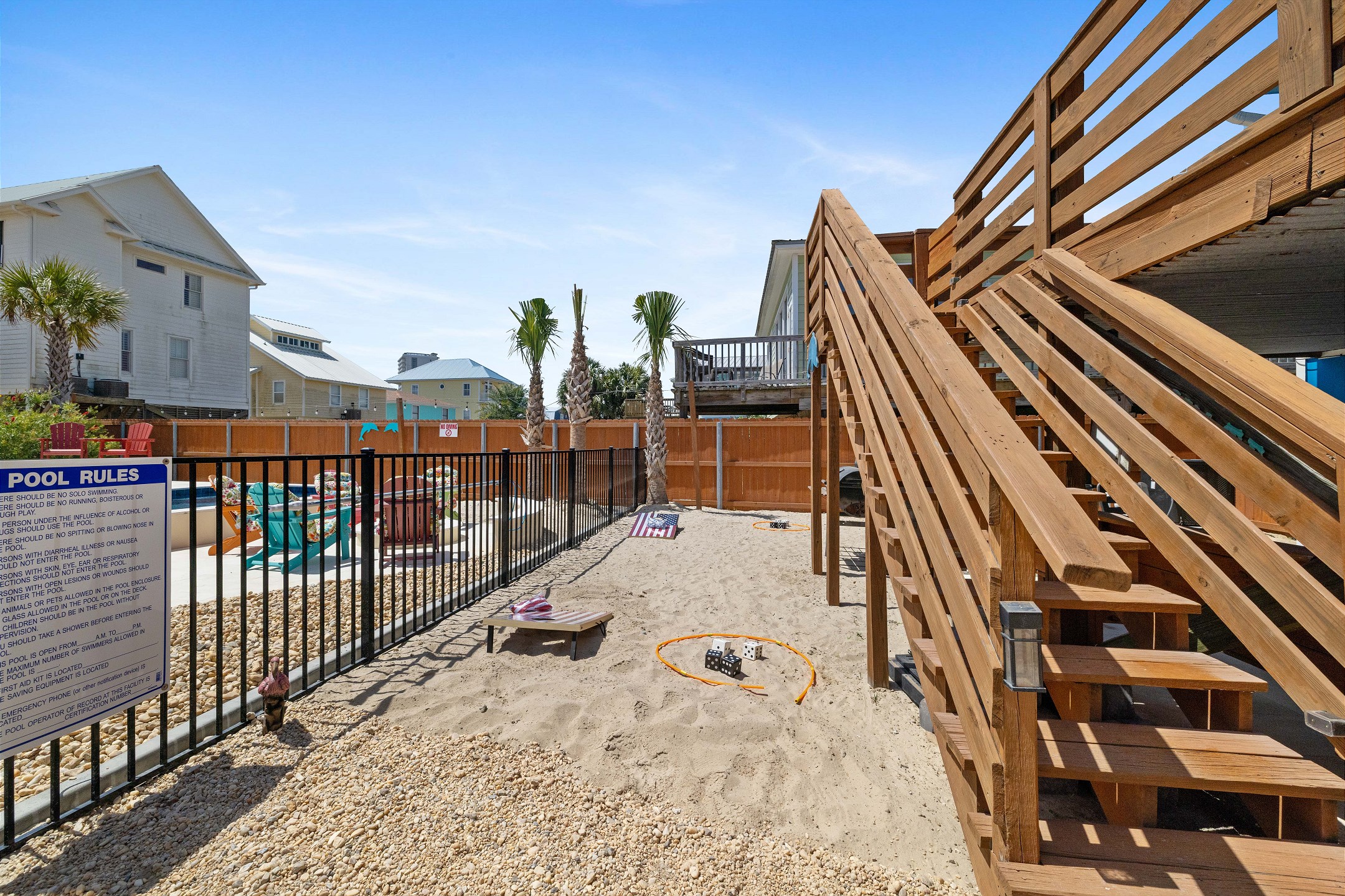 With 3 bedrooms and 2 bathrooms, this beach house comfortably sleeps 8 guests. The downstairs bunk room with twin bunks has a separate entrance, making it an ideal space for kids or additional guests. The living room features a queen sleeper sofa for added flexibility. The primary bedroom upstairs has a queen bed, followed by a guest bedroom furnished with a queen bed as well, for added comfort. Enjoy entertainment on the flat-screen TVs in the living room.