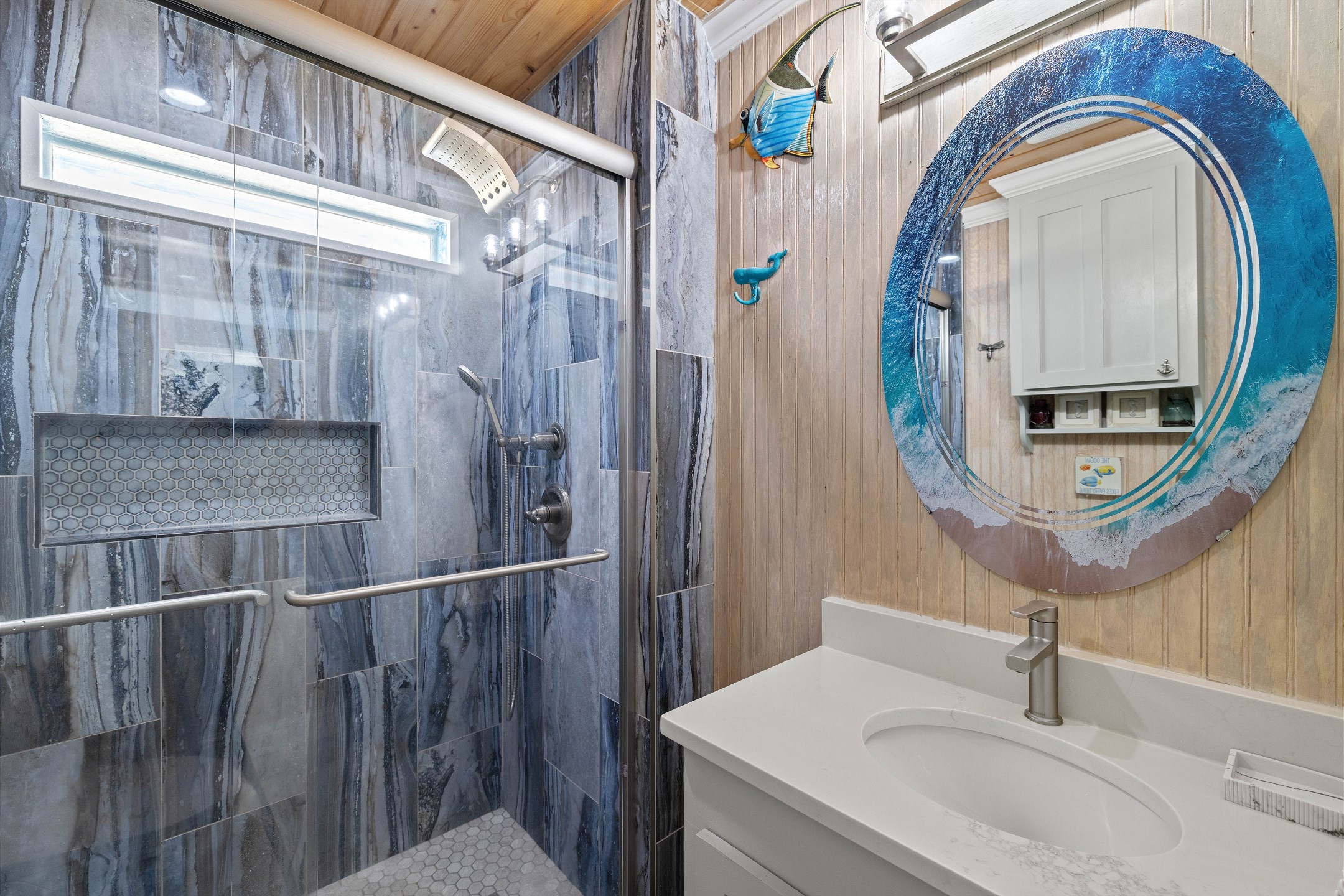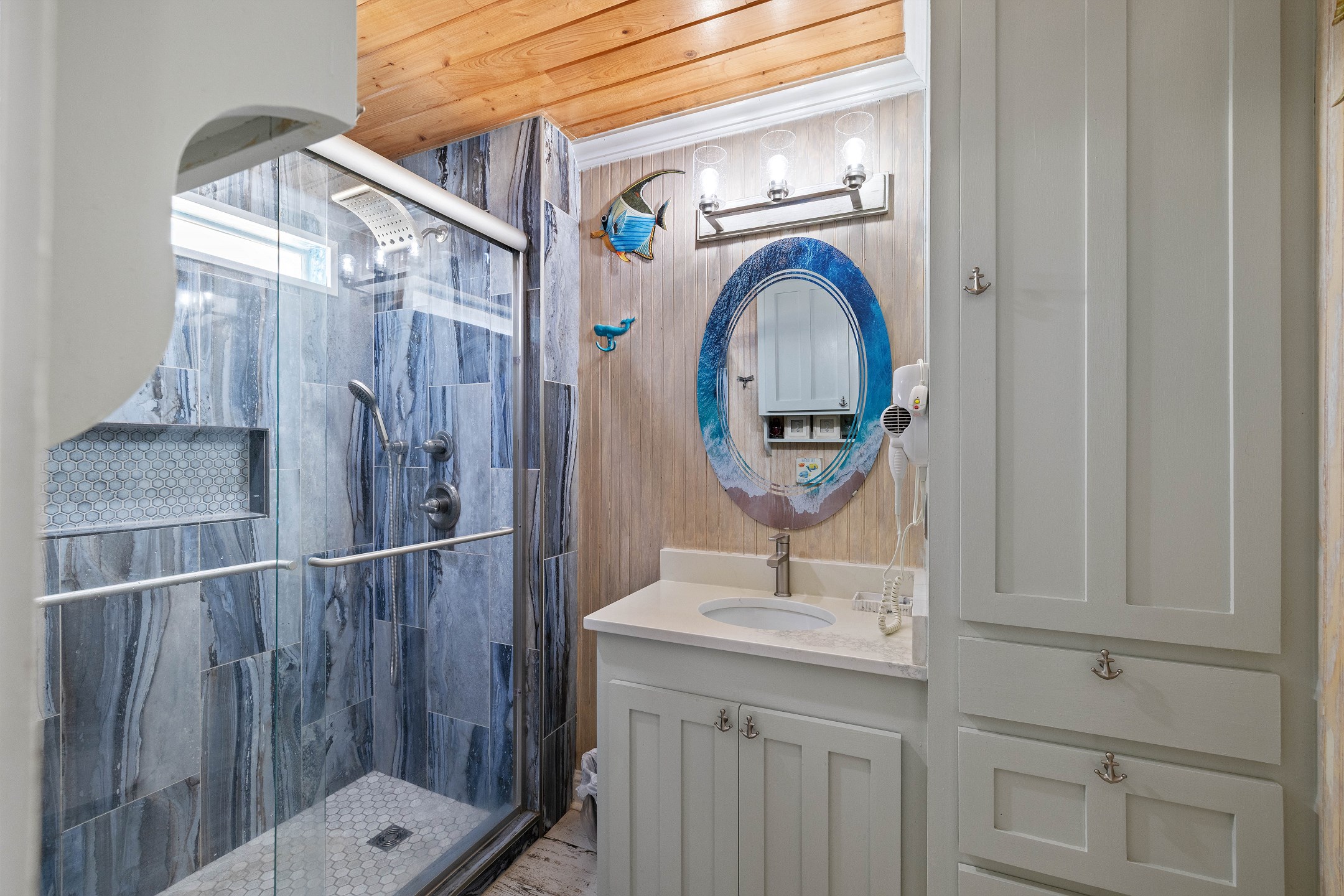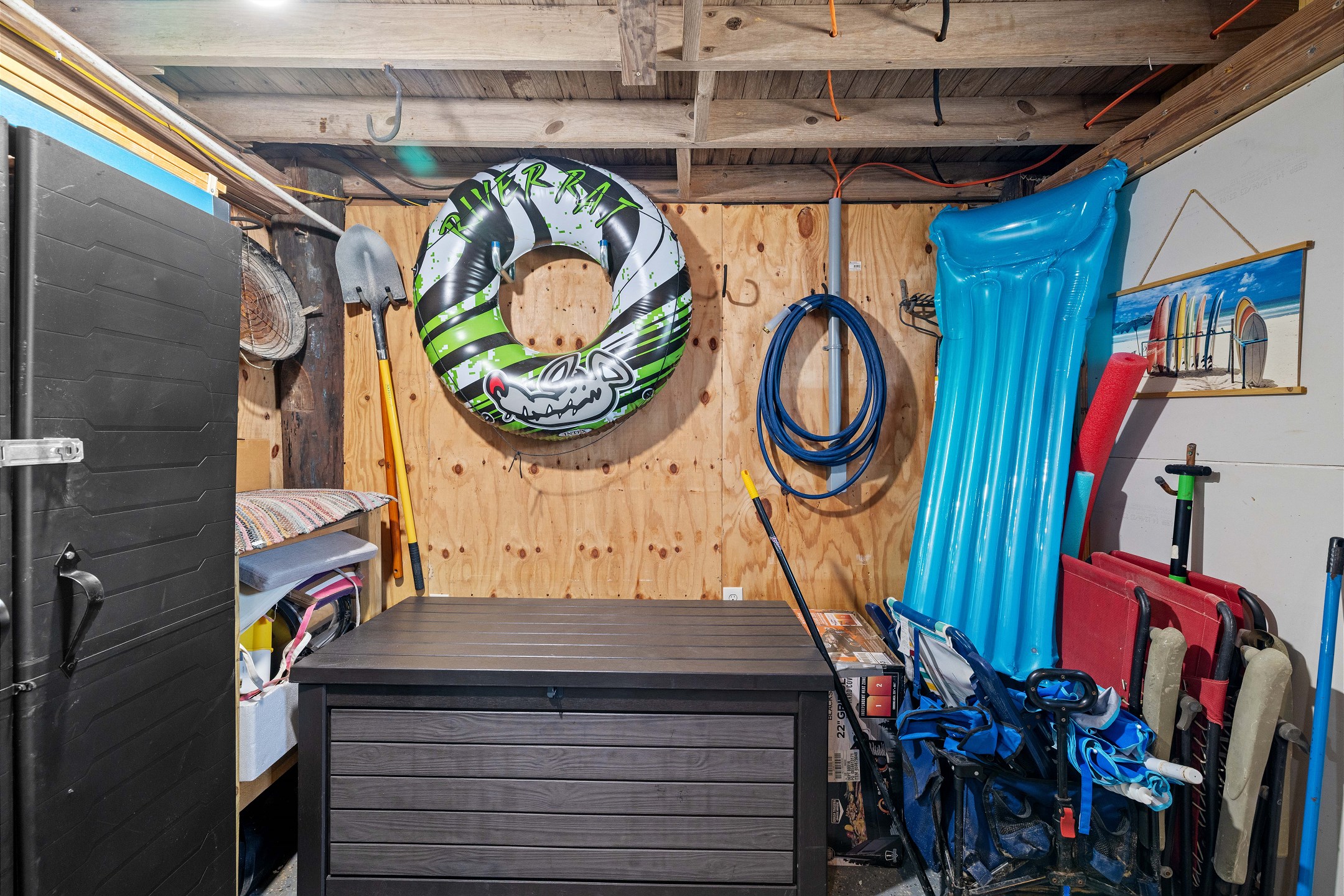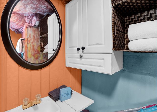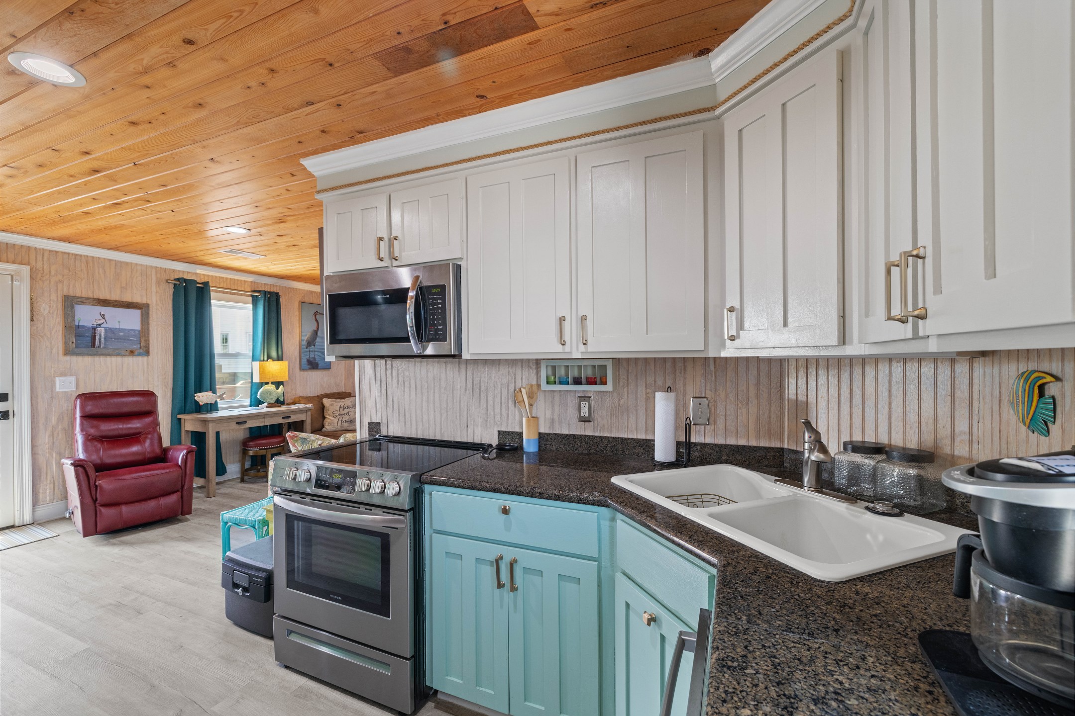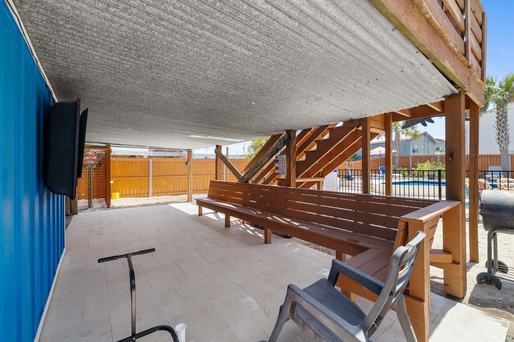 With 3 bedrooms and 2 bathrooms, this beach house comfortably sleeps 8 guests. The downstairs bunk room with twin bunks has a separate entrance, making it an ideal space for kids or additional guests. The living room features a queen sleeper sofa for added flexibility. The primary bedroom upstairs has a queen bed, followed by a guest bedroom furnished with a queen bed as well, for added comfort. Enjoy entertainment on the flat-screen TVs in the living room.
