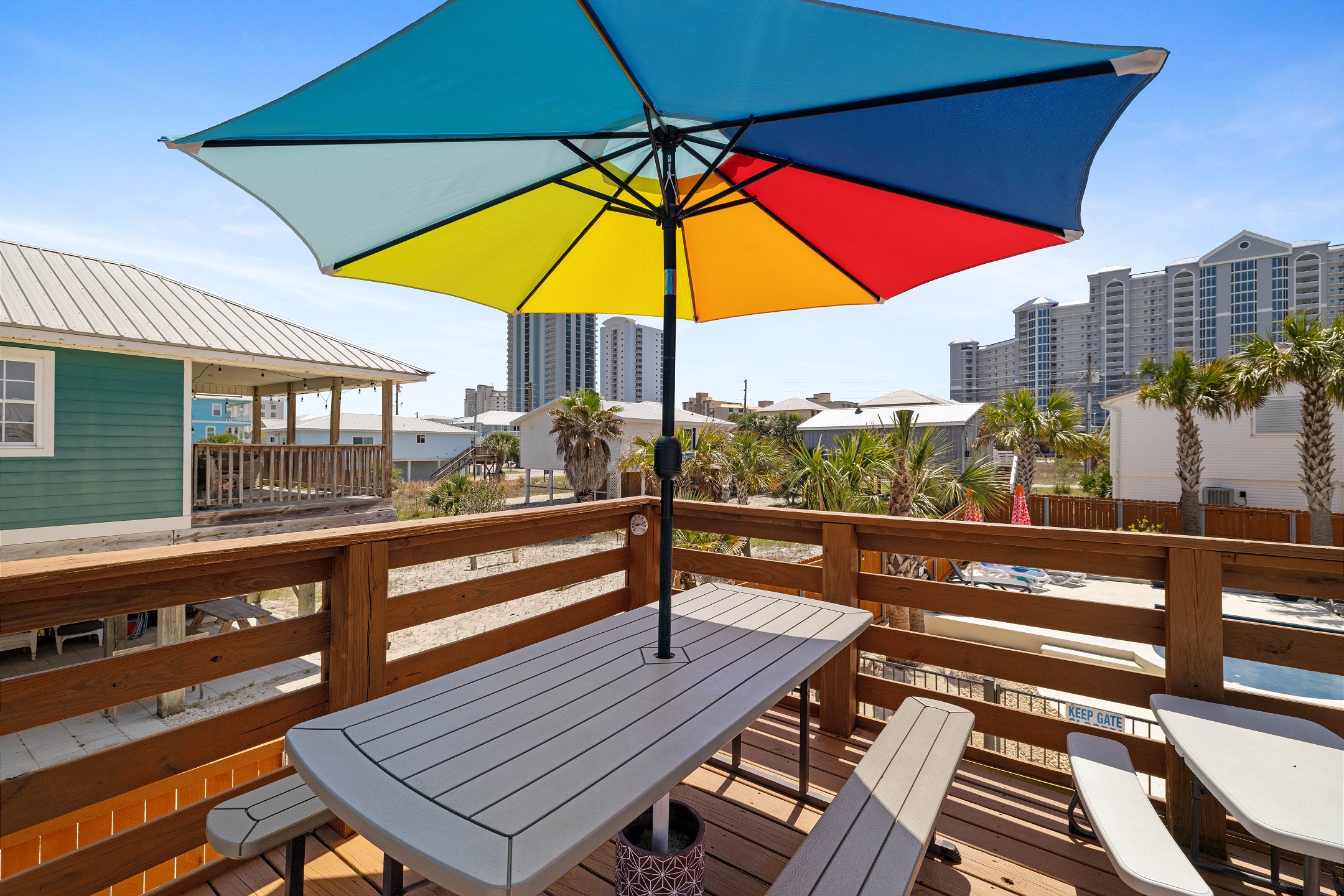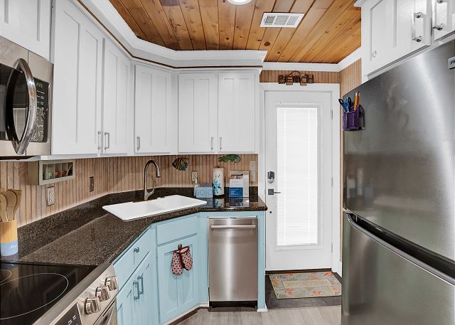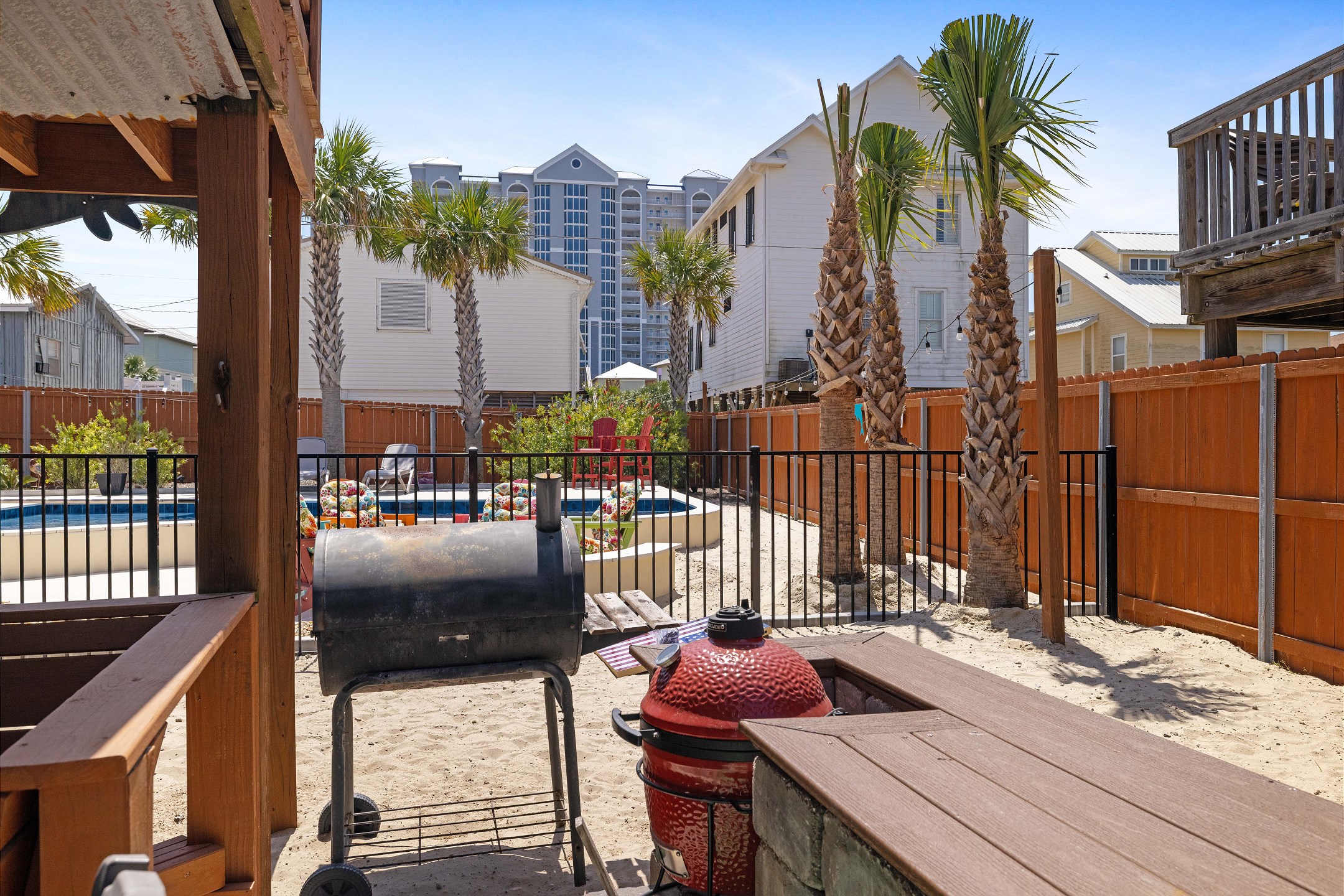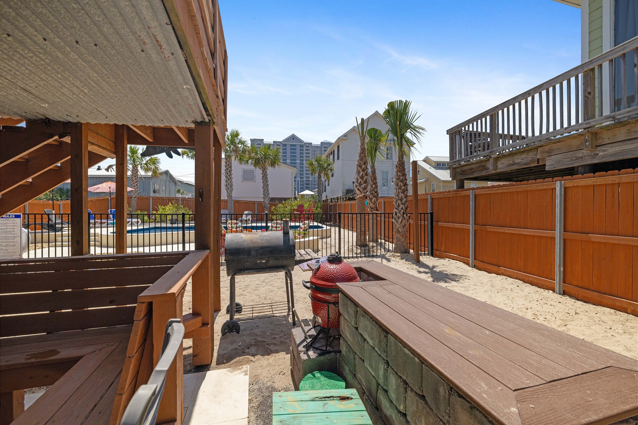 Step outside to the deck and patio areas to enjoy the fresh Gulf breezes, and fire up the charcoal grill (bring your own charcoal) for some beachside grilling. The fully fenced property ensures privacy. This unit is dog-friendly! A non-refundable pet fee of $150 applies for guests bringing a dog. Please notify our office in advance if you plan to bring one. This unit allows a maximum of two dogs. Most beaches in the area do not allow dogs, but there is a dog-friendly beach down Fort Morgan.