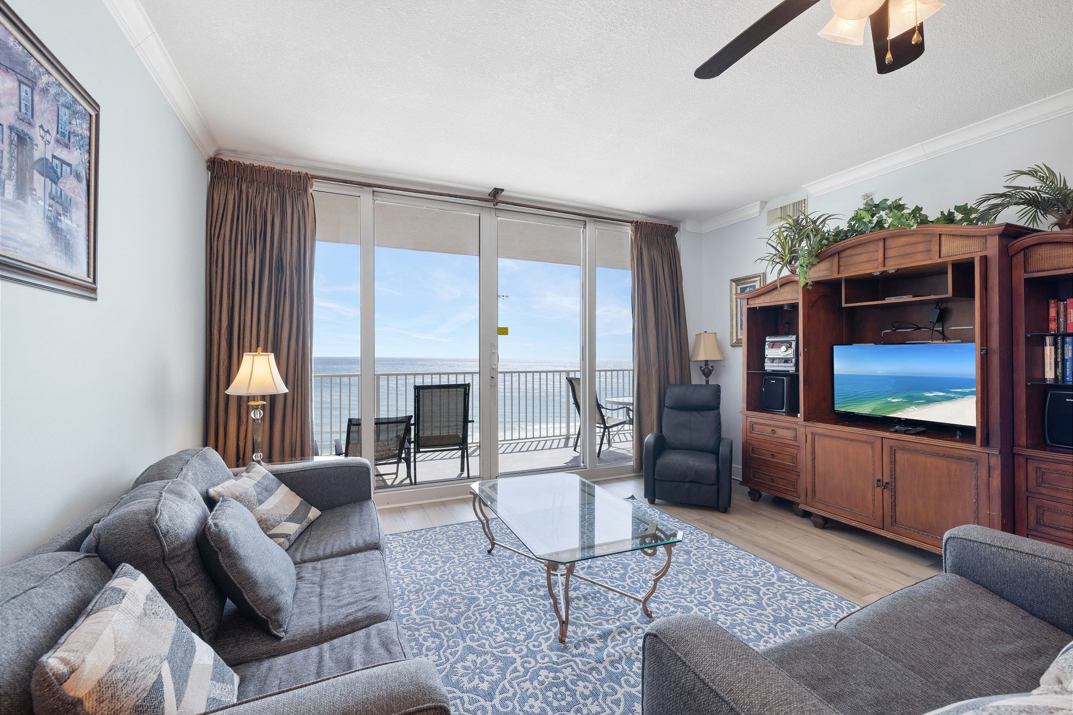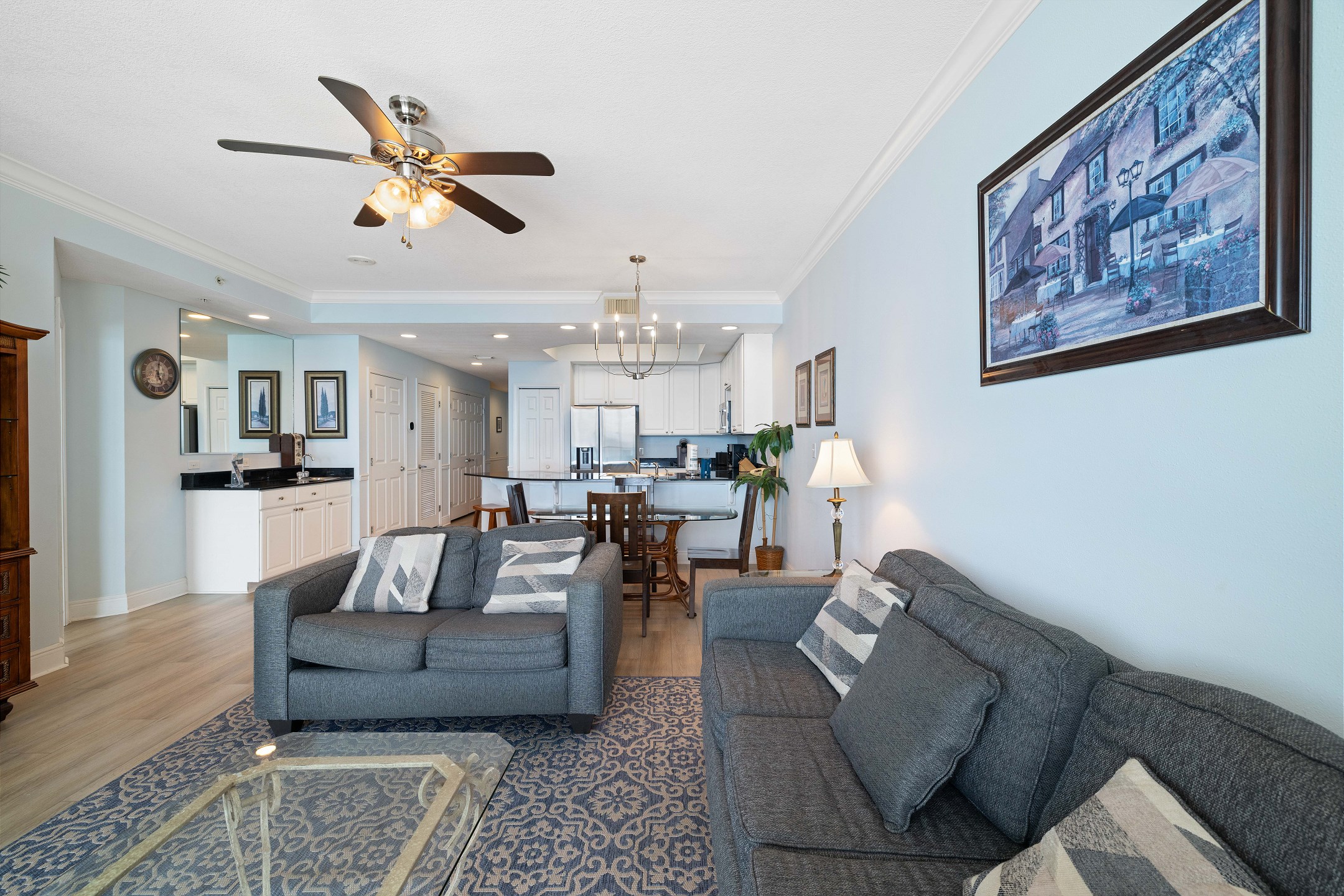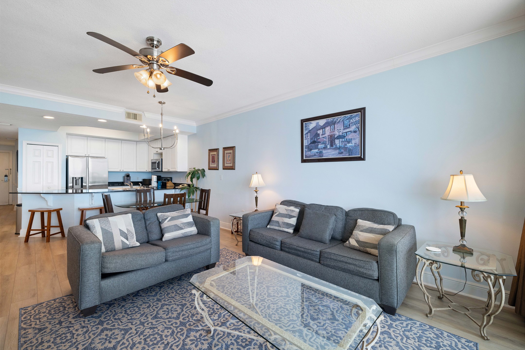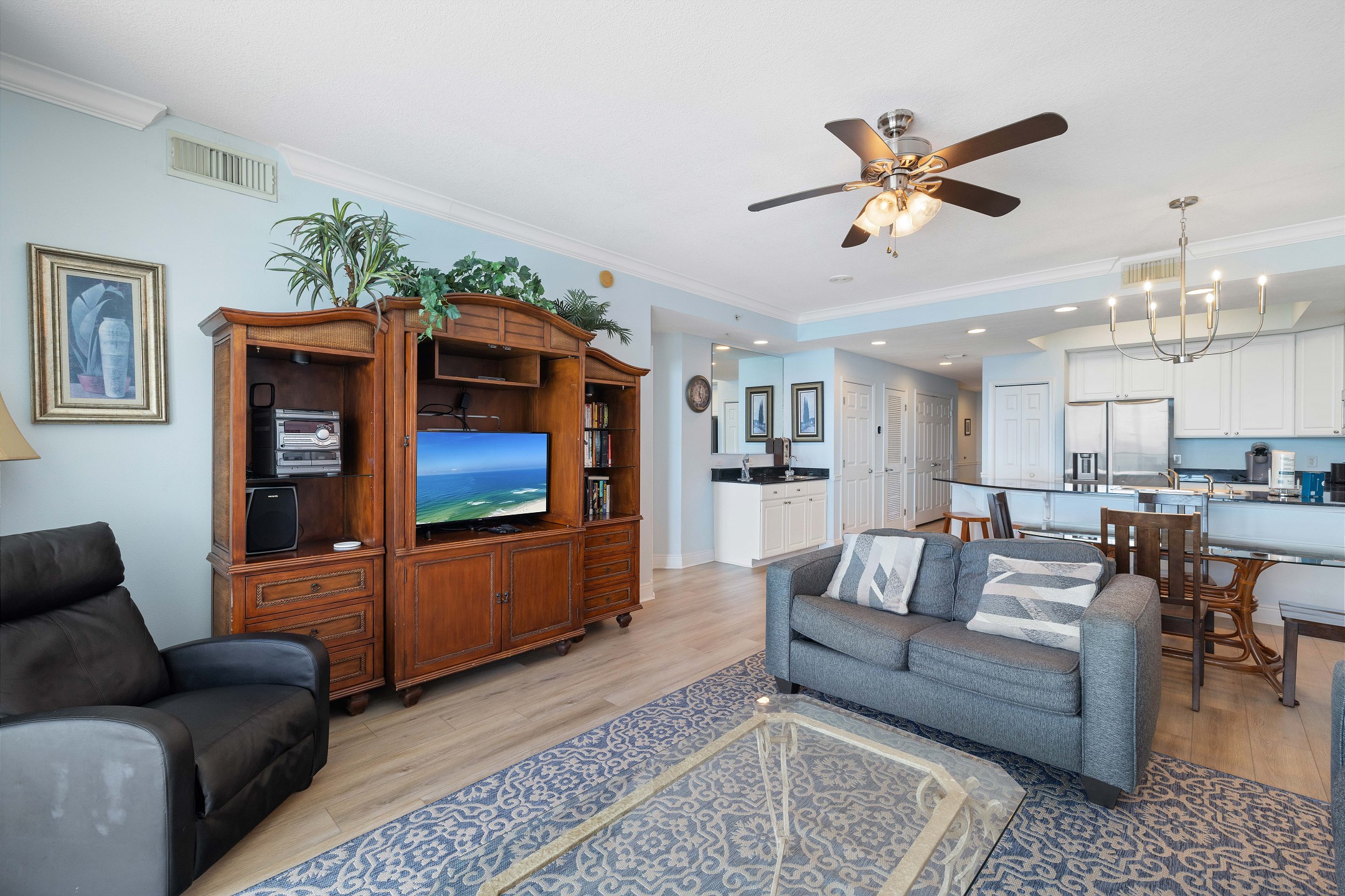 Each bedroom is equipped with its own flat-screen TV, allowing you to unwind with your favorite shows before drifting off to sleep. The living room serves as the perfect gathering space, featuring another flat-screen TV, a cozy sofa sleeper, and a wet bar where you can mix up your favorite cocktails.