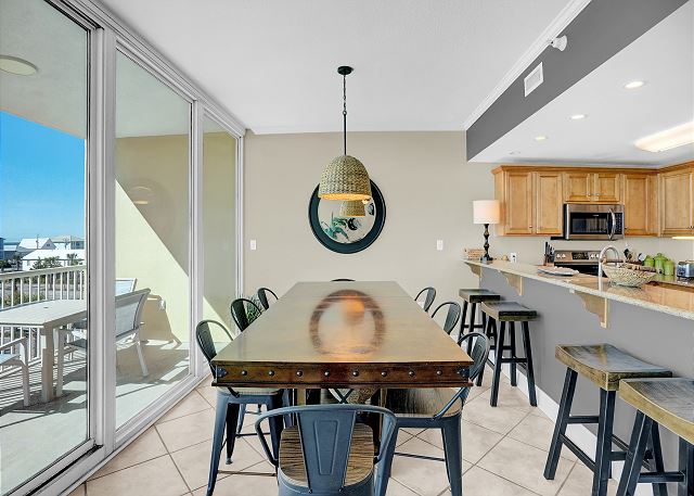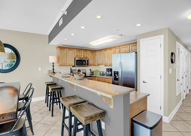 Impeccably decorated by a local designer, the condo features a fully equipped kitchen with granite countertops and seating for 10, making it easy to prepare meals and entertain. The living area is perfect for unwinding, with a large flat-screen TV for watching your favorite movies and sports events. A dining table and barstools provide additional seating for meals and socializing.