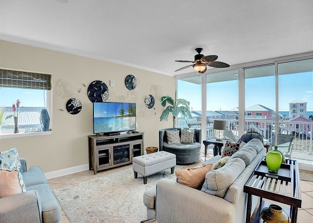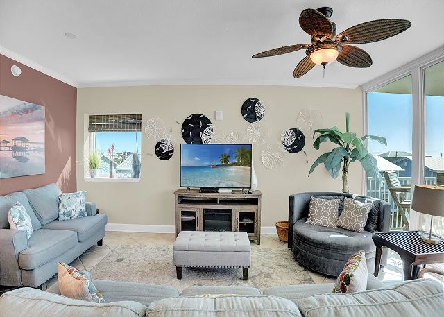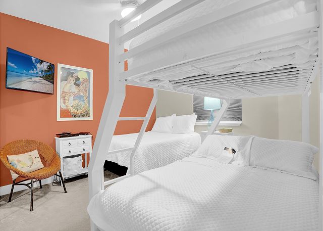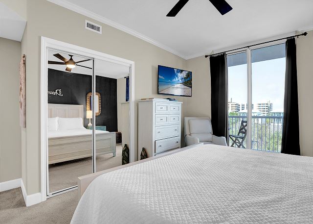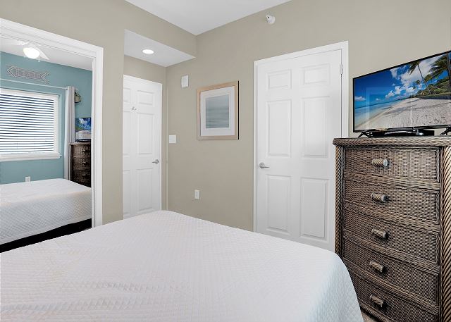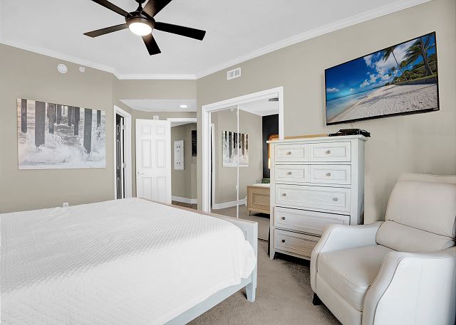 The primary bedroom boasts a king-sized bed and private balcony access, allowing you to enjoy the stunning views right from your room. The second bedroom features a queen bed along with a twin-over-full bunk bed, while the third bedroom also has a queen bed. The living room offers a queen sofa sleeper for extra guests. Every bedroom is equipped with a TV and DVD player, ensuring everyone has their own space to relax and unwind.