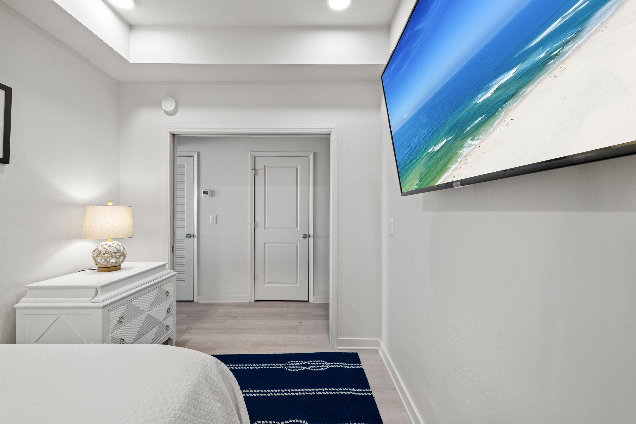 Sea Glass 406 is equipped with modern amenities, including 9 ft. ceilings, smart TVs in all rooms, and a full-sized washer and dryer for added convenience.