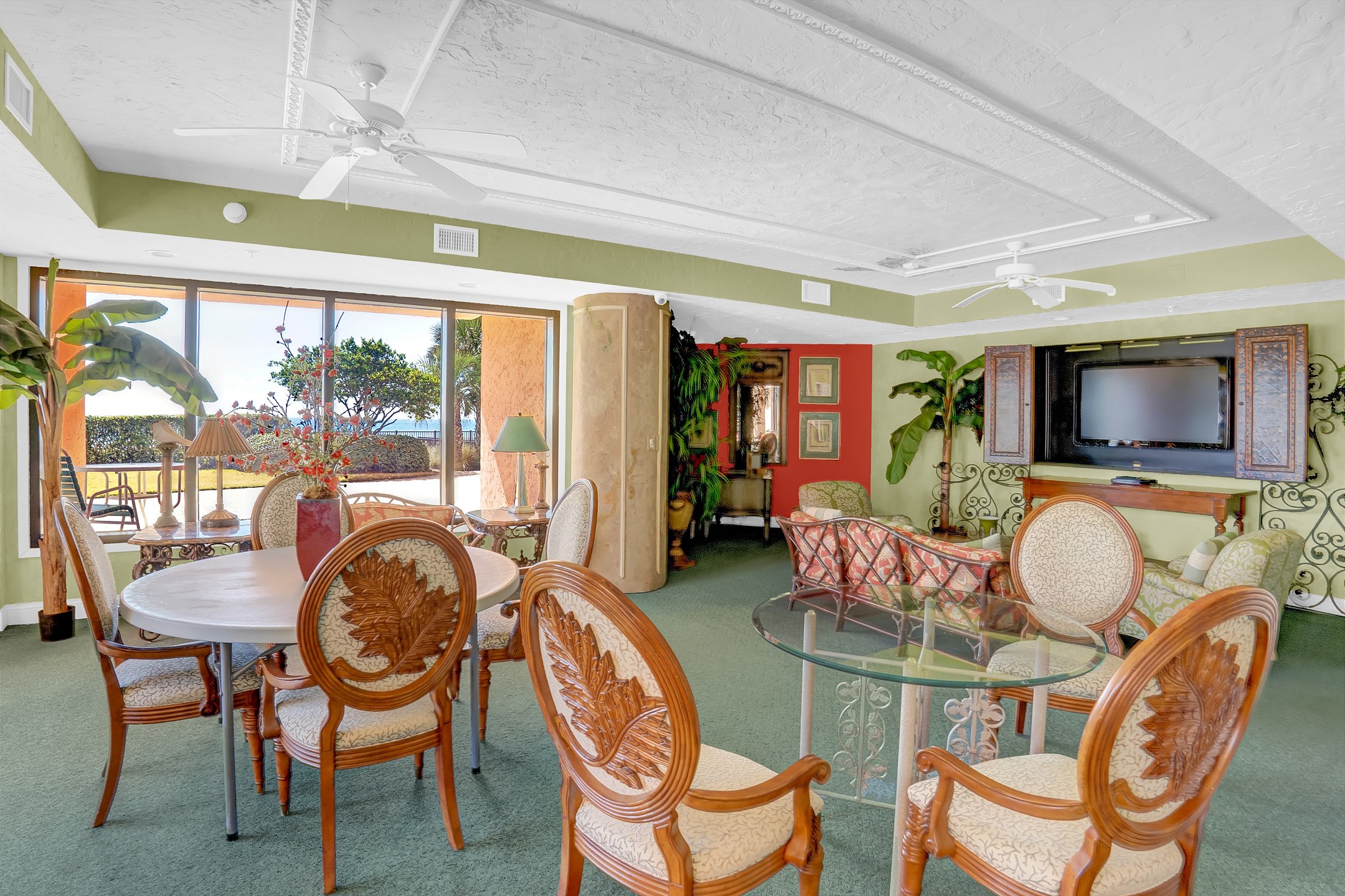 The living room features high ceilings and an open-concept layout, creating a spacious and inviting atmosphere. Relax on the comfortable furnishings and enjoy stunning views of the Gulf through the floor-to-ceiling windows. Gather around the 55-inch flat-screen TV for movie nights or cozy conversations.