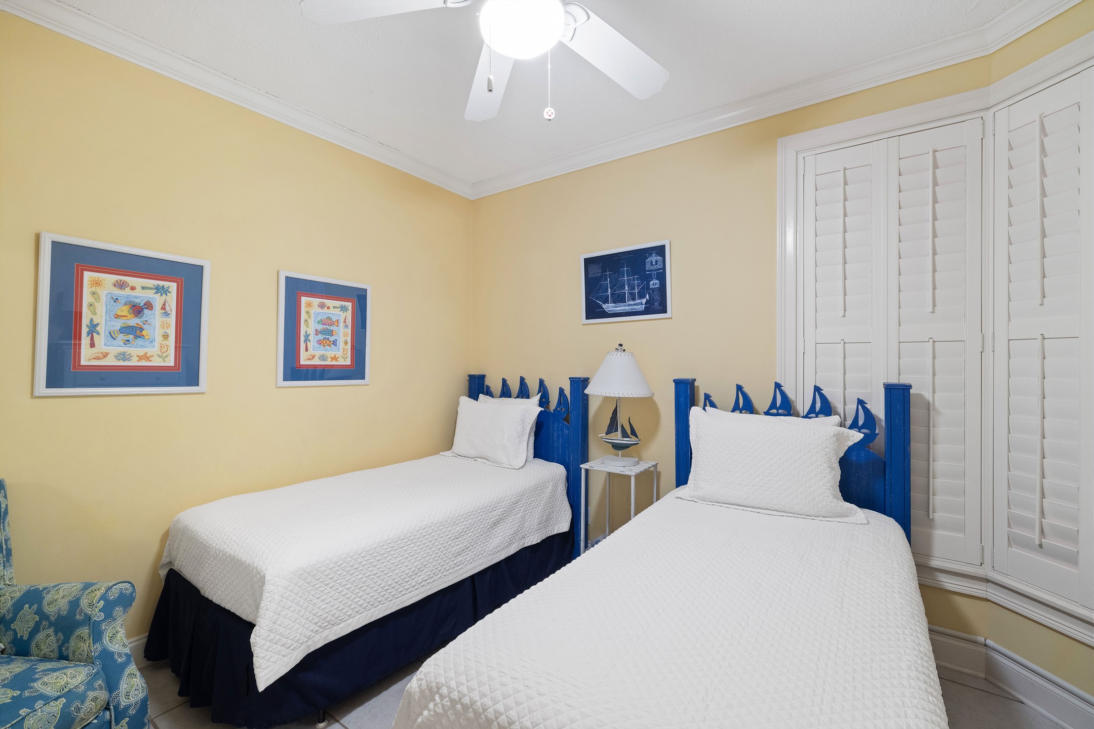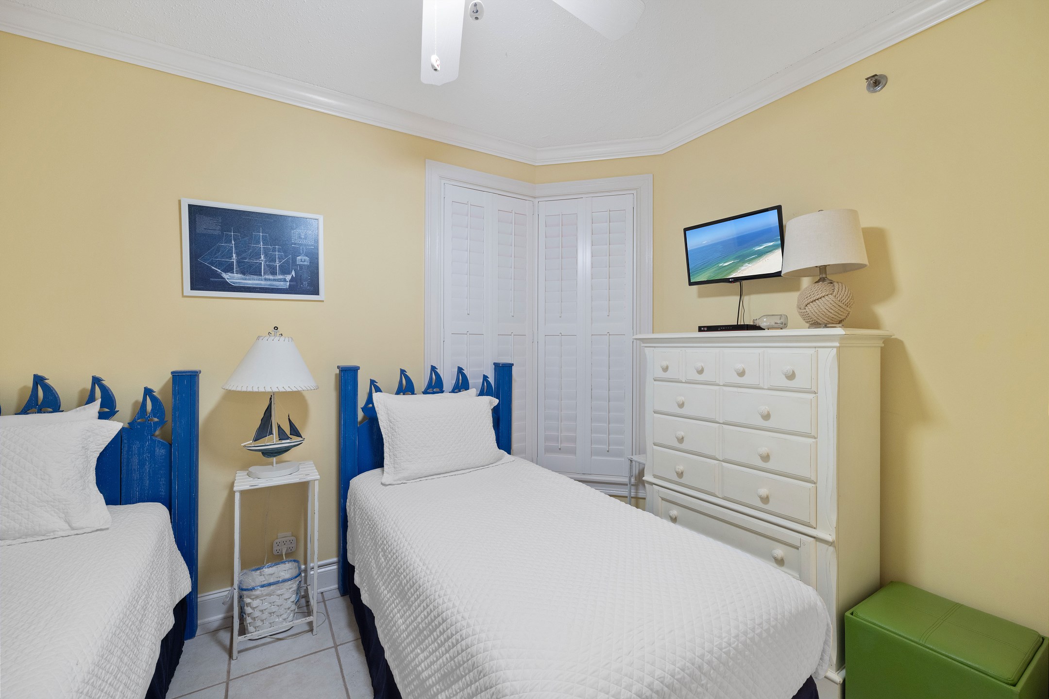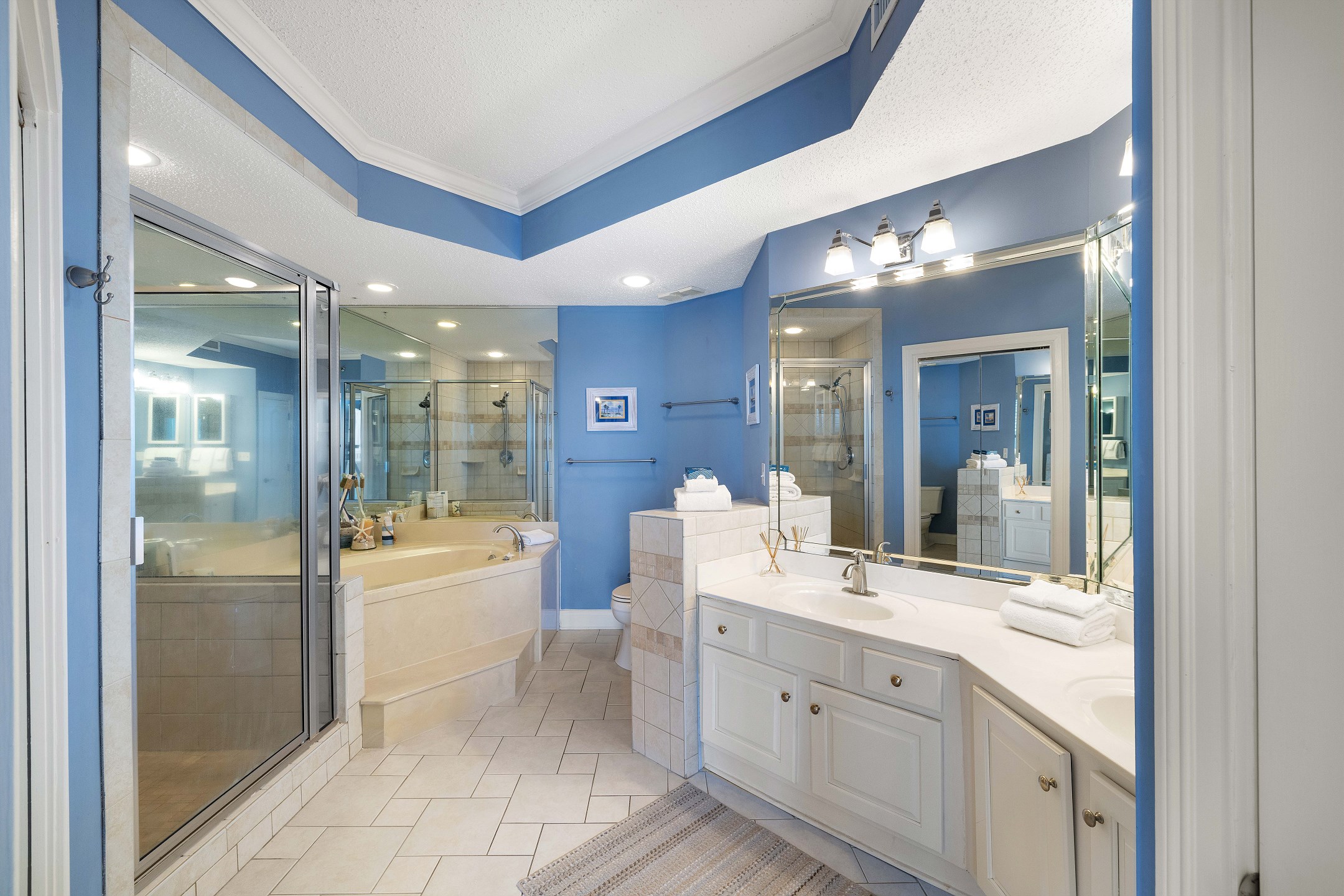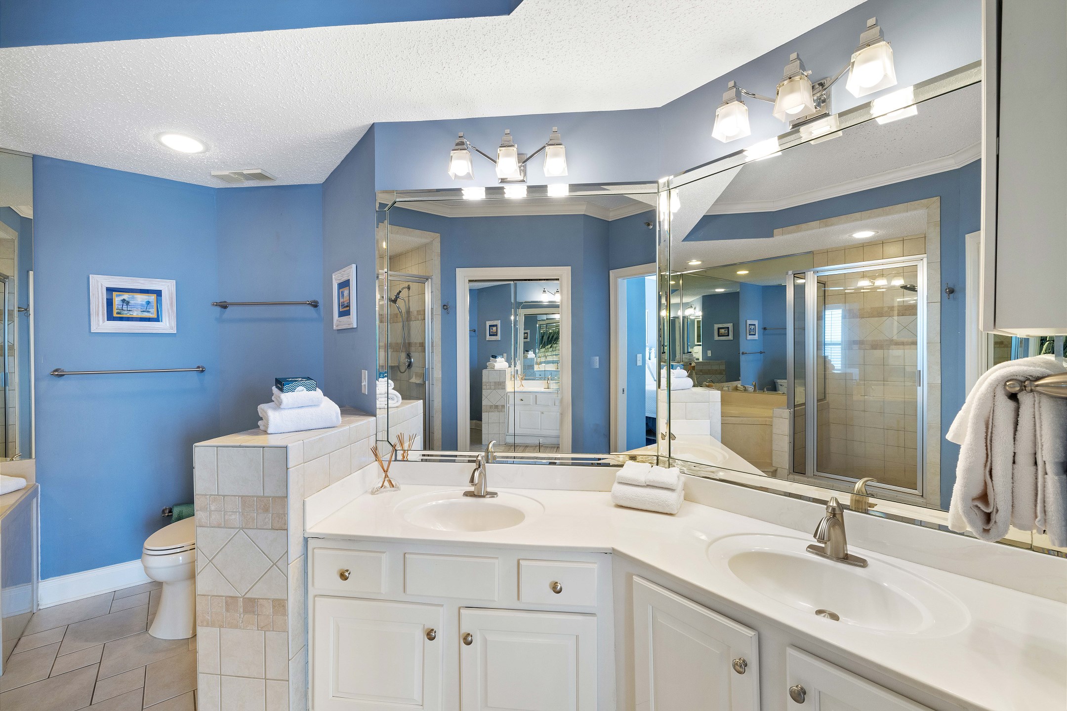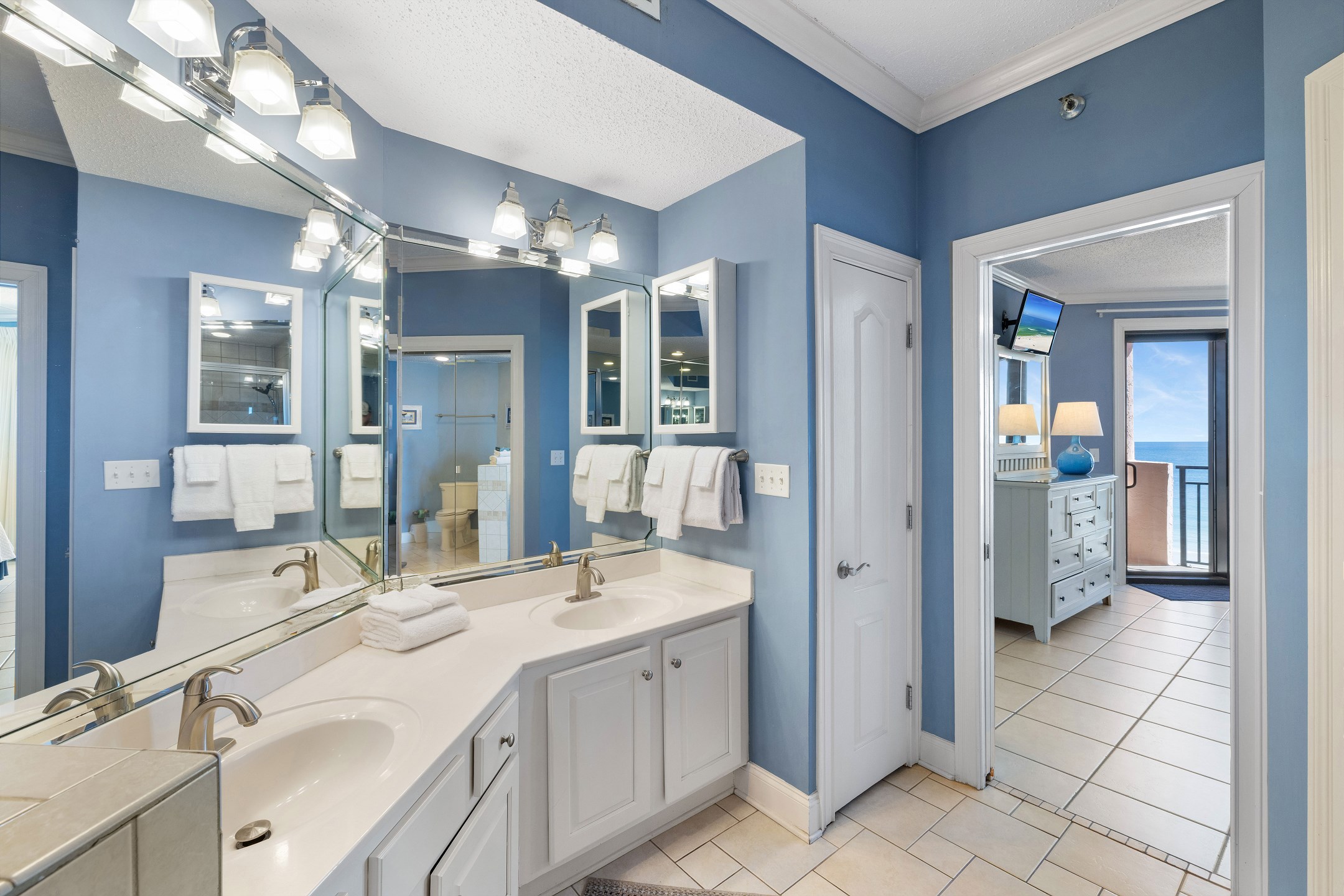 The primary suite features a king bed, flat-screen TV, balcony access, and a private ensuite bathroom with a Jacuzzi tub, separate glass-enclosed shower, and double vanity. The guest bedroom offers two twin beds and a flat-screen TV, providing a cozy space for family or friends. A sofa sleeper in the living room adds extra flexibility for guests.