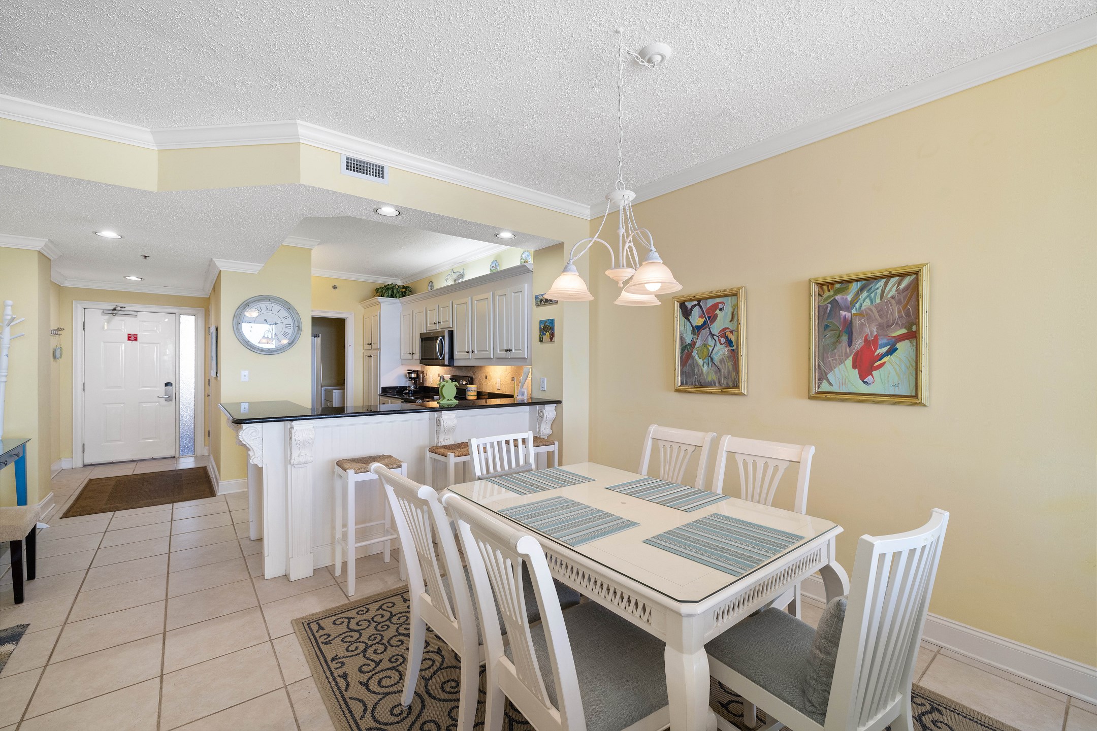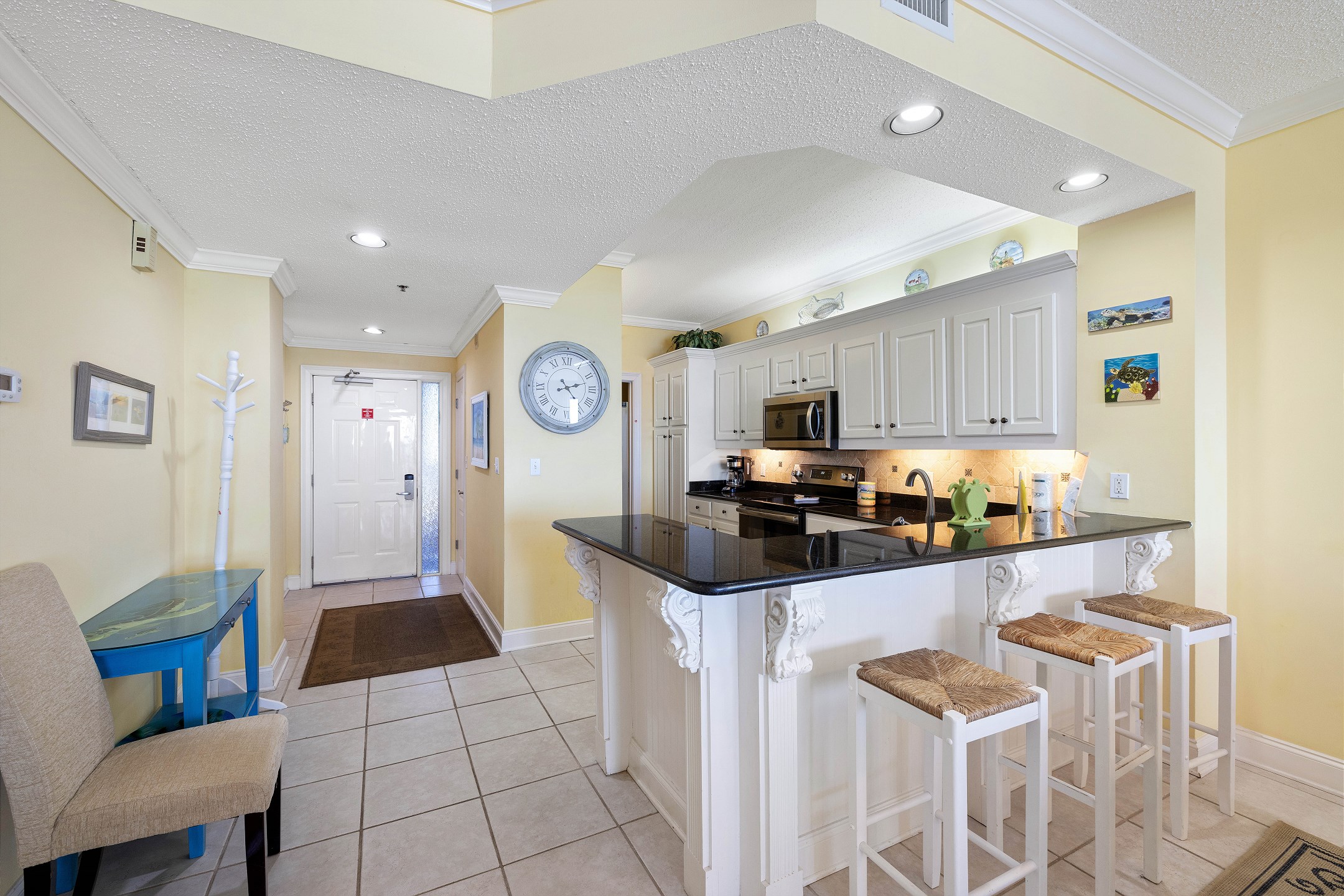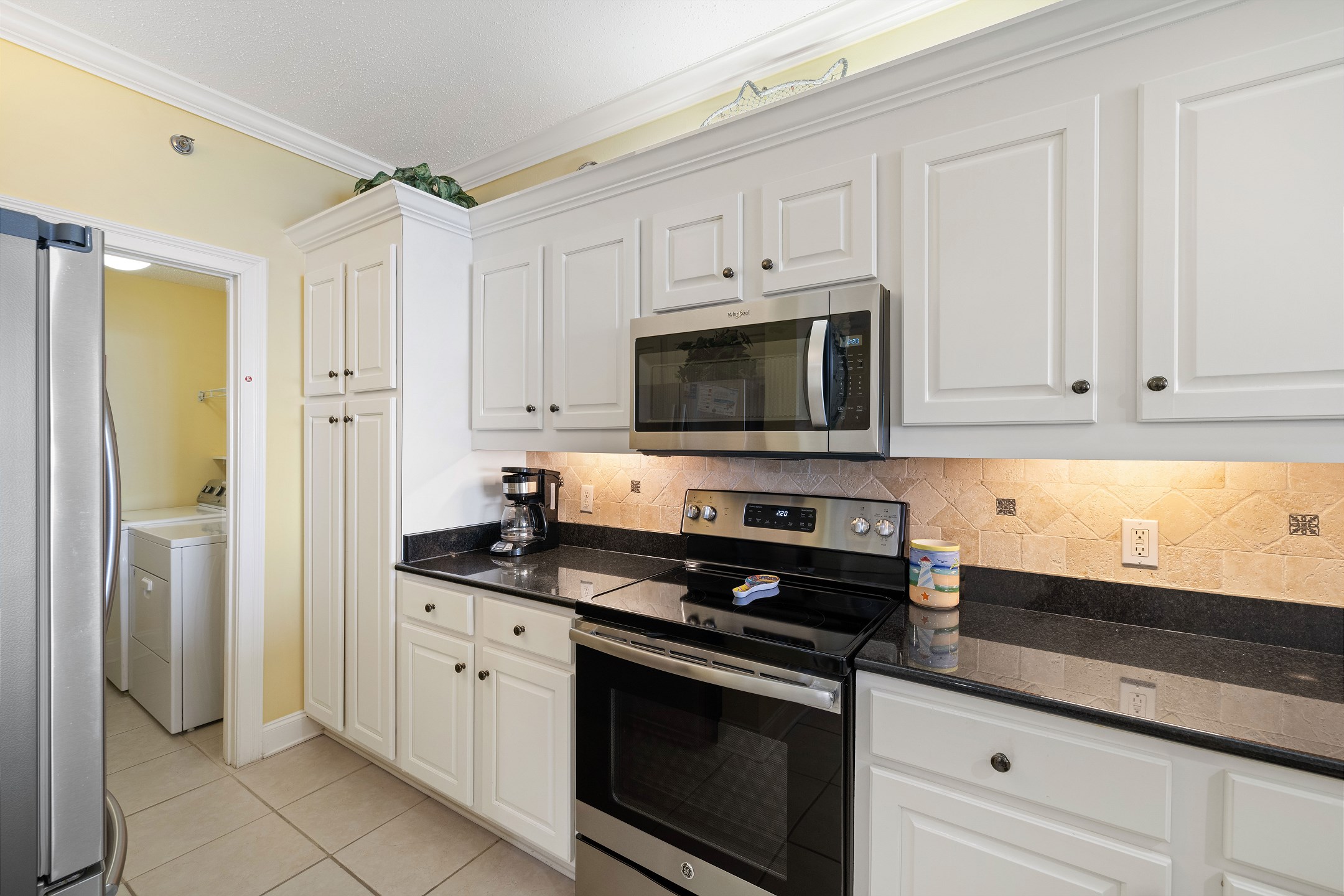 The fully equipped kitchen includes everything you need to prepare meals at home, along with a wet bar for added convenience. A full-sized washer and dryer make longer stays effortless and comfortable.