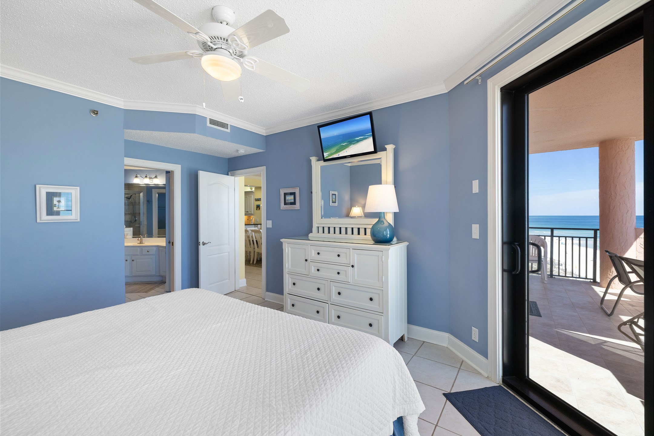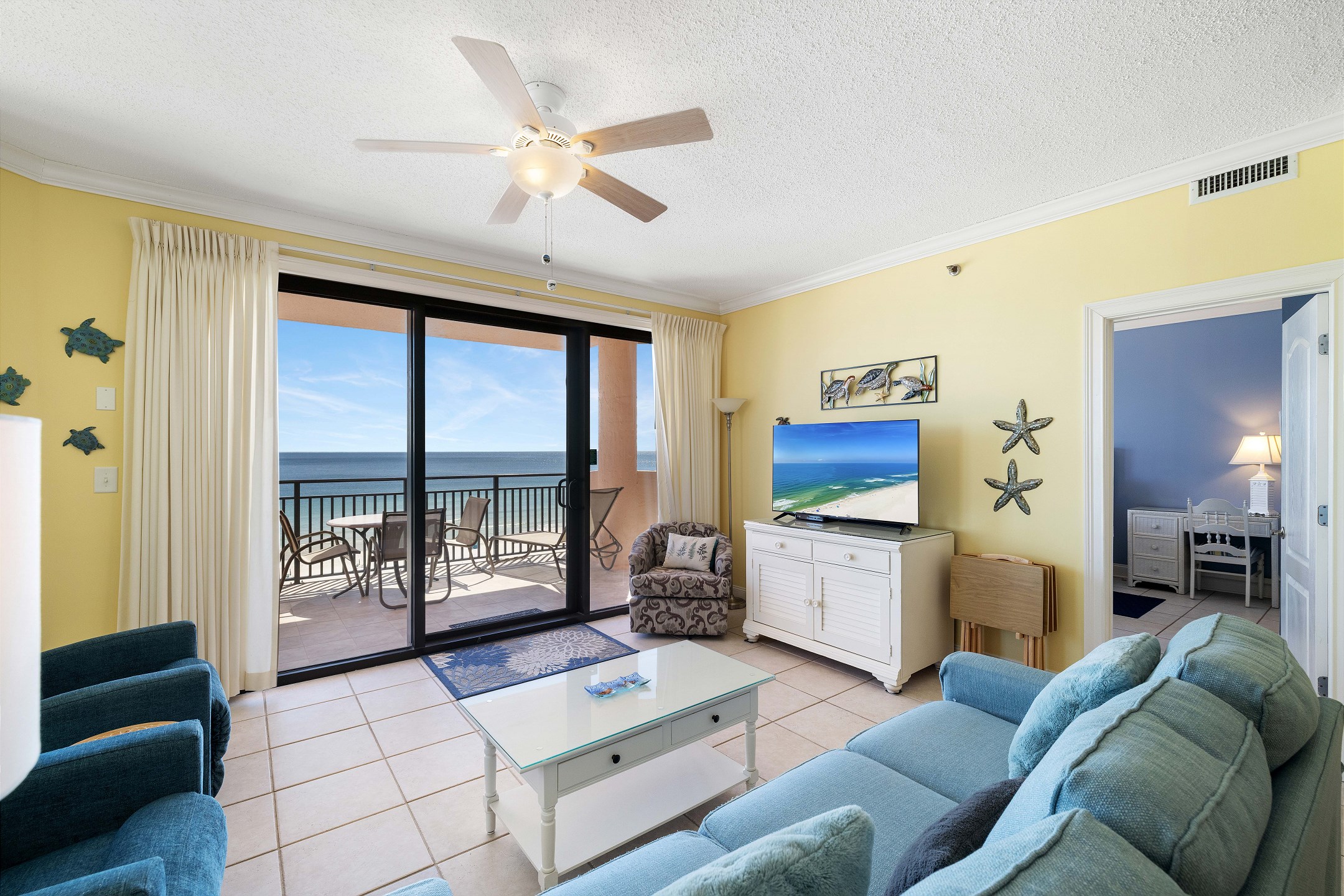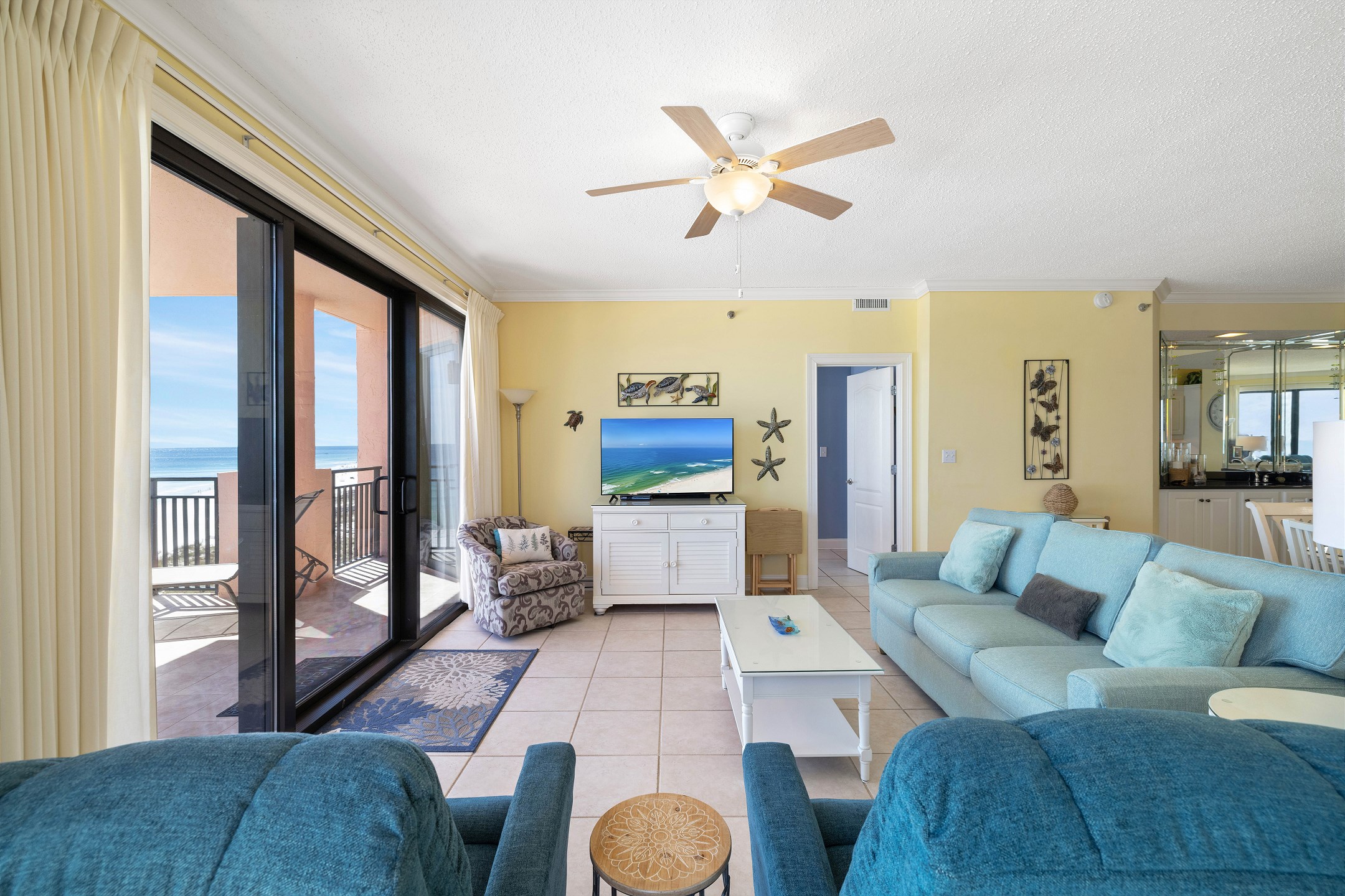 The living room features comfortable seating and a flat-screen TV, perfect for movie nights or unwinding after a day in the sun. Floor-to-ceiling windows frame the breathtaking Gulf views and open onto a private balcony where you can sip your morning coffee or watch the sunset over the water.