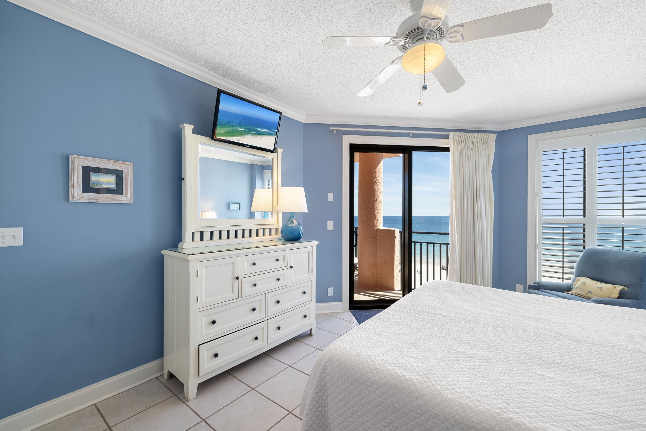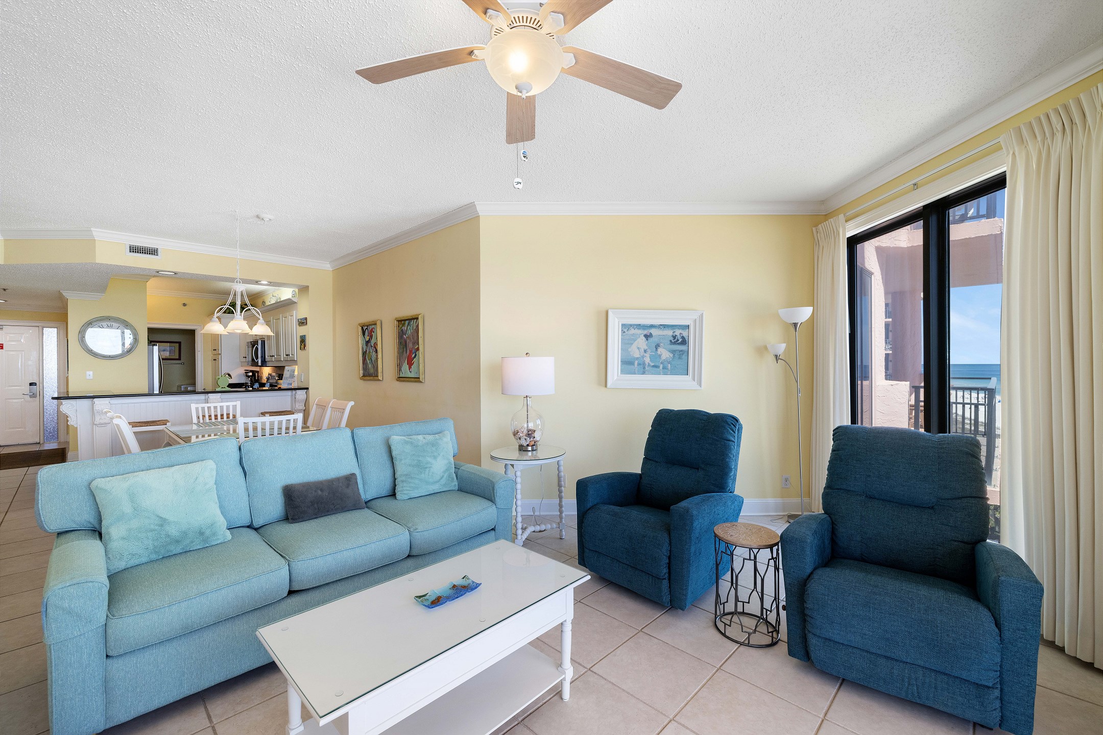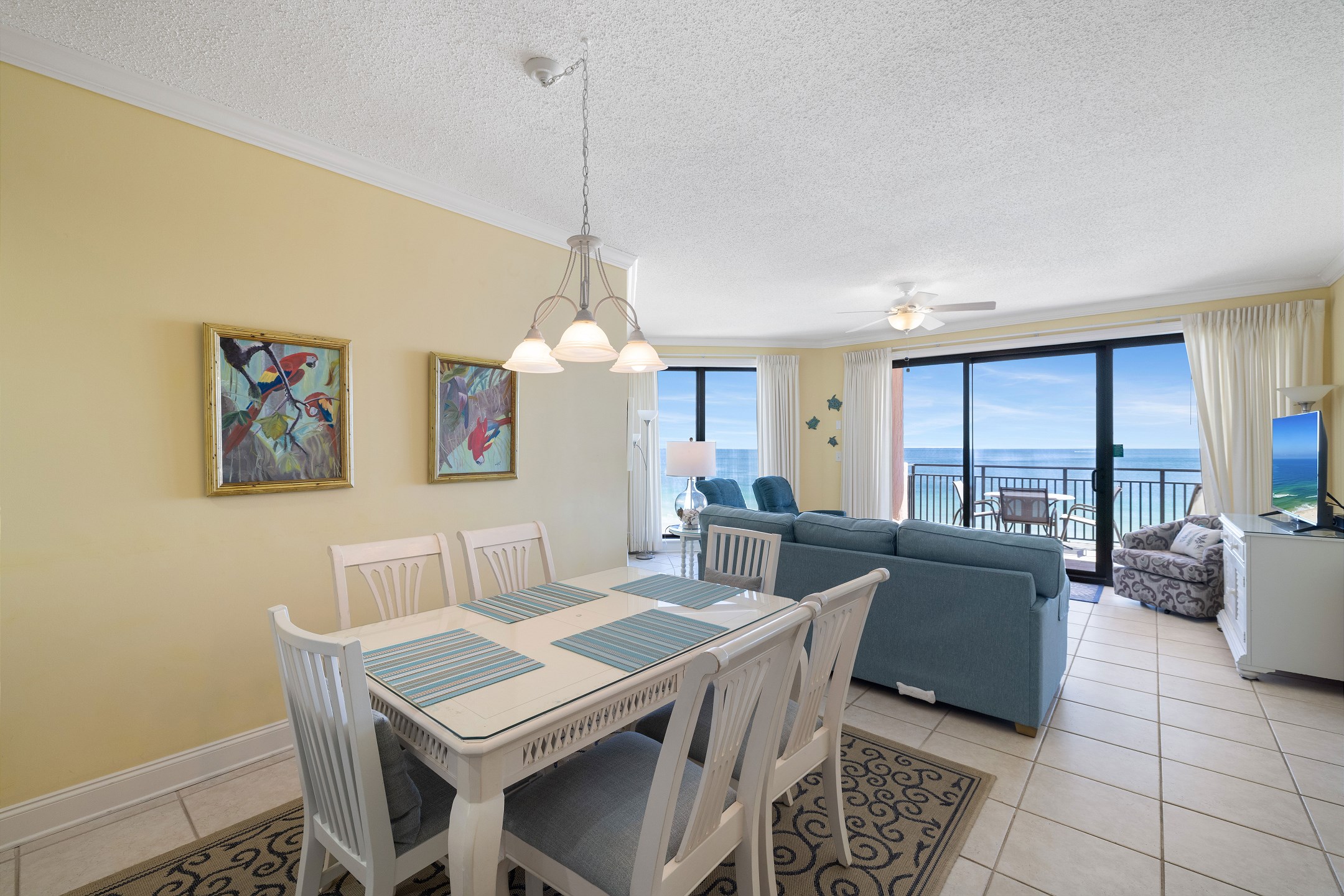 The living room features comfortable seating and a flat-screen TV, perfect for movie nights or unwinding after a day in the sun. Floor-to-ceiling windows frame the breathtaking Gulf views and open onto a private balcony where you can sip your morning coffee or watch the sunset over the water.