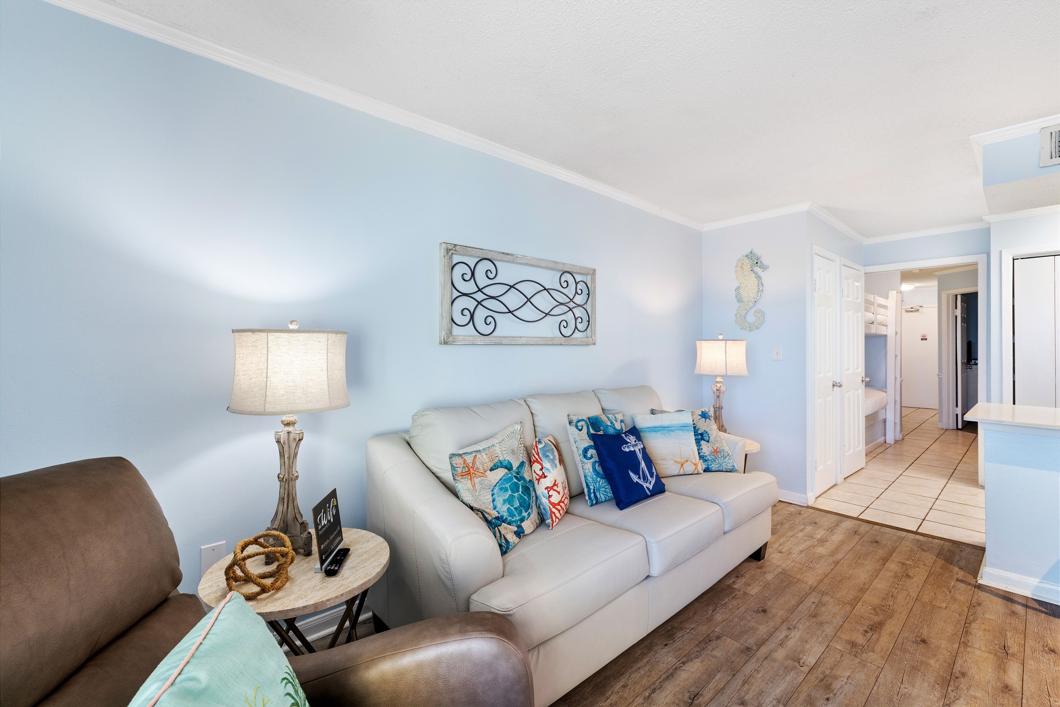 The Primary suite features a comfortable King bed and a flat-screen TV, providing a peaceful haven for relaxation after a day of beachside adventures. Additionally, there are Twin hall bunk beds and a sofa sleeper in the living room, accommodating up to 6 guests in total.