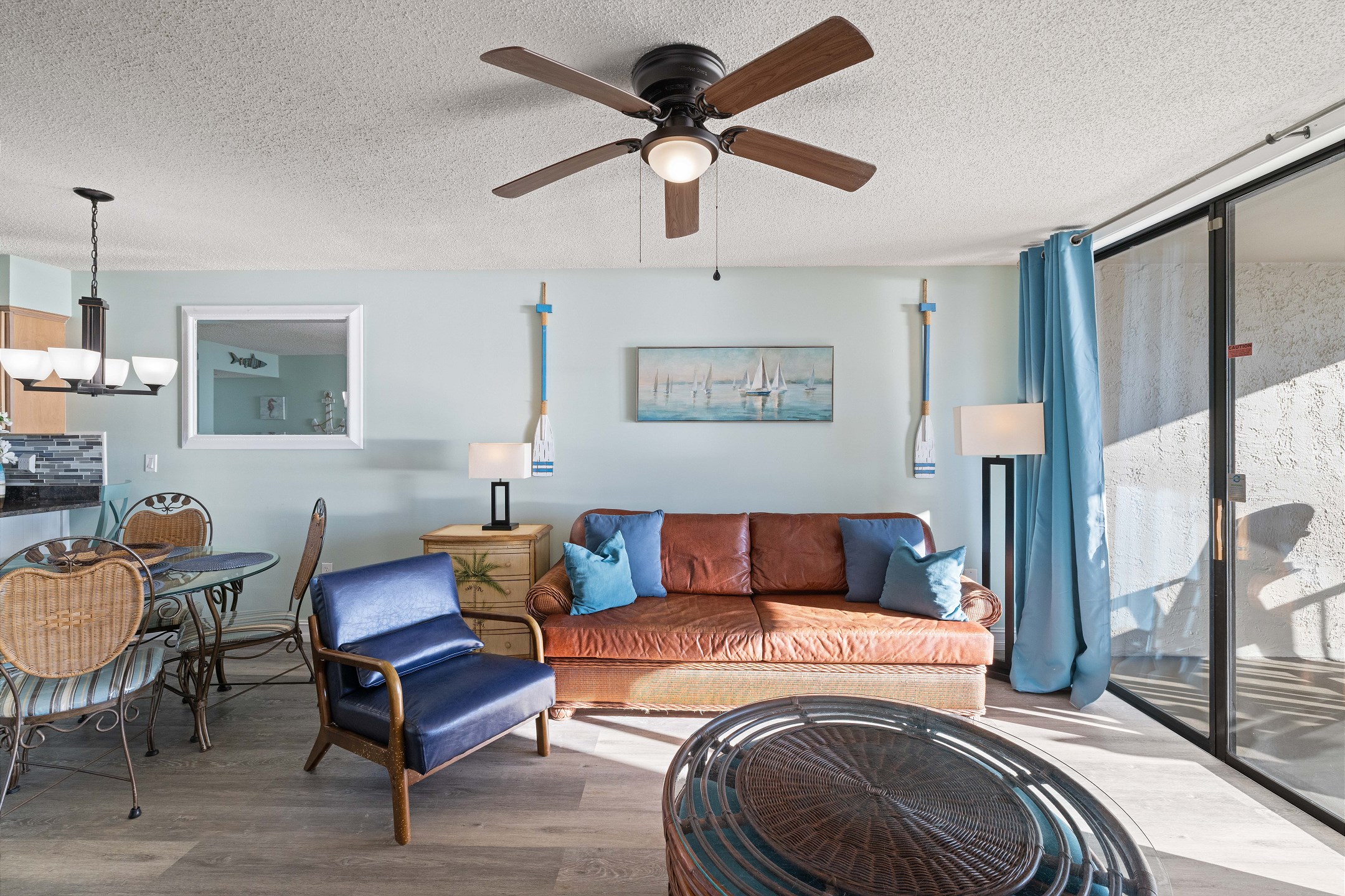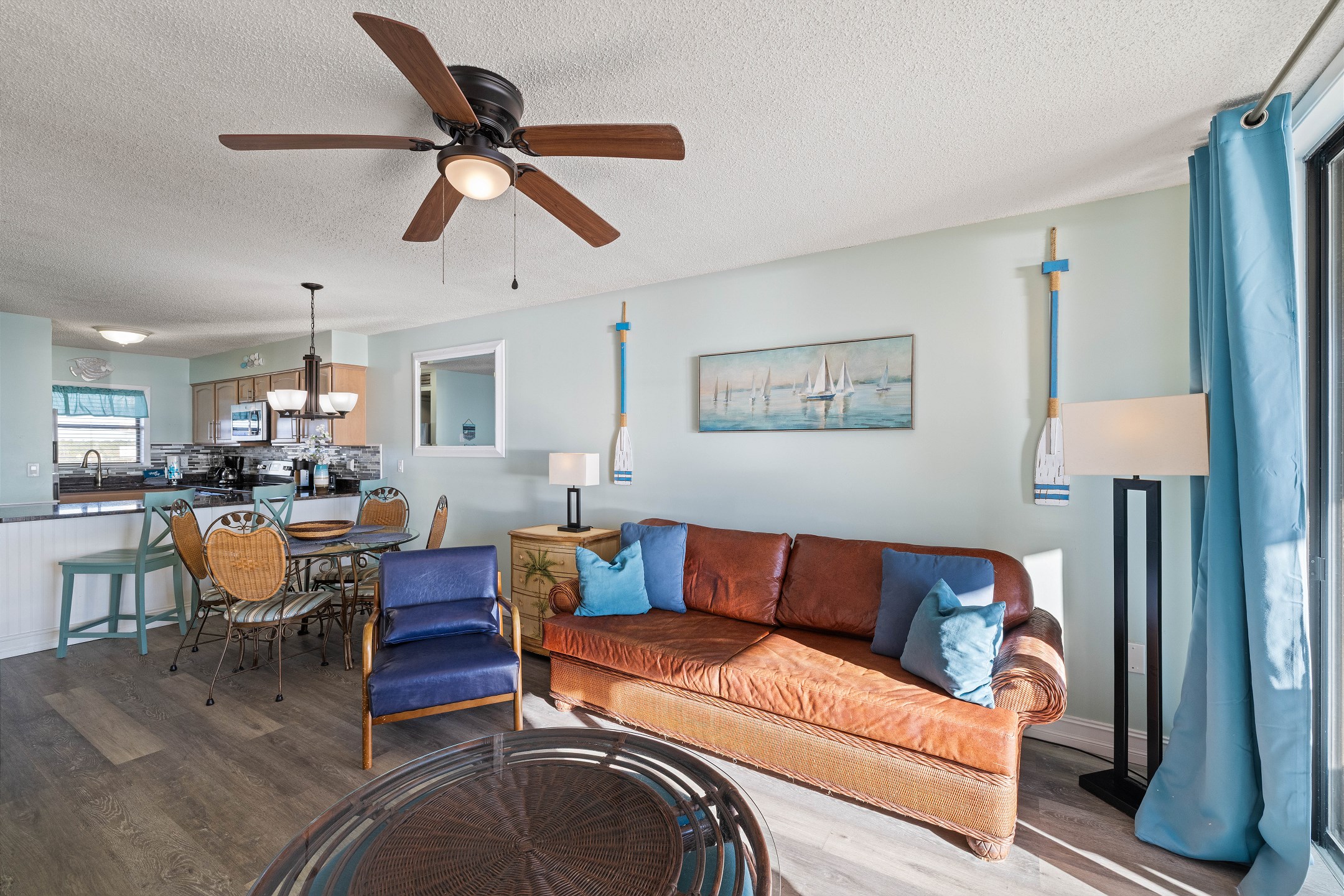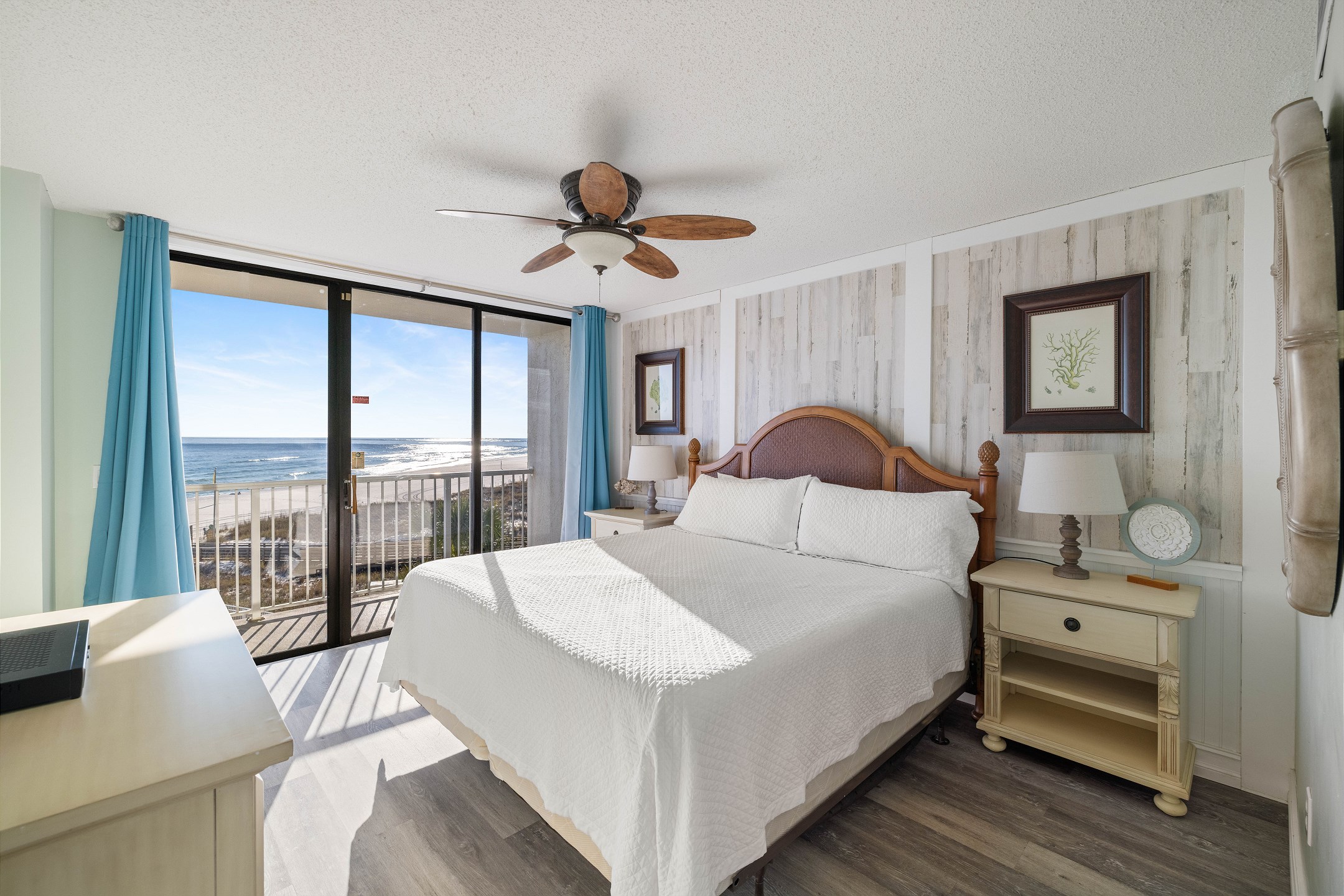 The living room features floor to ceiling windows that lead out to a private balcony overlooking the Gulf, as well as a flat screen TV. The leather sofa converts into a pull out bed for additional sleeping space. The fully equipped kitchen includes stainless steel appliances and a dining table, making it easy to enjoy meals together. The primary bedroom offers a king bed, floor to ceiling windows with balcony access, and an ensuite bathroom with a shower and tub combination. The second bedroom includes a comfortable queen bed.