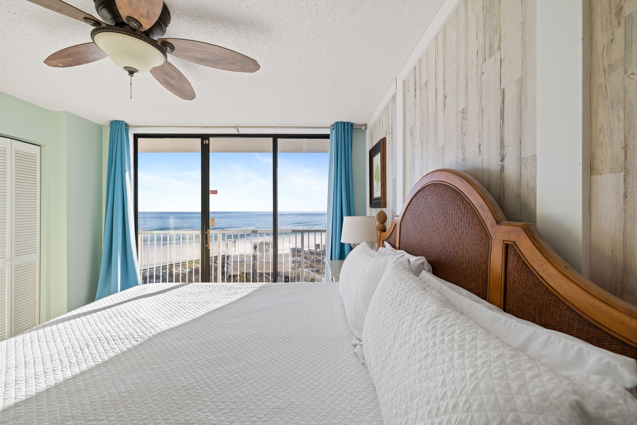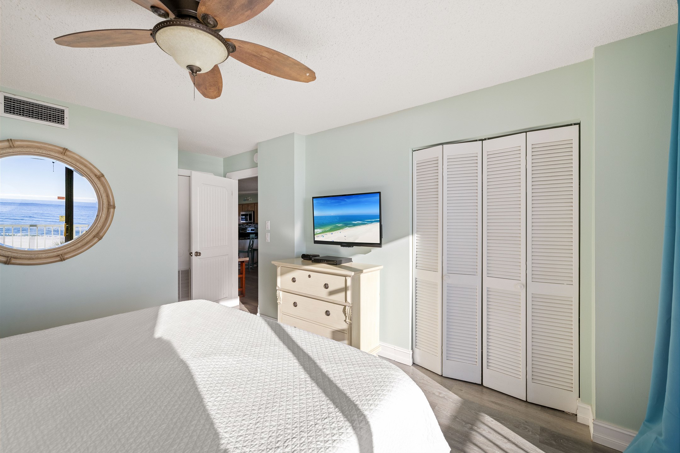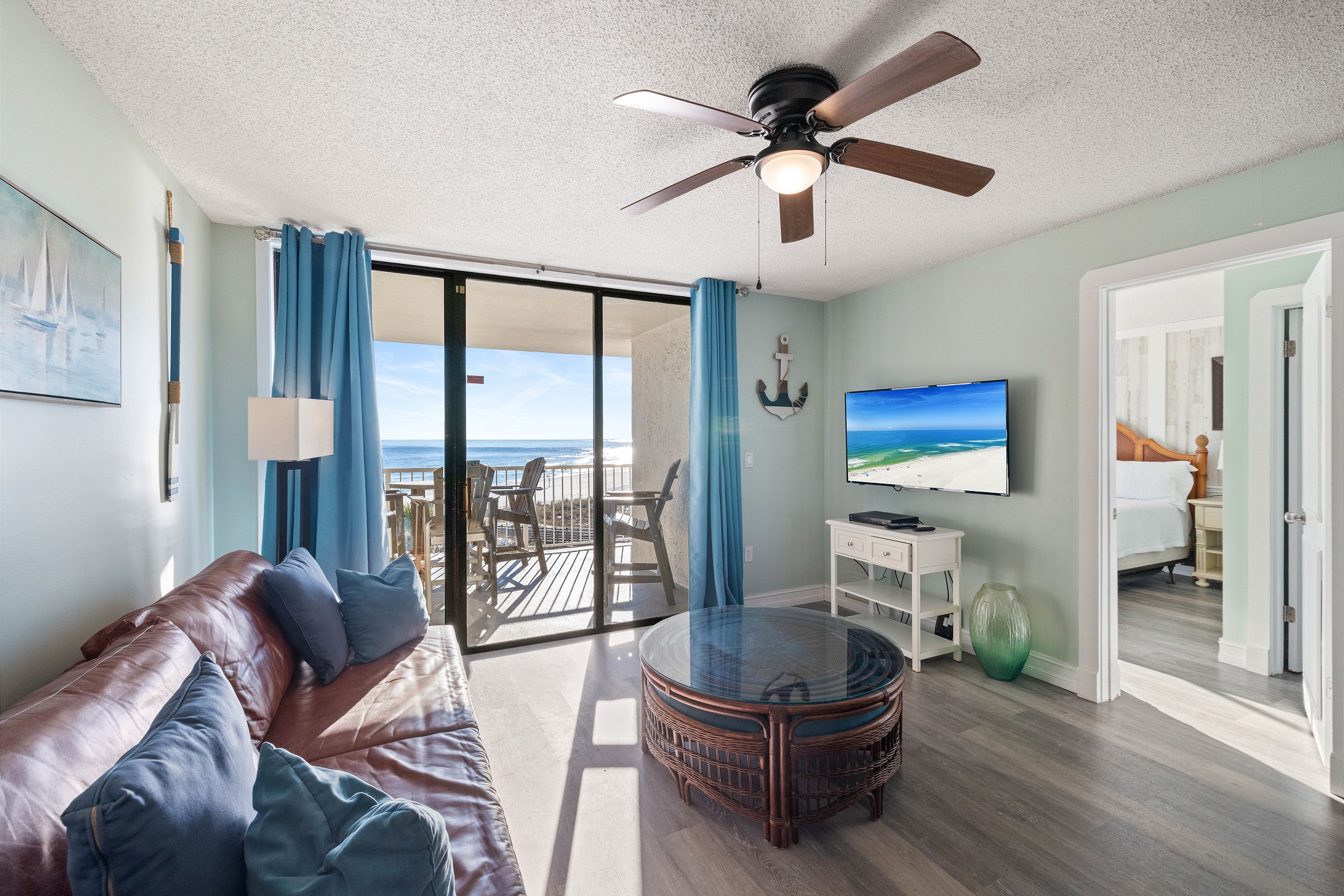 The living room features floor to ceiling windows that lead out to a private balcony overlooking the Gulf, as well as a flat screen TV. The leather sofa converts into a pull out bed for additional sleeping space. The fully equipped kitchen includes stainless steel appliances and a dining table, making it easy to enjoy meals together. The primary bedroom offers a king bed, floor to ceiling windows with balcony access, and an ensuite bathroom with a shower and tub combination. The second bedroom includes a comfortable queen bed.