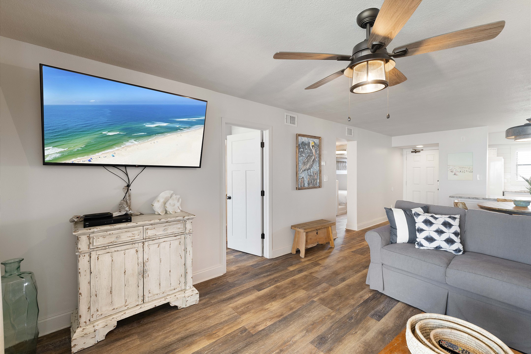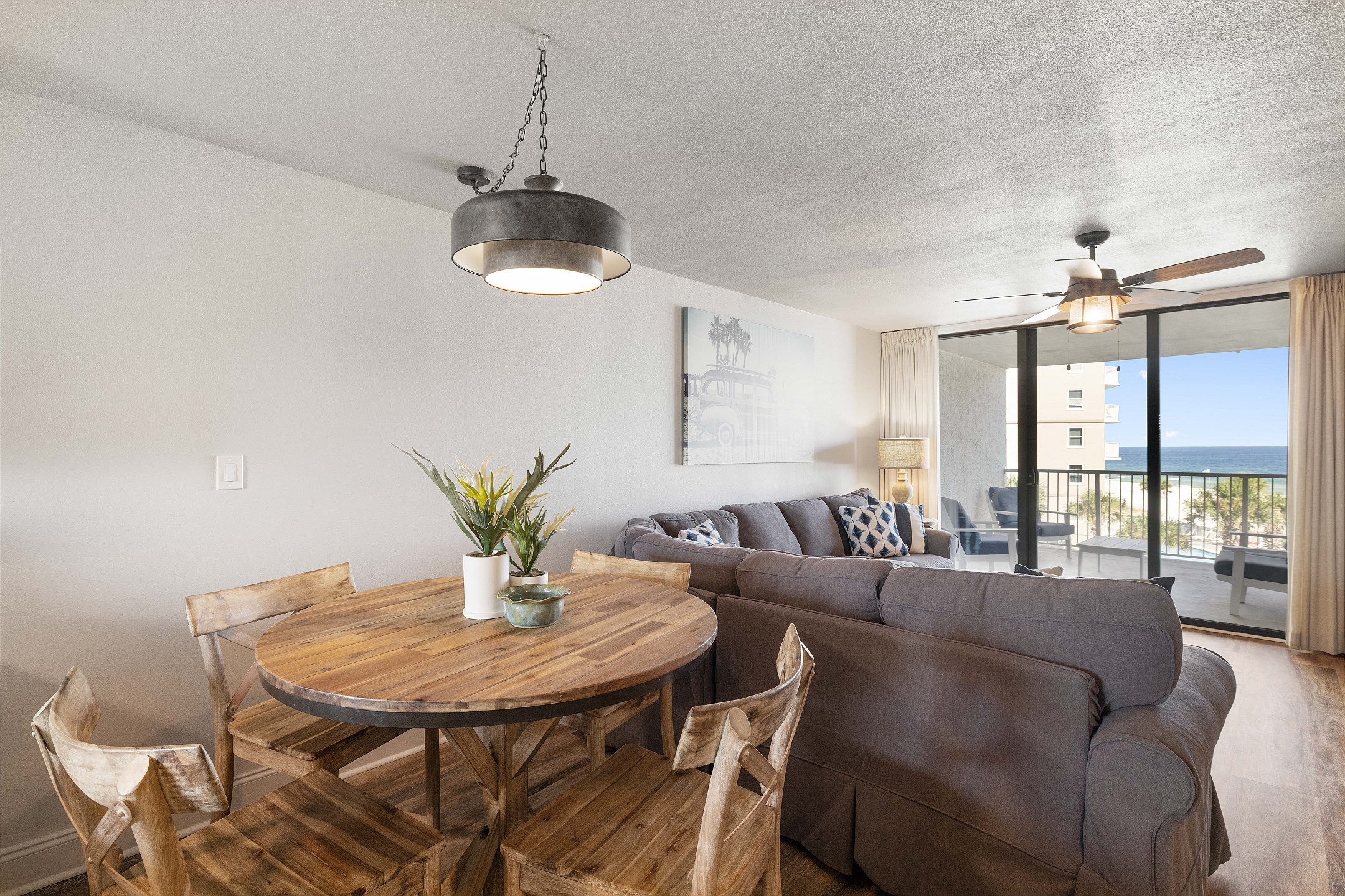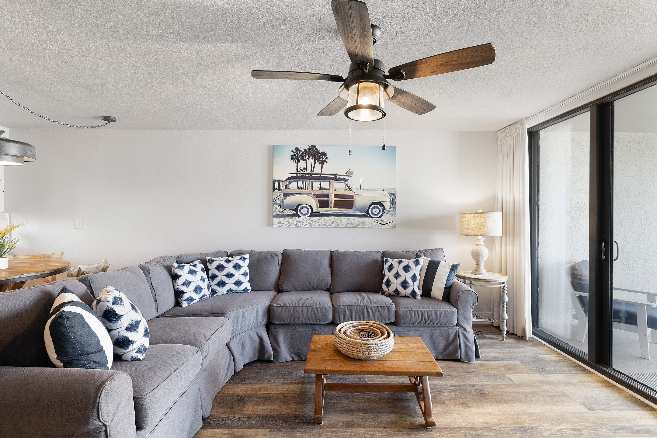 The living area features a large sectional sofa and floor-to-ceiling windows that open onto a private balcony overlooking the sparkling Gulf. This is the ideal spot to enjoy your morning coffee or watch the waves roll in at sunset.