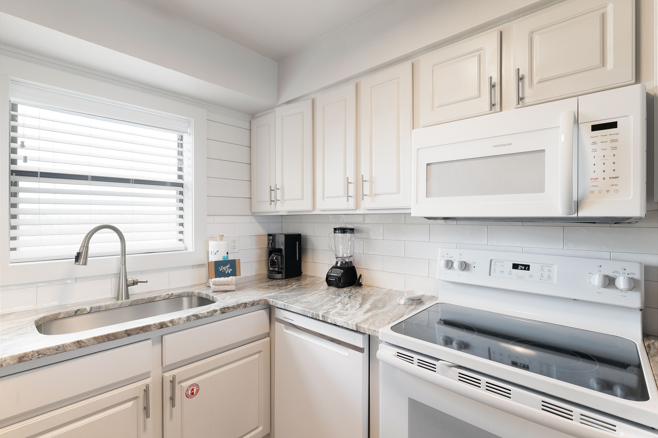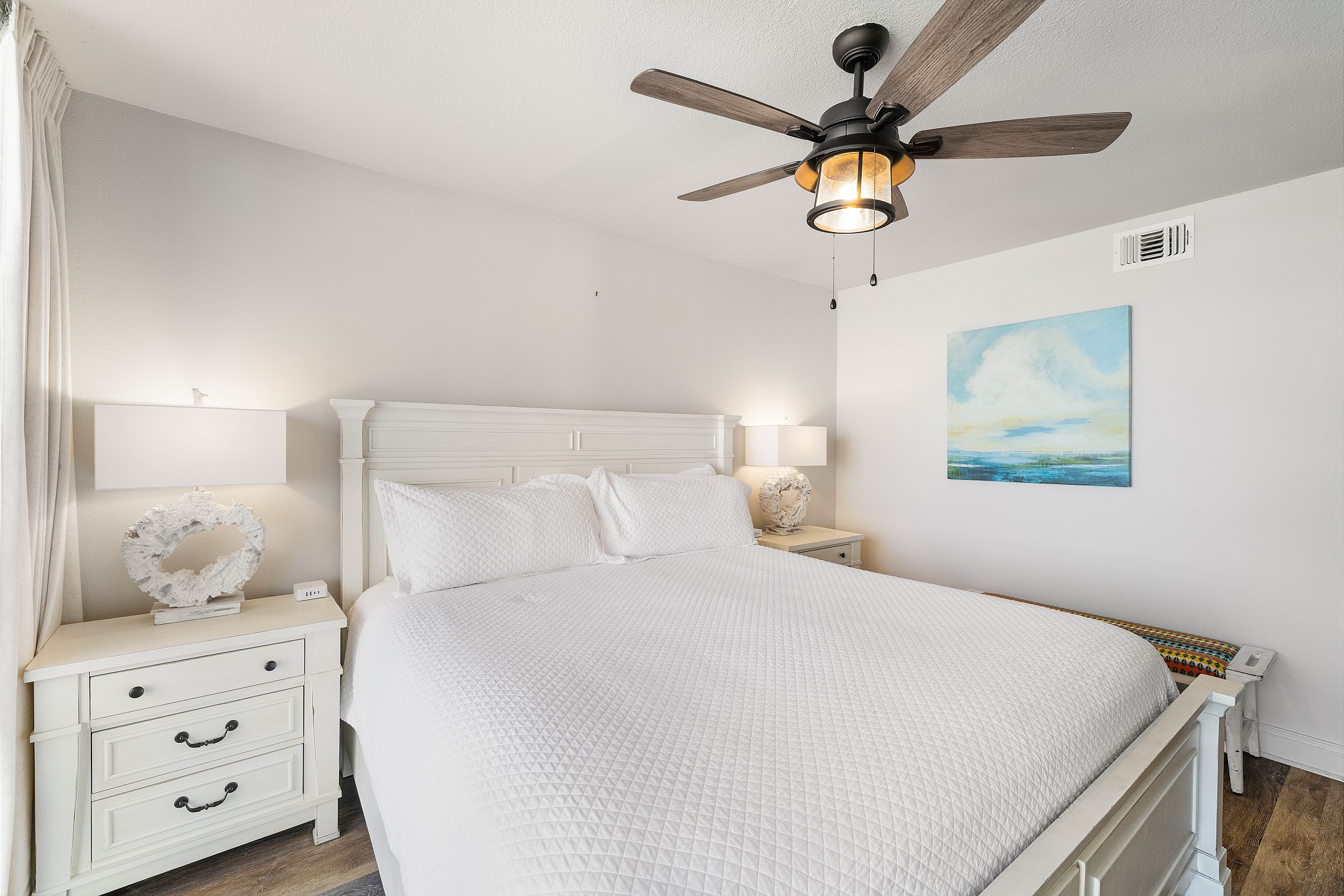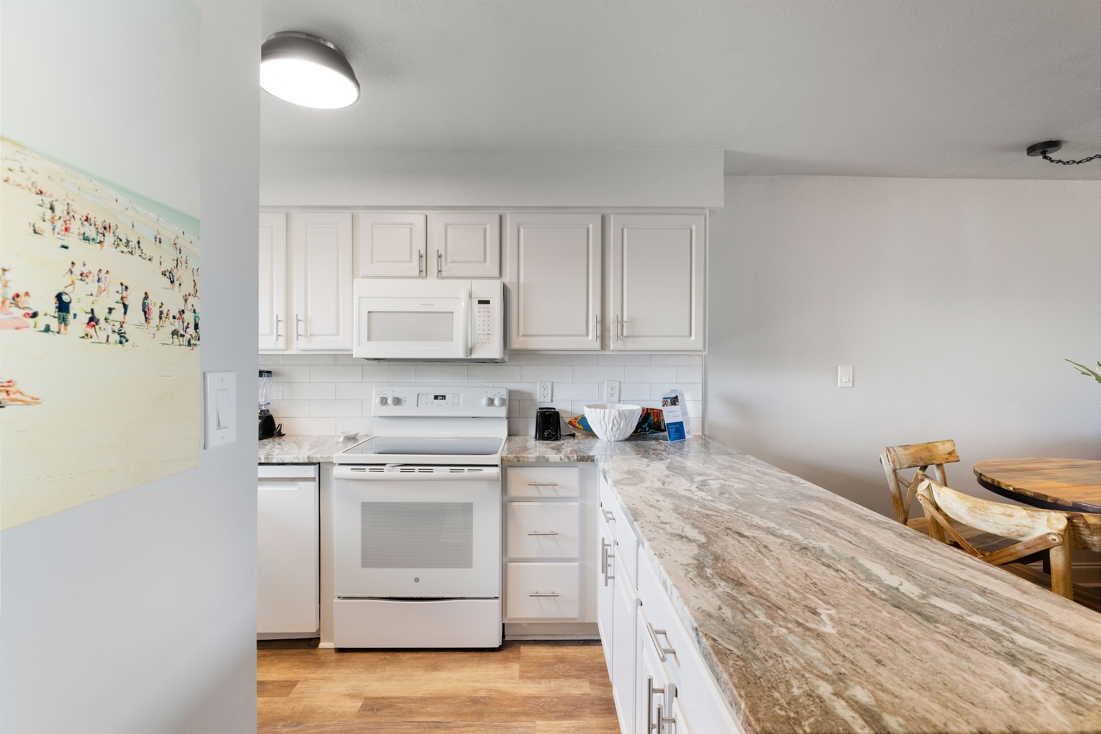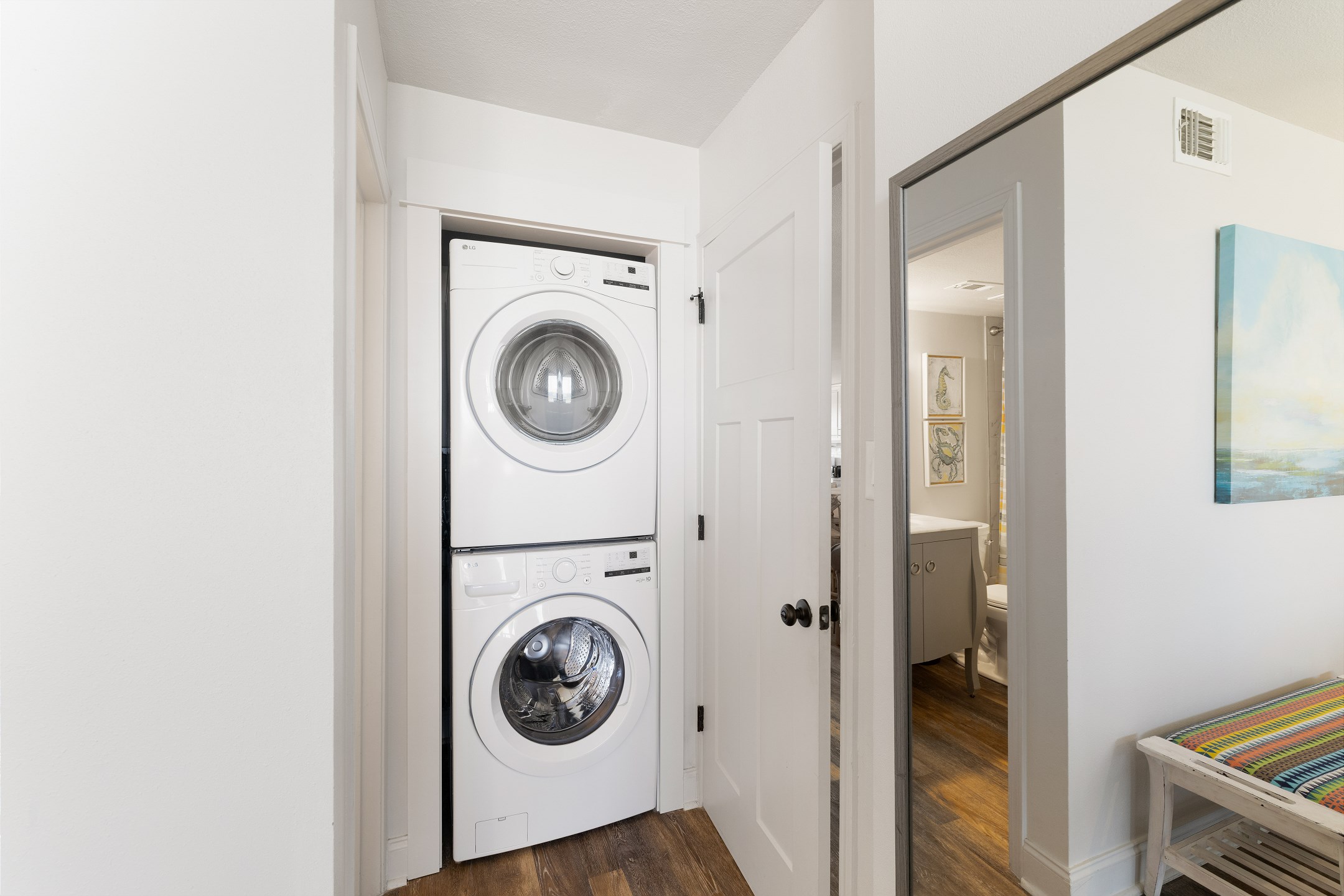 The primary bedroom is a serene retreat with a king size bed and direct access to the balcony for enjoying the coastal breeze. The second bedroom offers a full over queen bunk bed, making it a great option for kids or additional guests. For added convenience, this unit also includes a full size washer and dryer.
