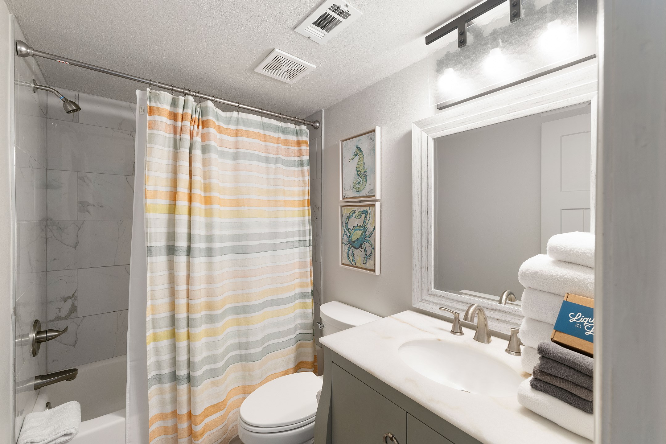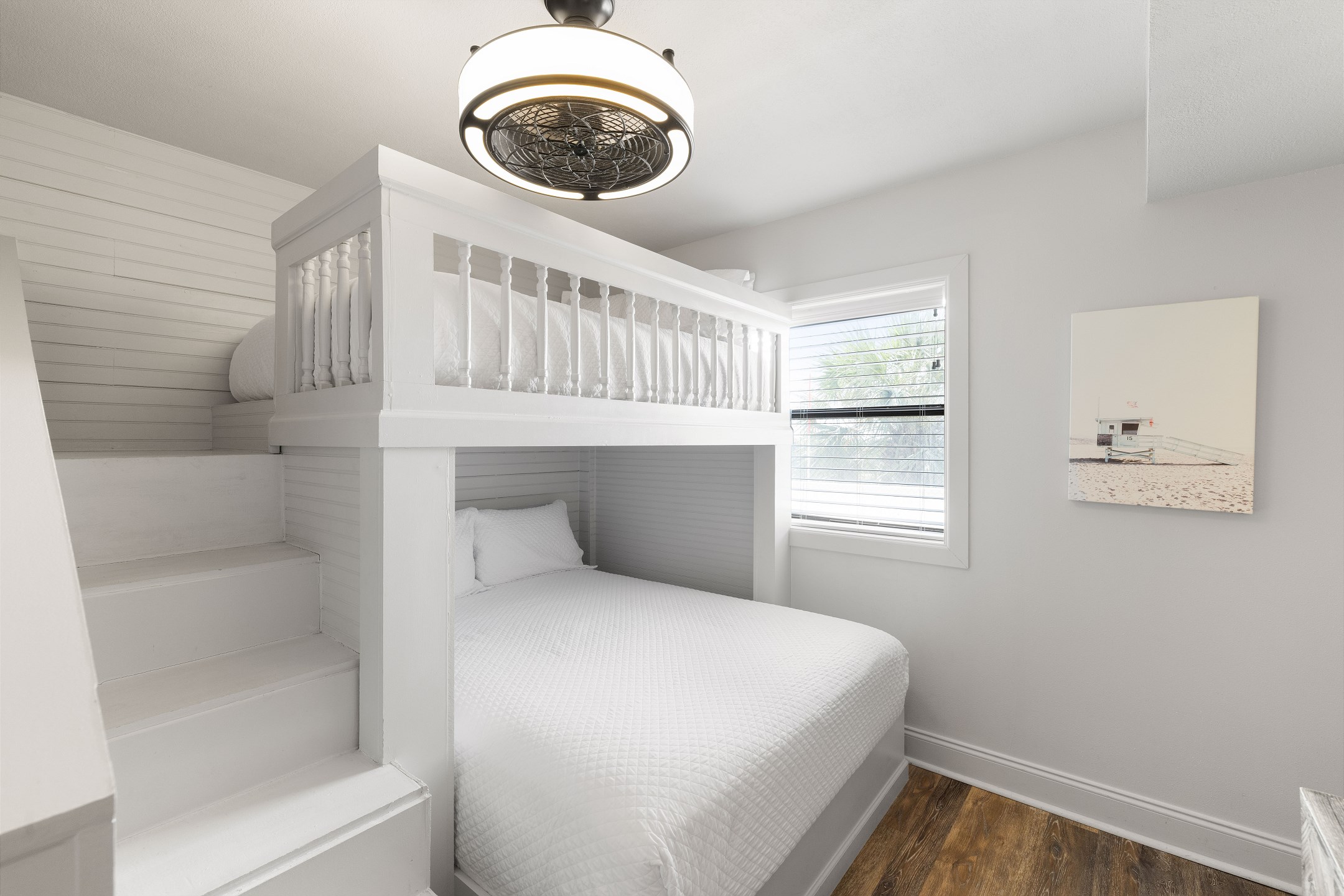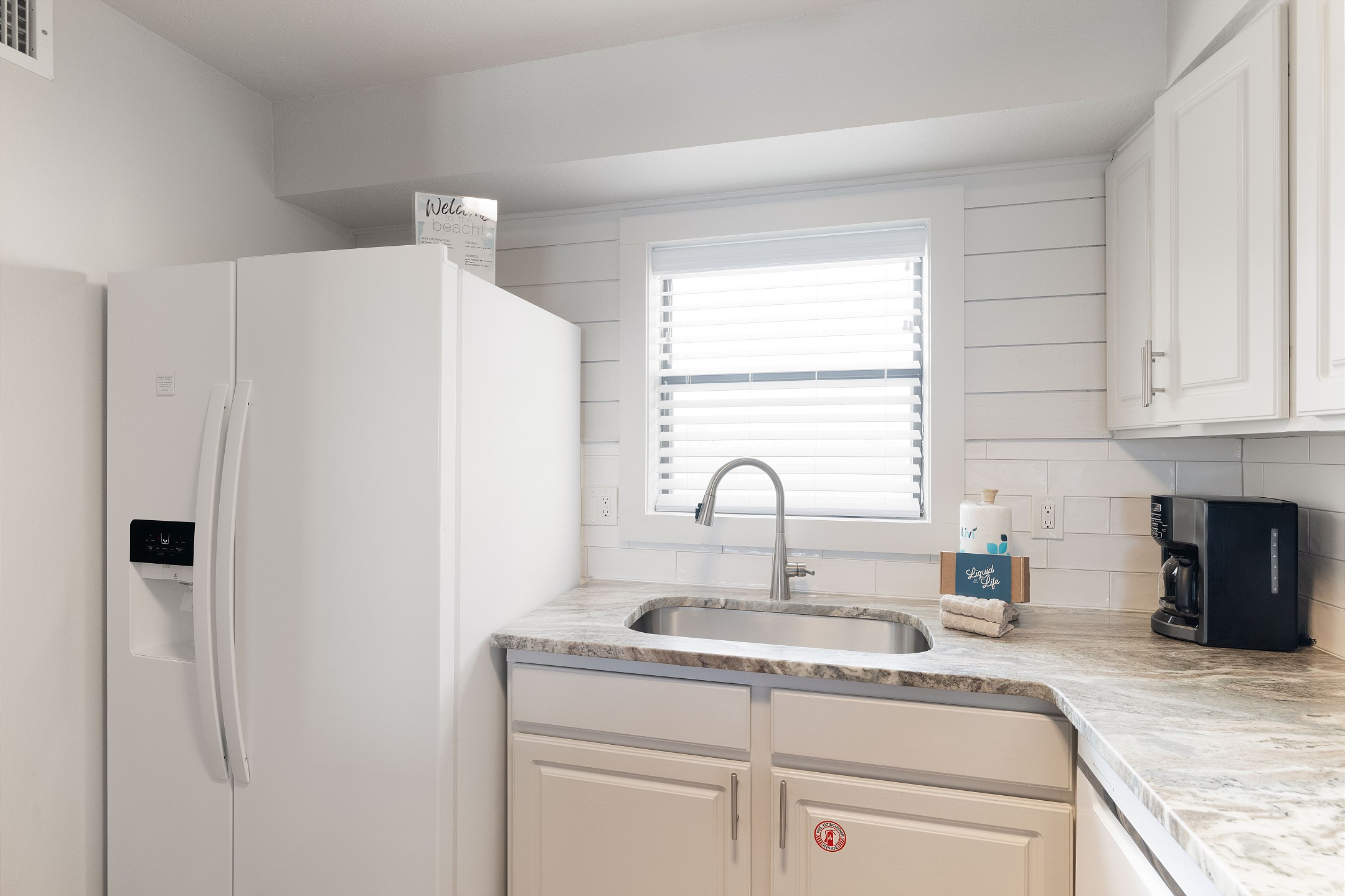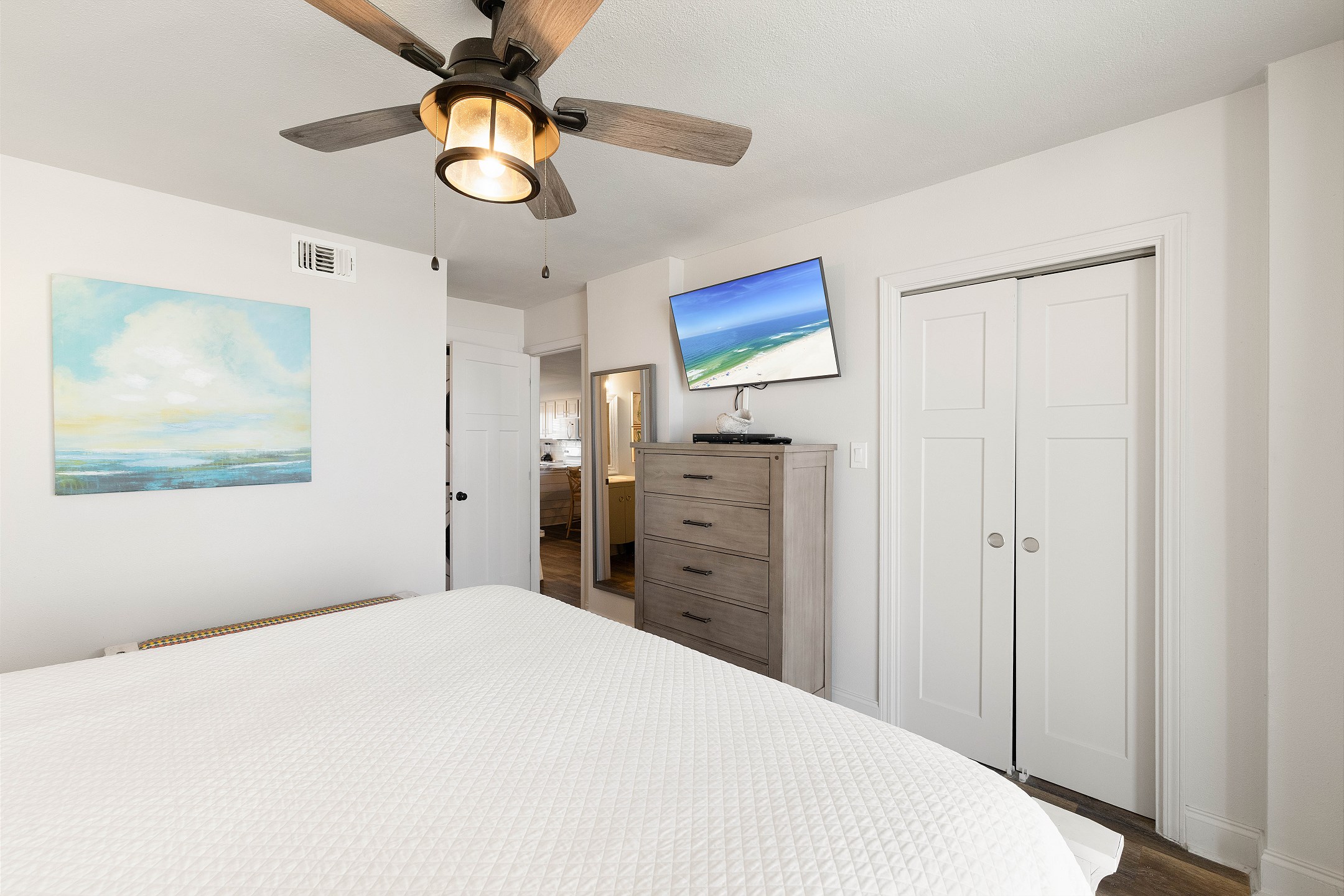 The primary bedroom is a serene retreat with a king size bed and direct access to the balcony for enjoying the coastal breeze. The second bedroom offers a full over queen bunk bed, making it a great option for kids or additional guests. For added convenience, this unit also includes a full size washer and dryer.