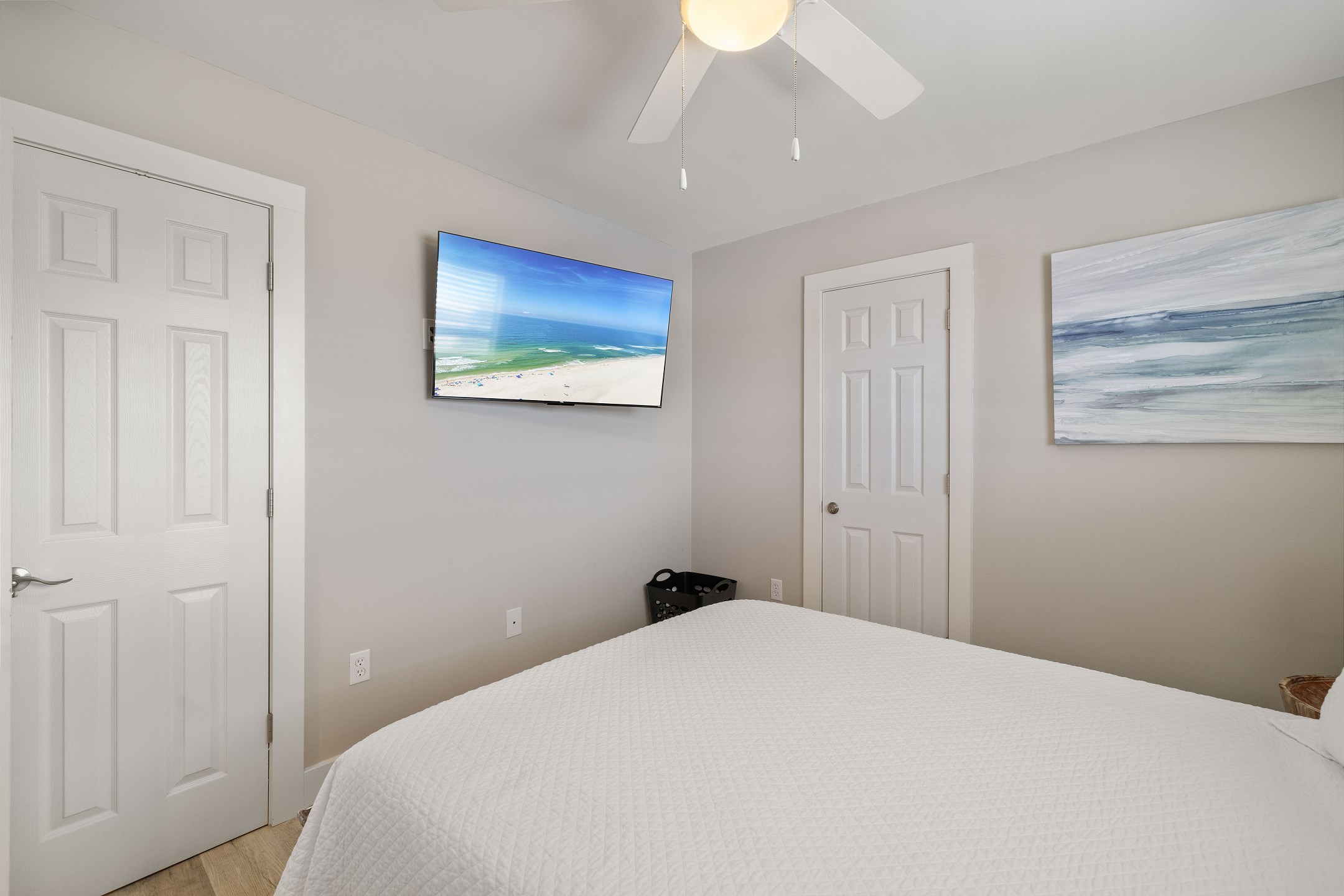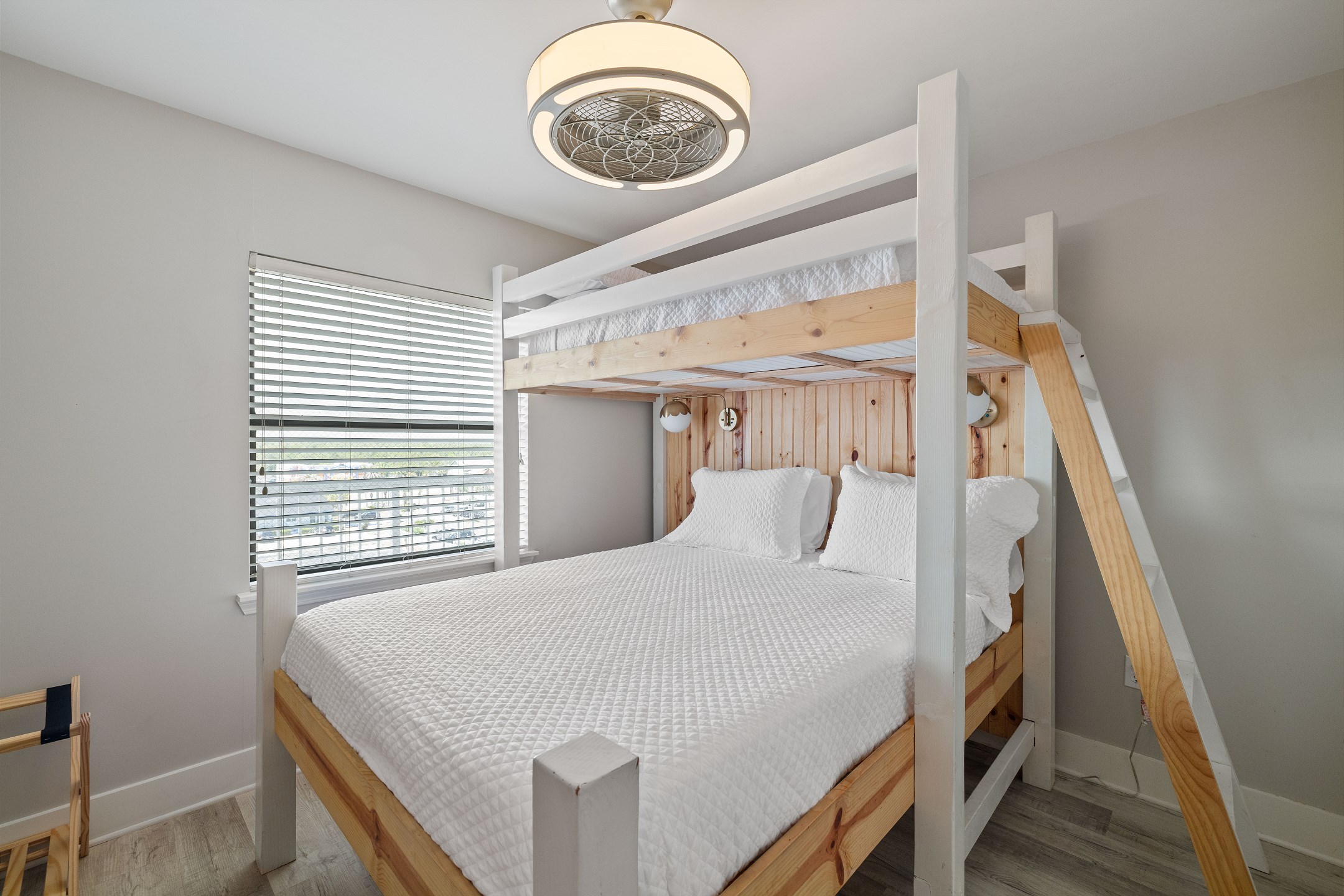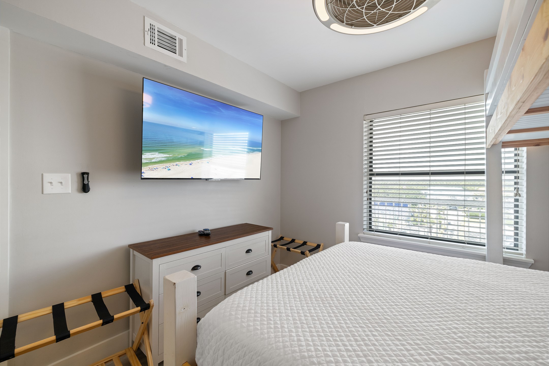 The spacious primary bedroom offers a king bed, private balcony access, and an ensuite bathroom with a beautifully tiled walk-in shower. The second bedroom features a cozy queen bed and its own ensuite bathroom, while the third bedroom includes a twin-over-queen bunk bed, making it ideal for kids or additional guests.