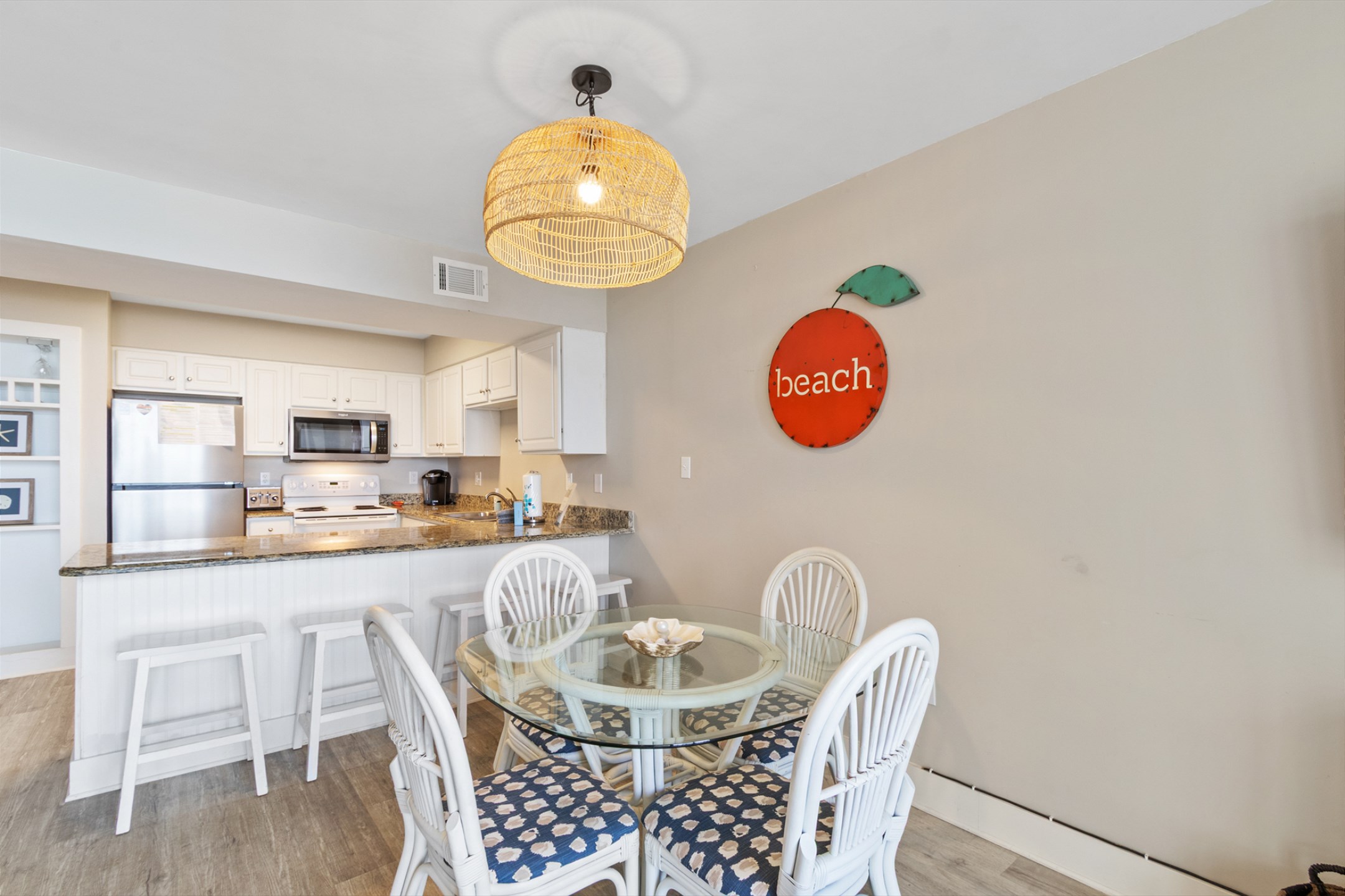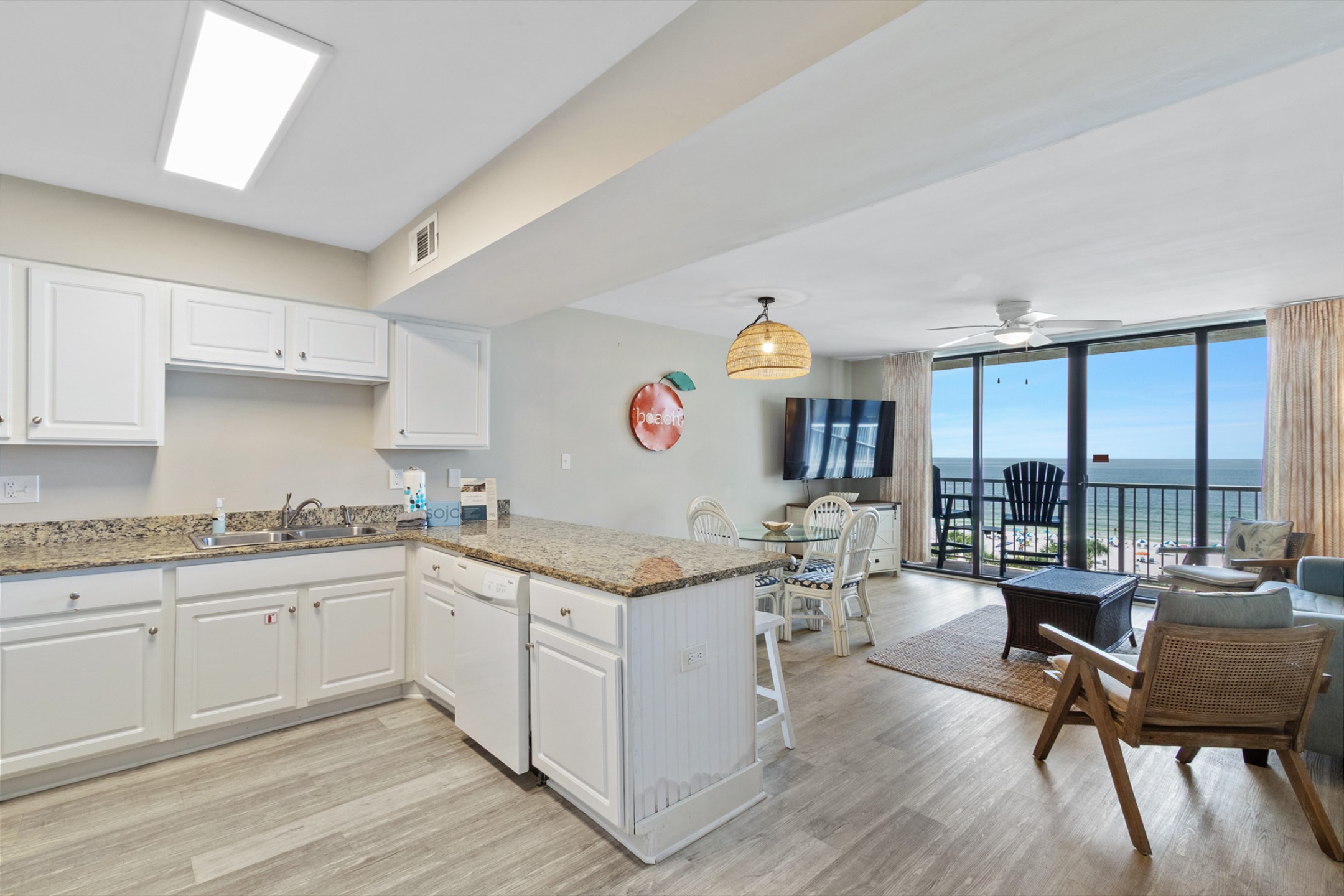 The bright and airy living room features floor-to-ceiling windows that open up to a private balcony overlooking the Gulf, creating the perfect spot to enjoy morning sunrises or evening sea breezes. The kitchen is fully equipped with stainless steel appliances, granite countertops, and plenty of space to prepare meals, with an adjacent dining table and additional barstool seating for casual dining.