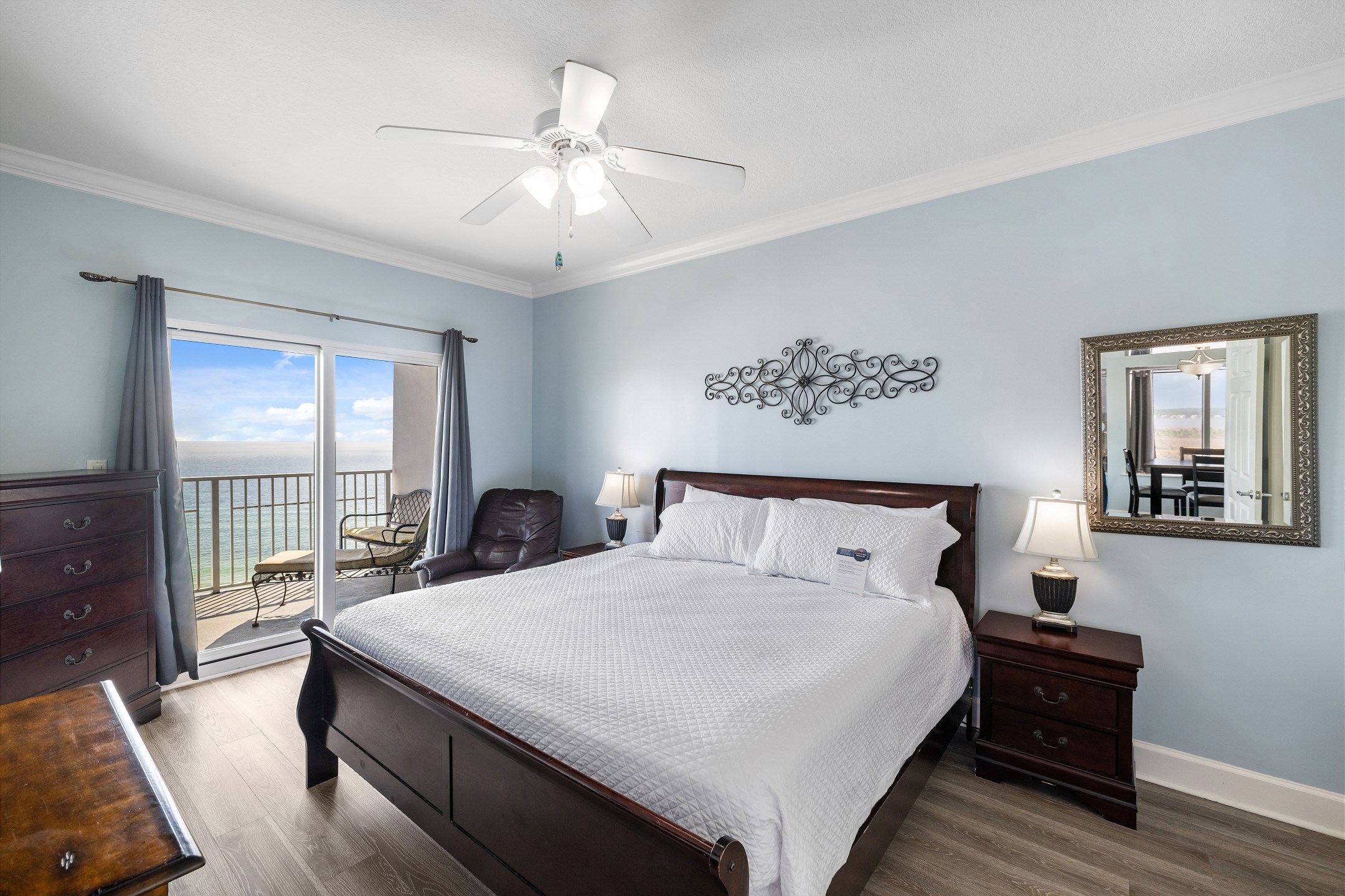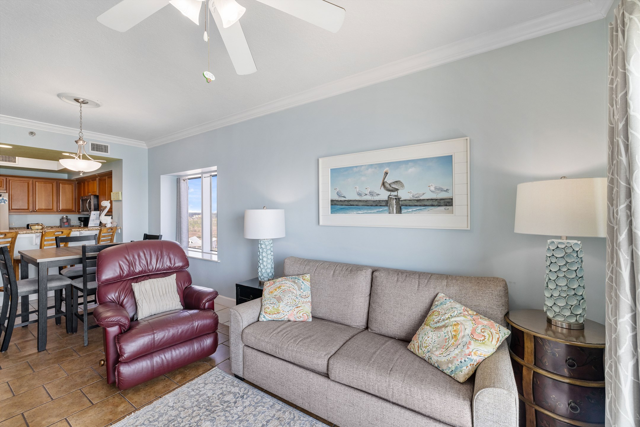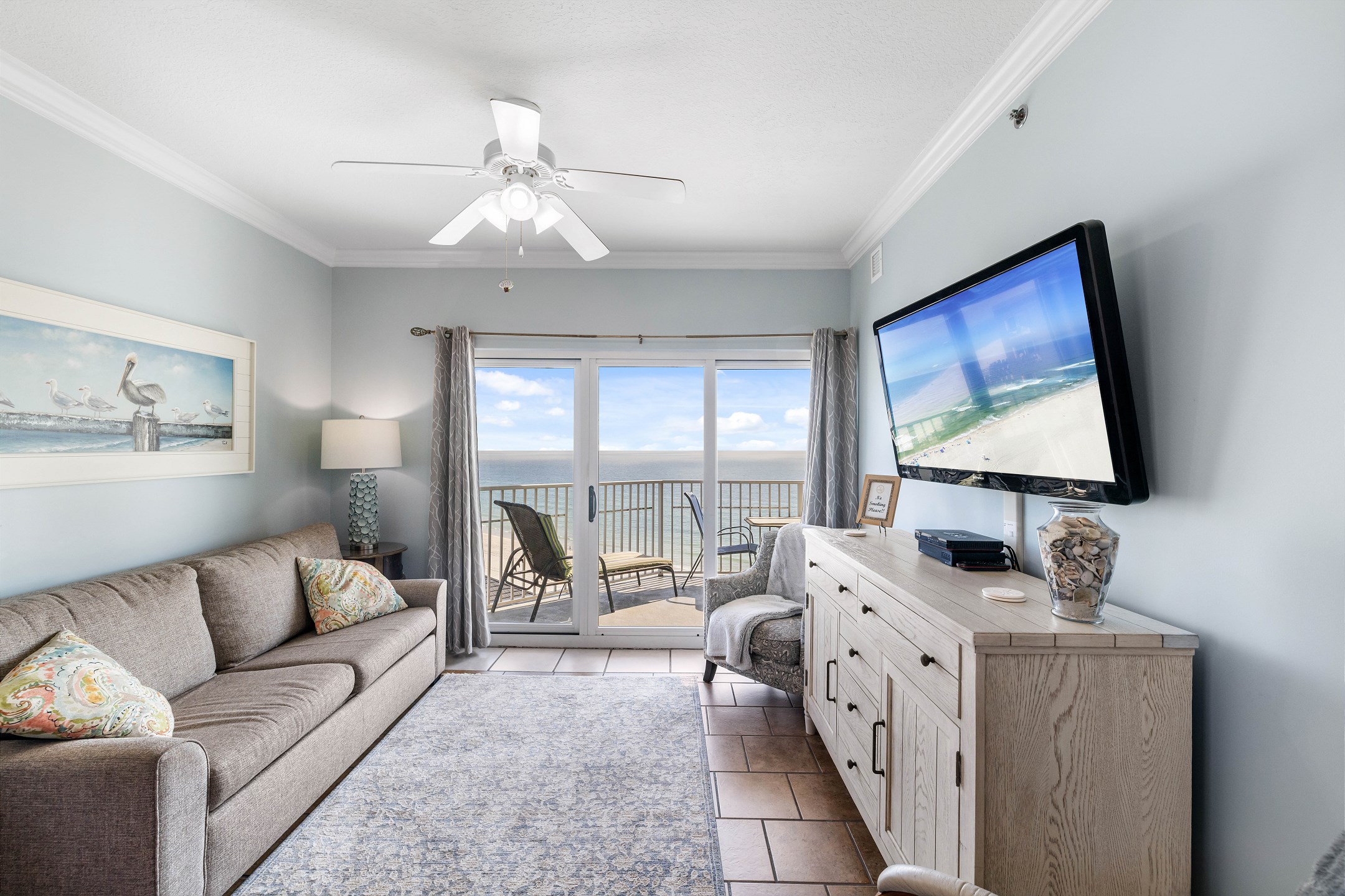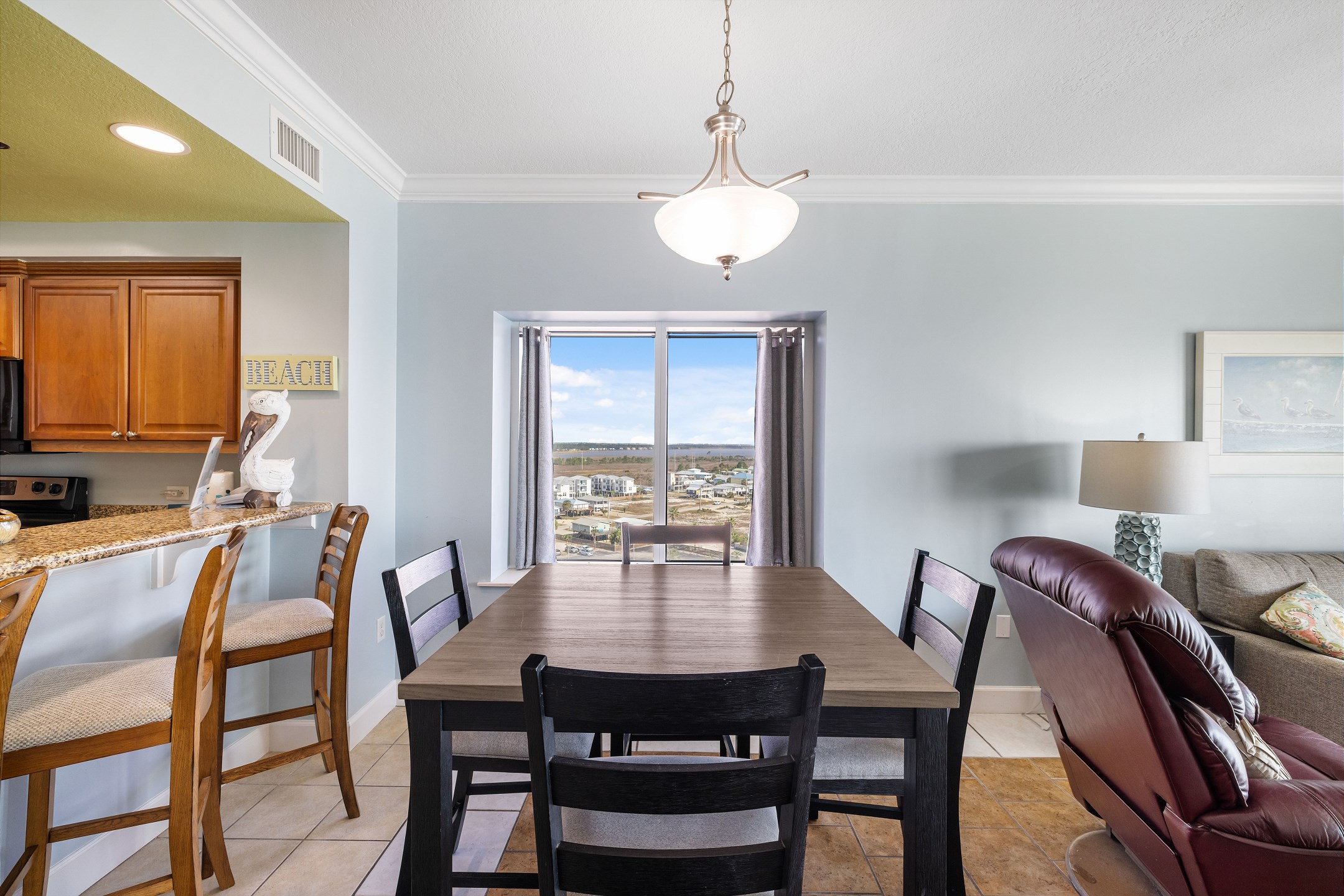 The spacious living room offers plenty of comfortable seating and opens directly onto your private balcony overlooking the Gulf. It is the perfect spot to sip your morning coffee, watch the waves roll in, or relax after a day of fun in the sun.