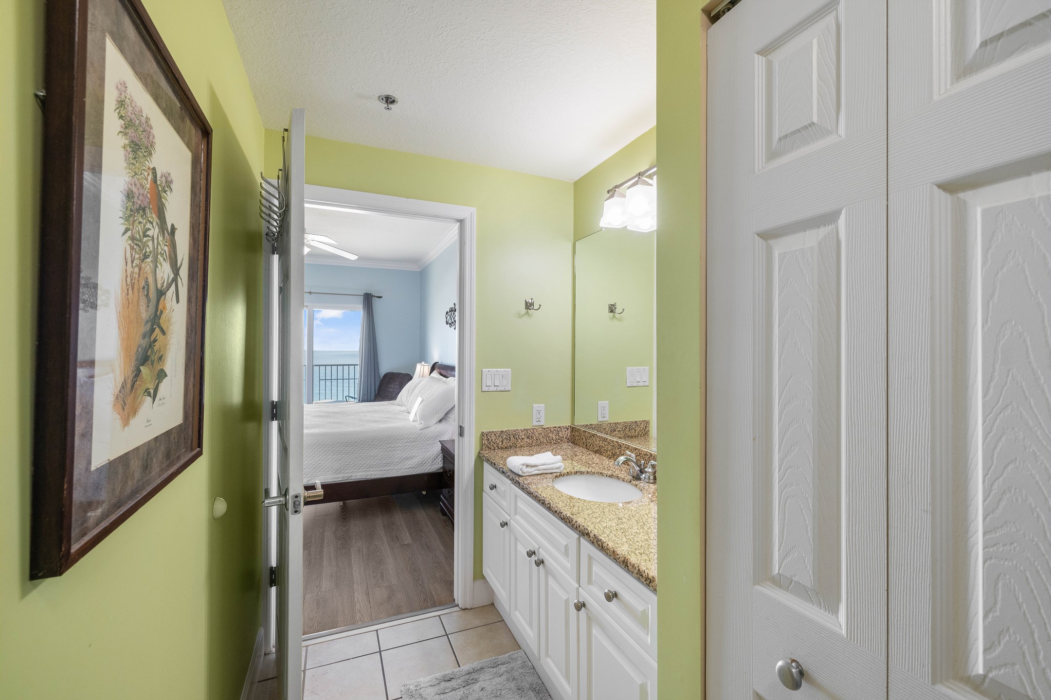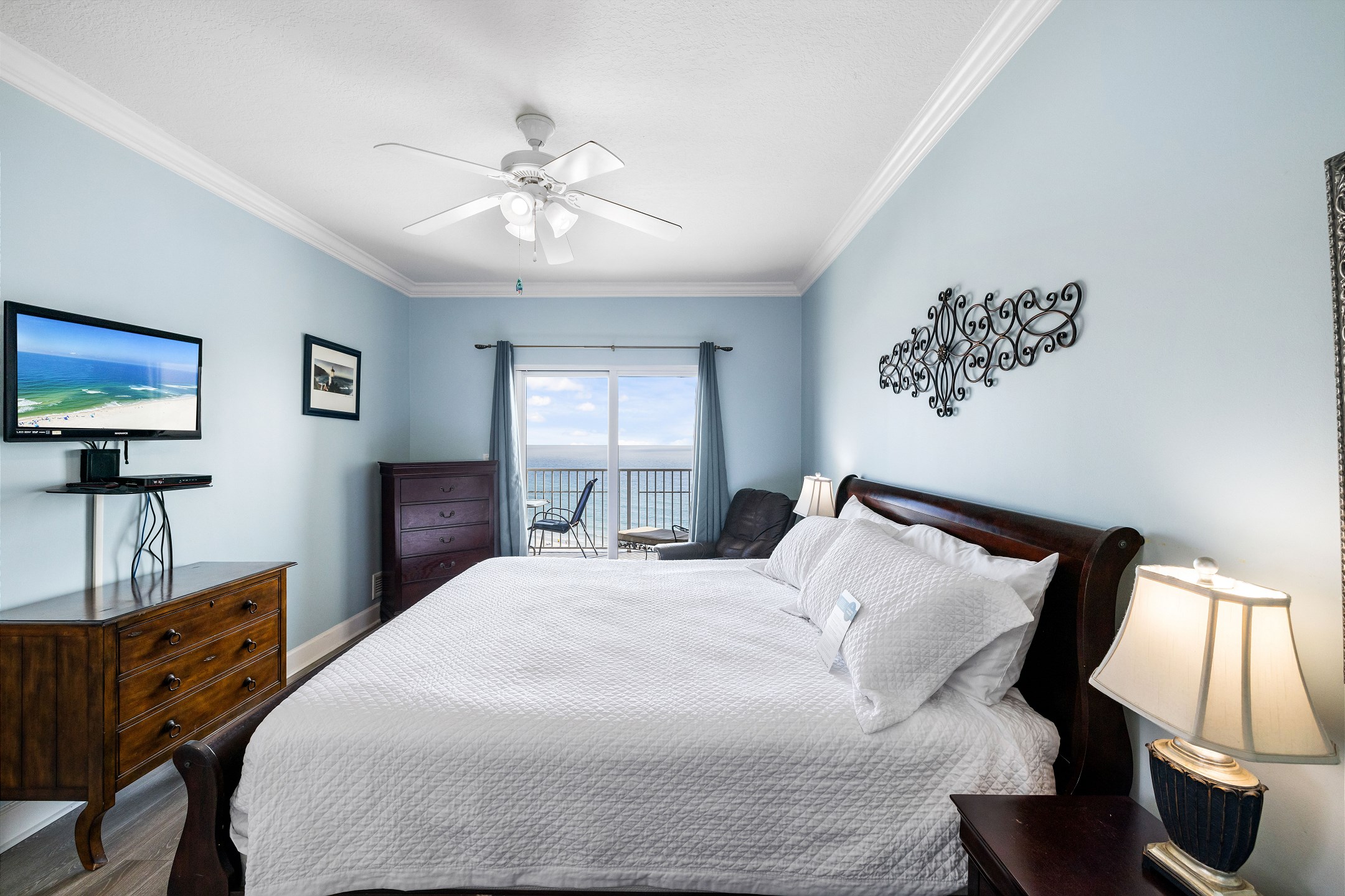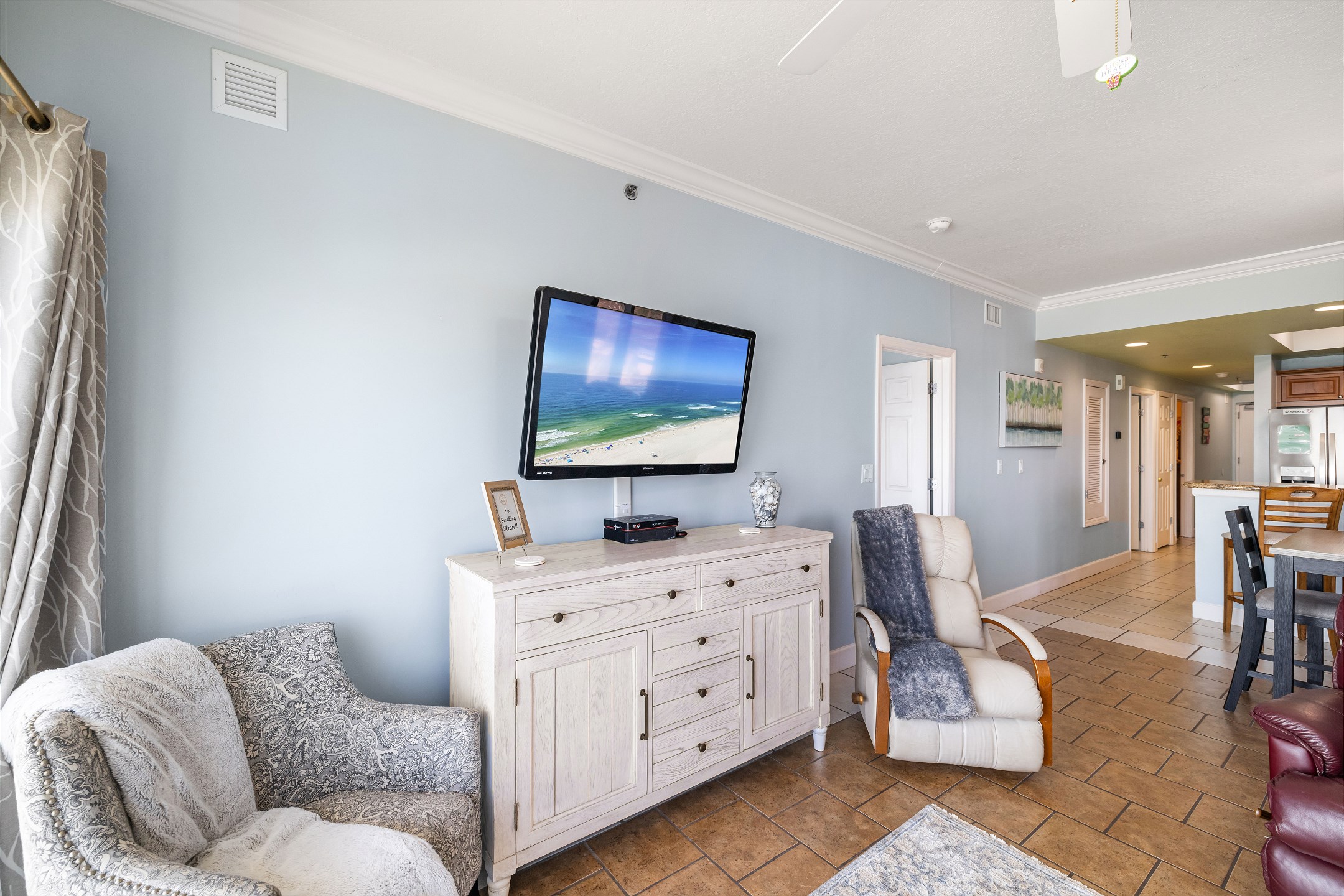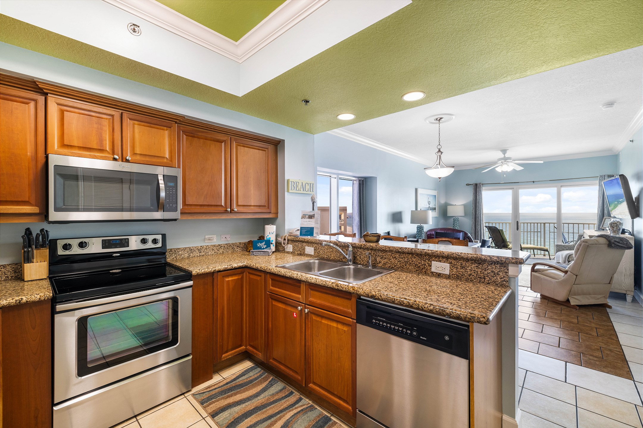The spacious living room offers plenty of comfortable seating and opens directly onto your private balcony overlooking the Gulf. It is the perfect spot to sip your morning coffee, watch the waves roll in, or relax after a day of fun in the sun.
