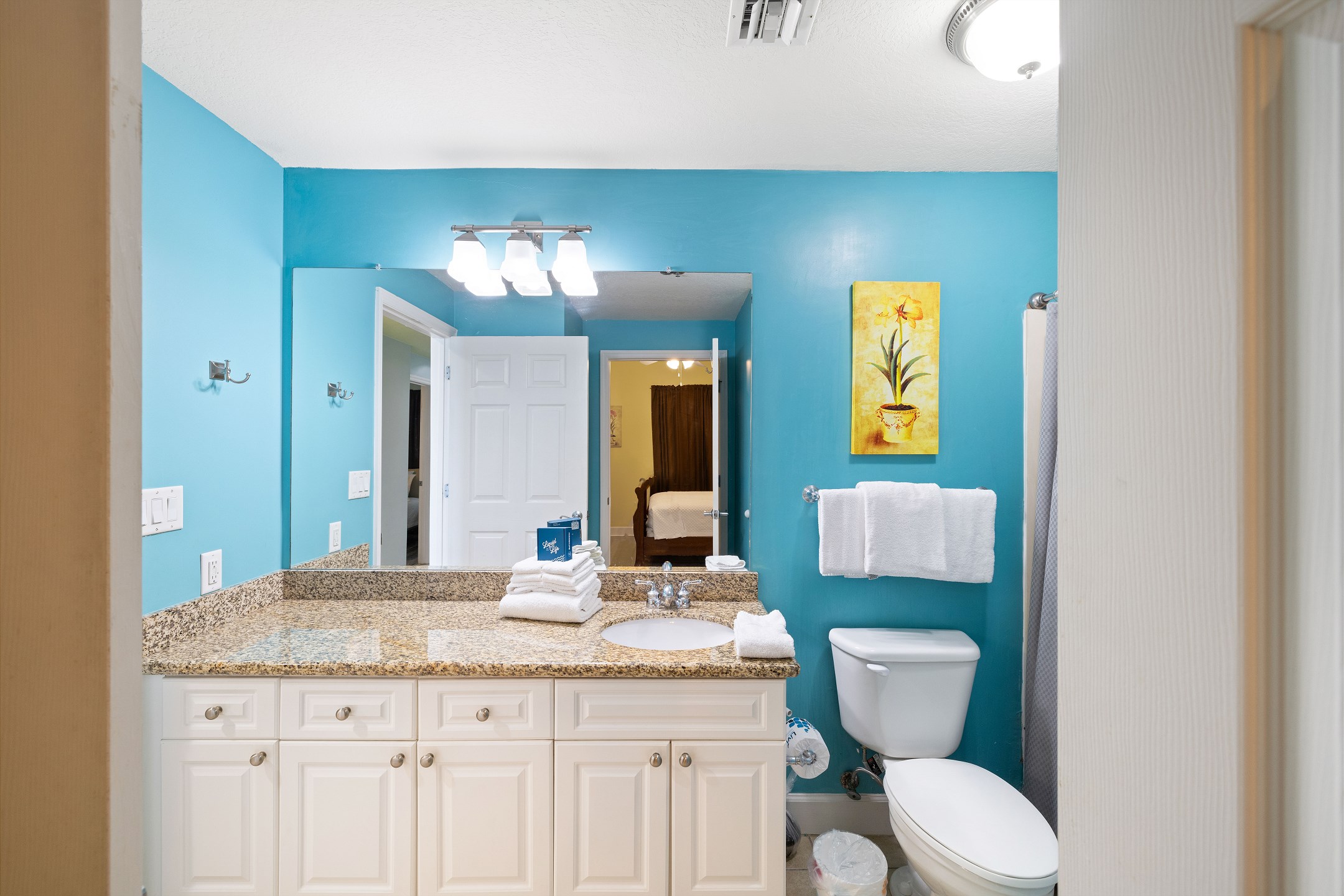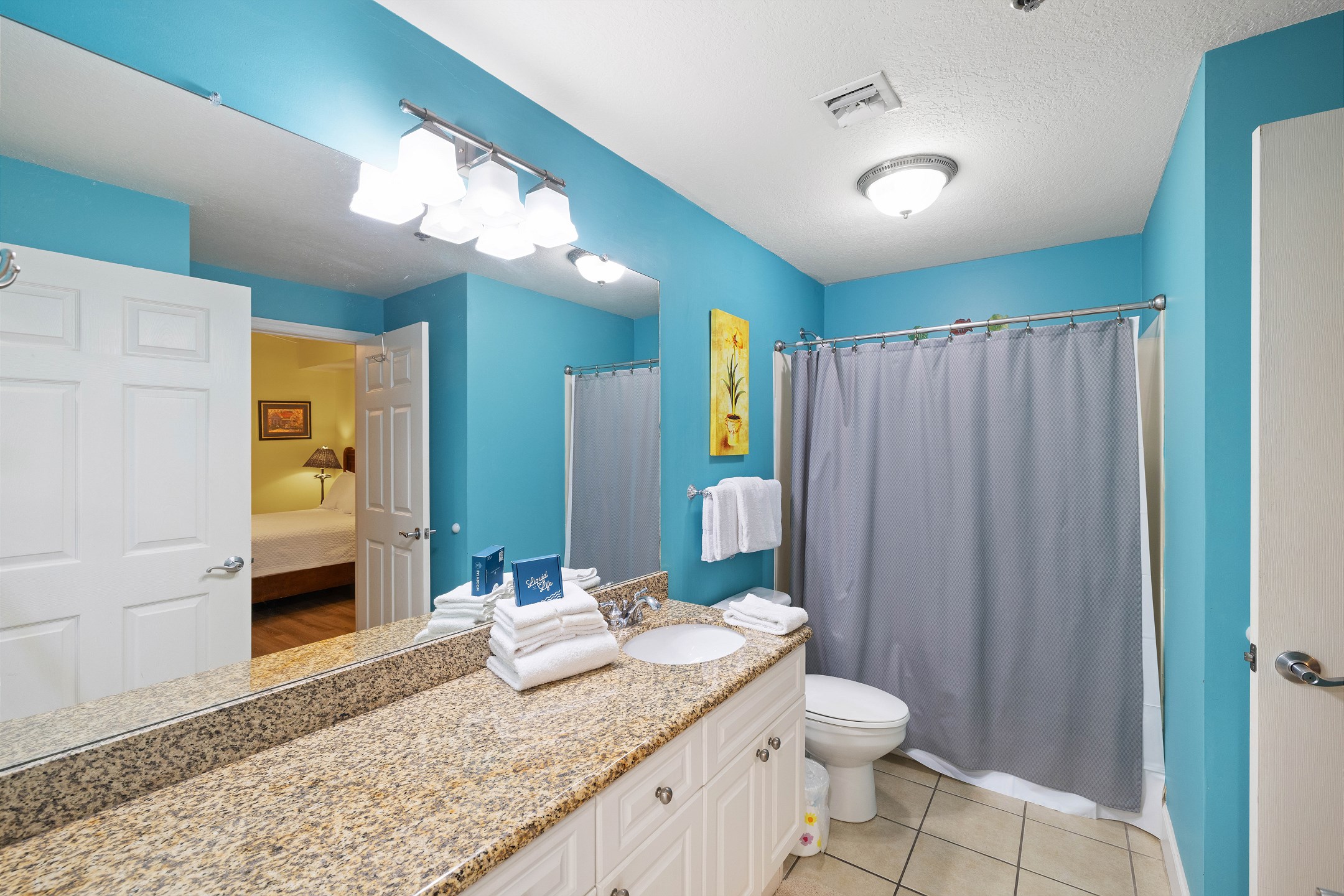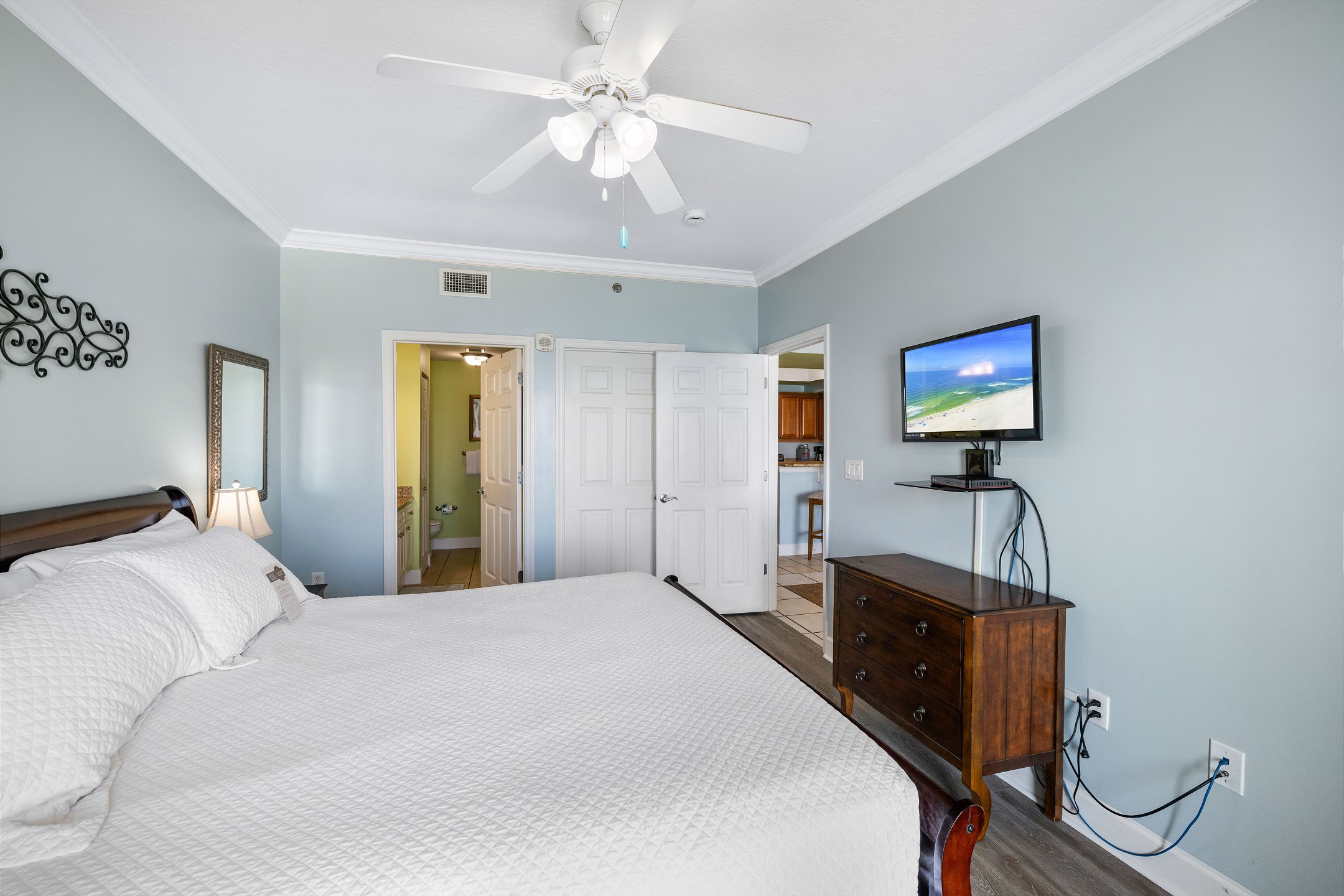 The primary bedroom is a peaceful escape with a king bed, balcony access, and a private ensuite bathroom. The second bedroom features a queen bed and convenient ensuite access to the hall bathroom. The third bedroom also includes a queen bed, providing comfortable accommodations for everyone. A sofa sleeper in the living room offers extra sleeping space when needed.