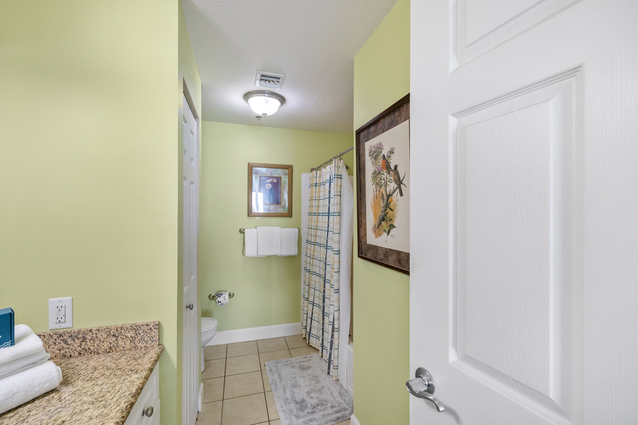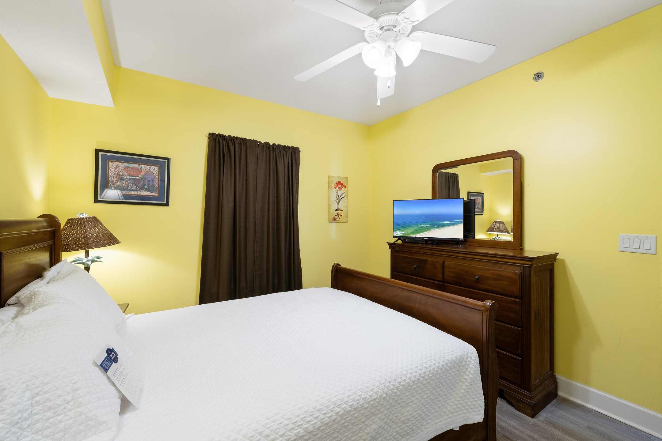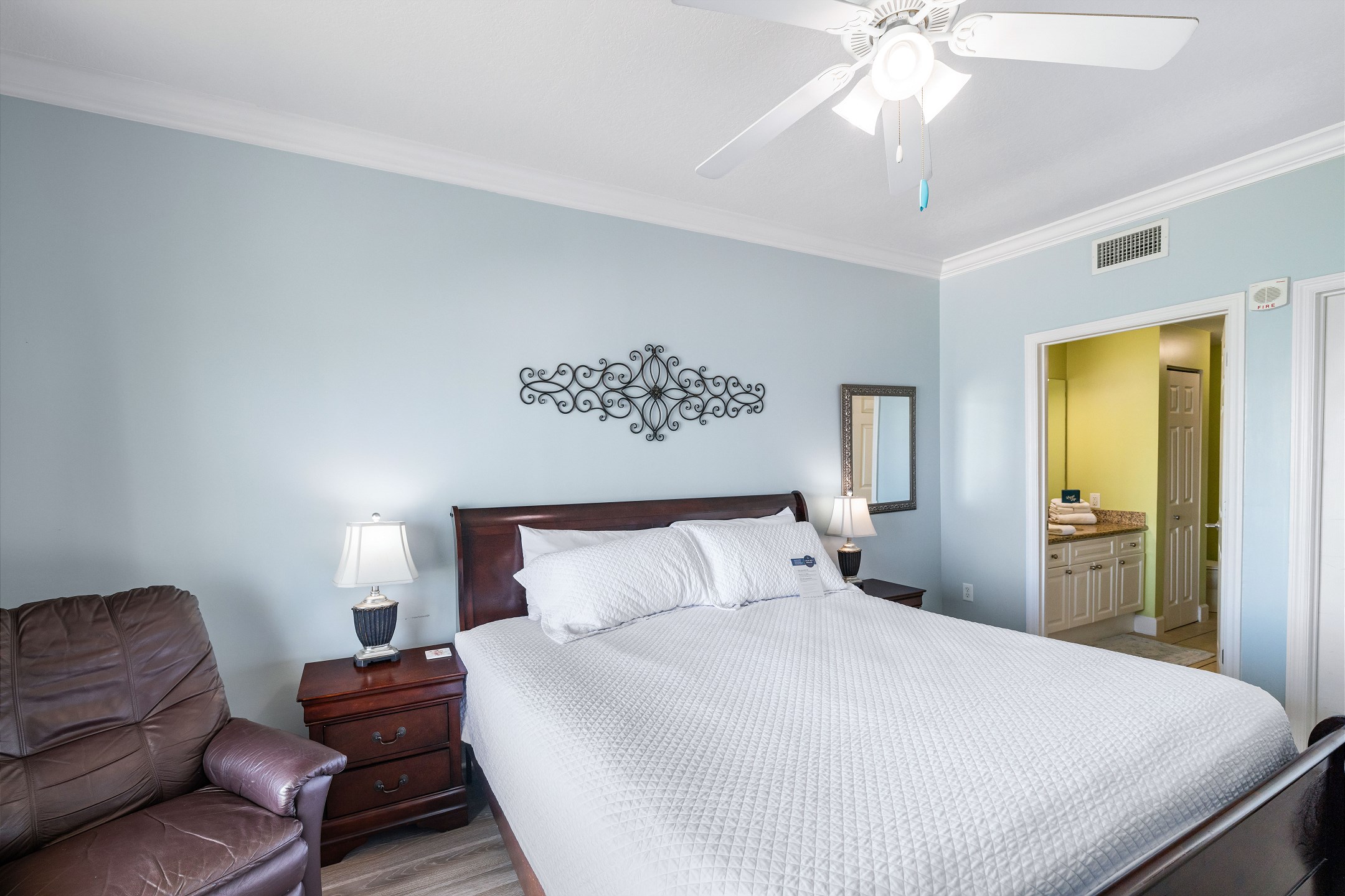 The primary bedroom is a peaceful escape with a king bed, balcony access, and a private ensuite bathroom. The second bedroom features a queen bed and convenient ensuite access to the hall bathroom. The third bedroom also includes a queen bed, providing comfortable accommodations for everyone. A sofa sleeper in the living room offers extra sleeping space when needed.