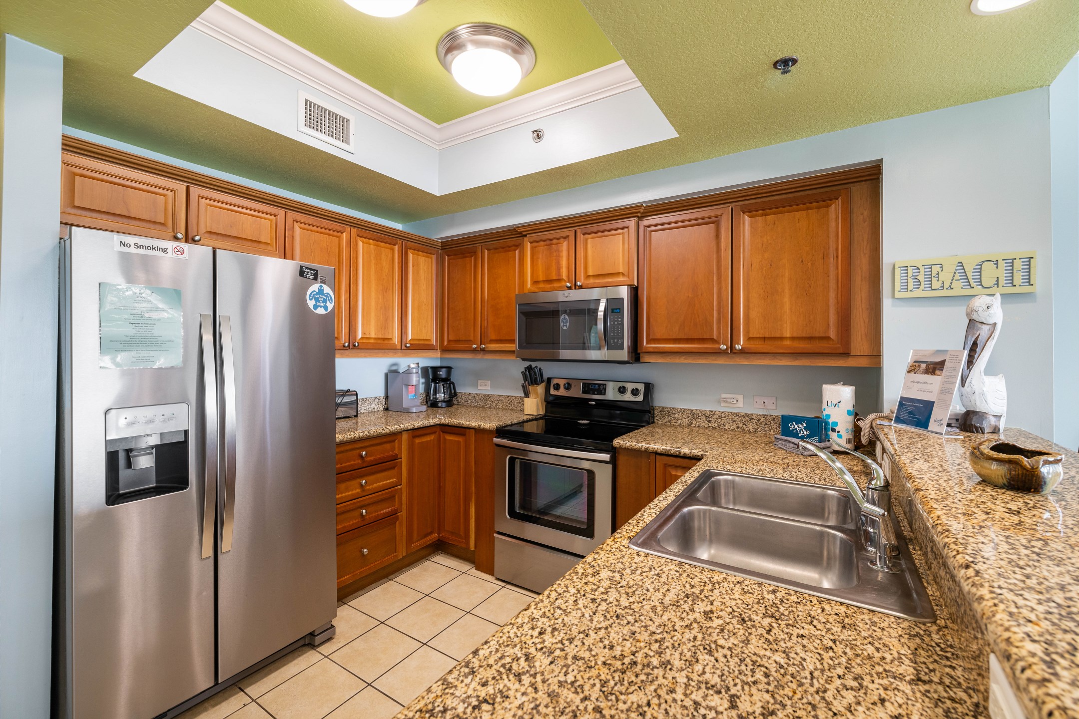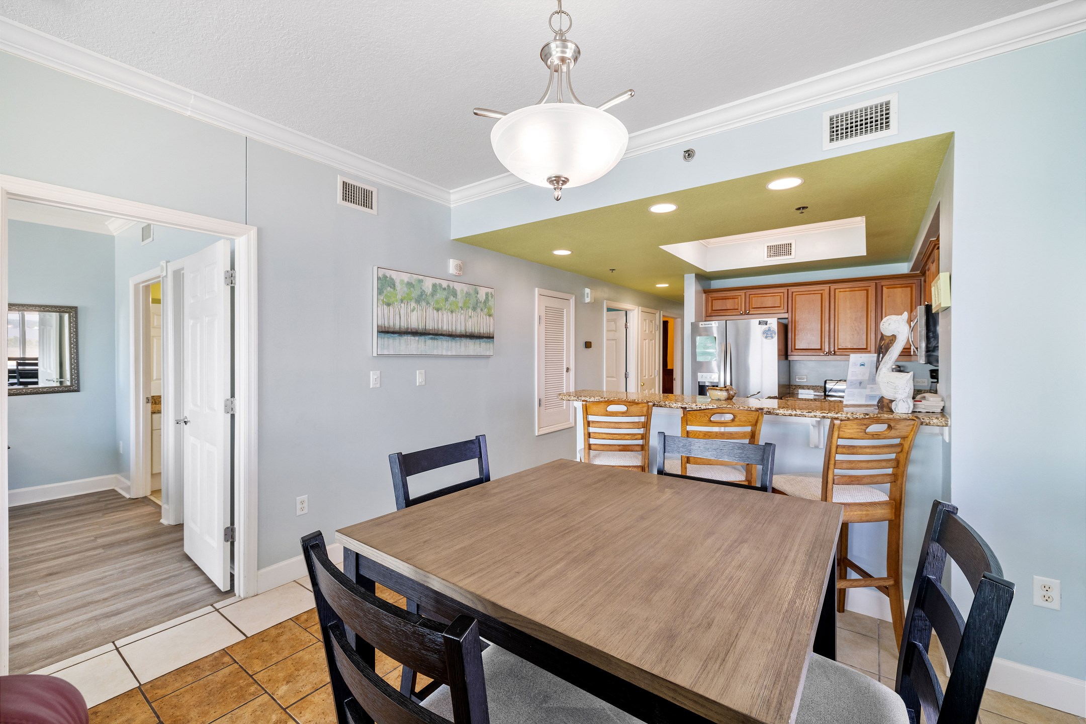 The fully equipped kitchen features stainless steel appliances, granite countertops, and a dining table, giving you everything you need to enjoy meals together with family and friends.